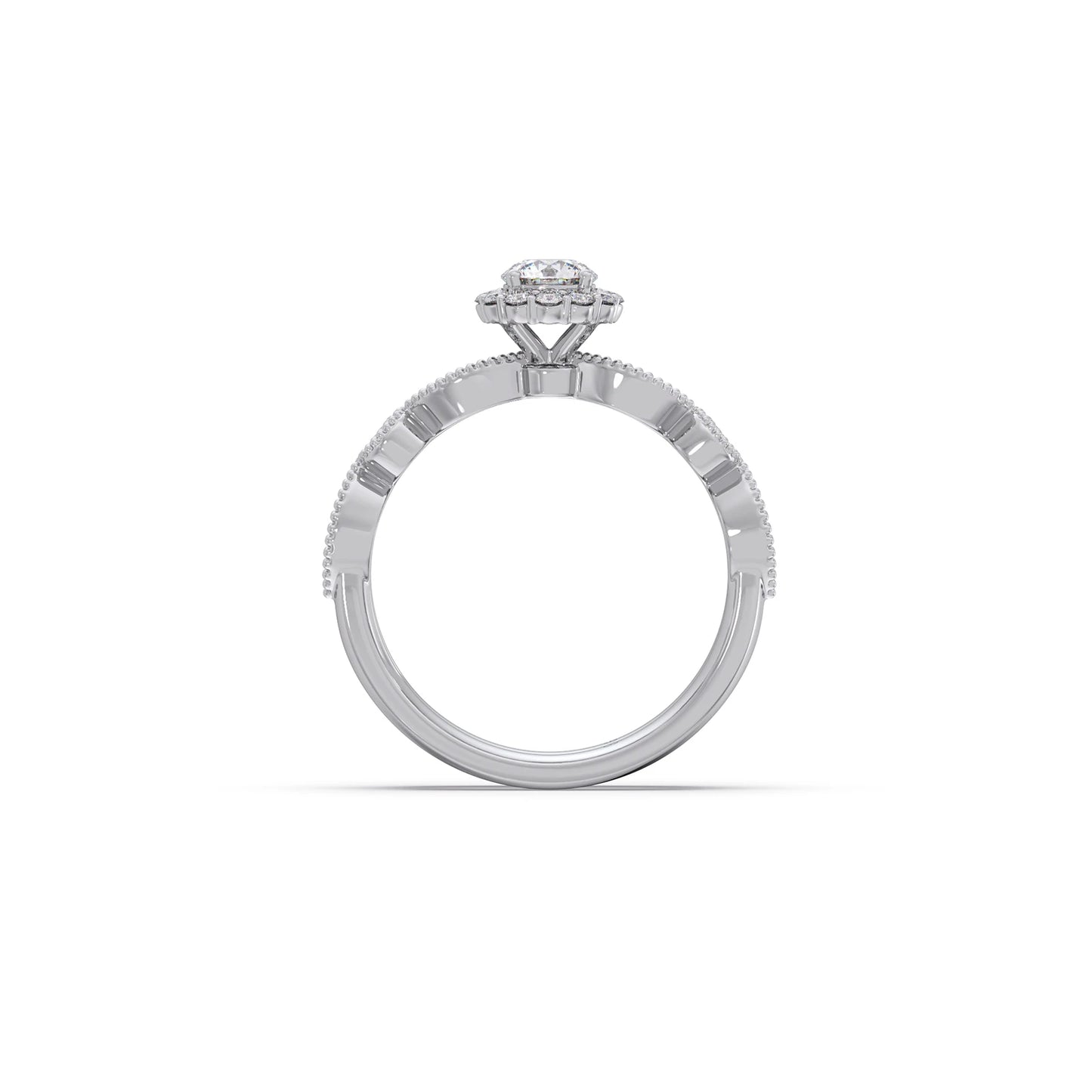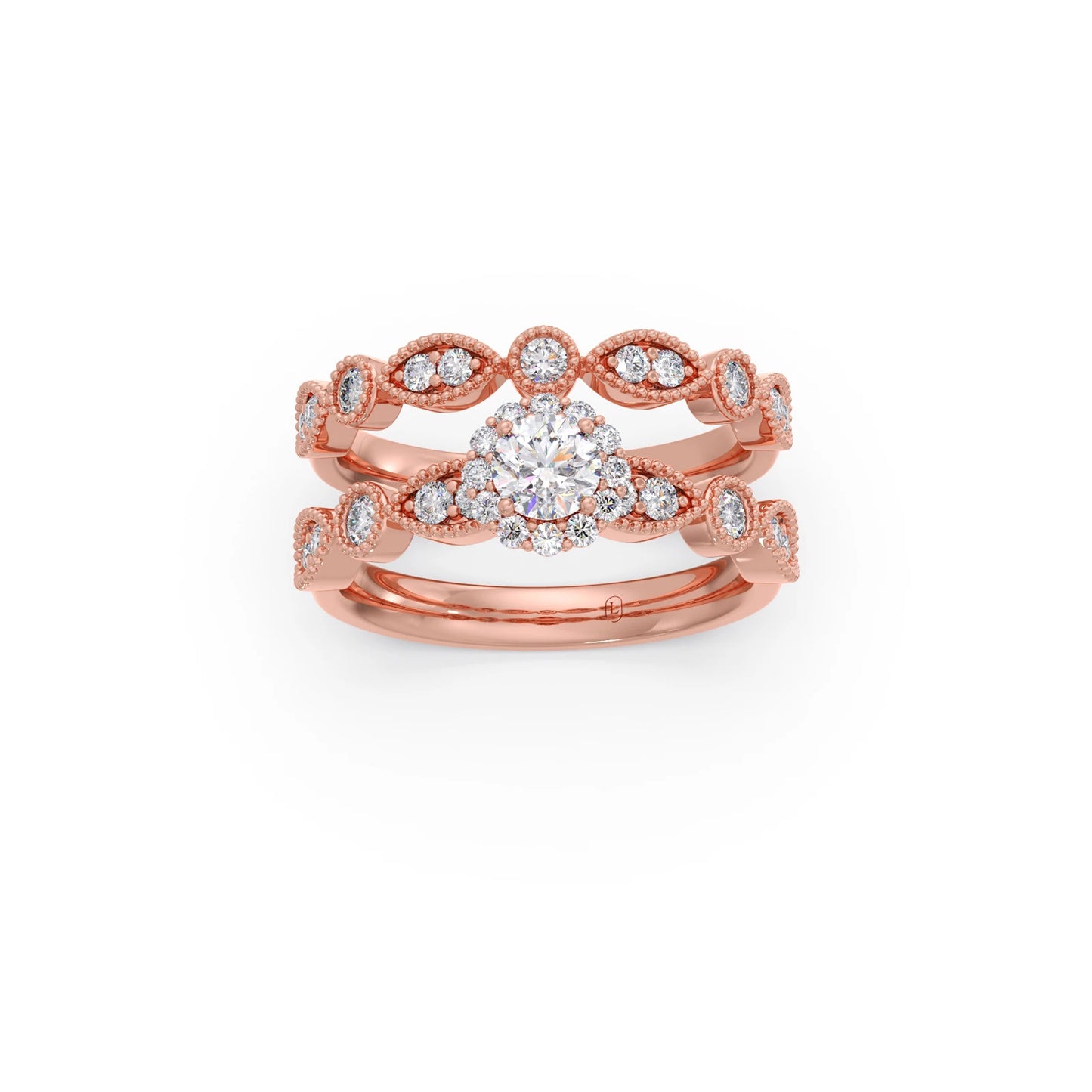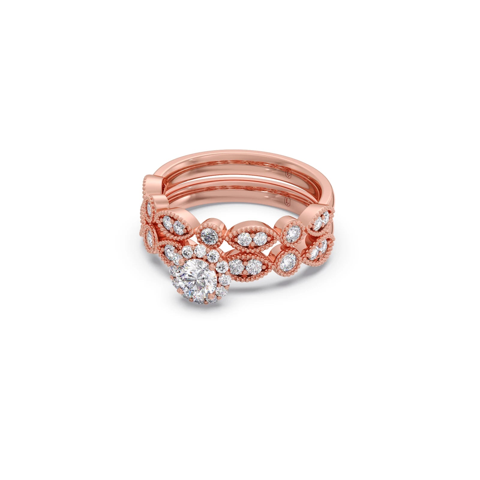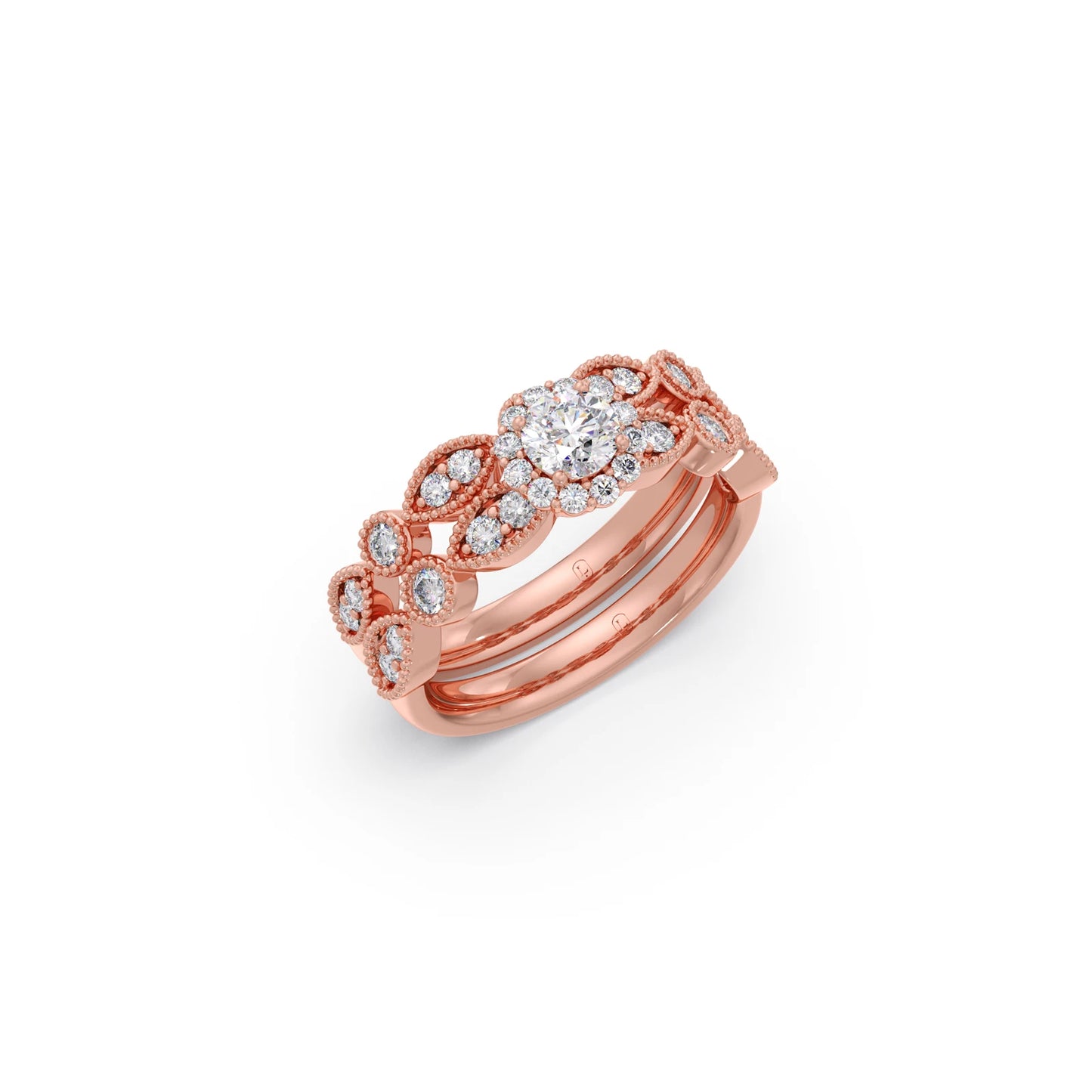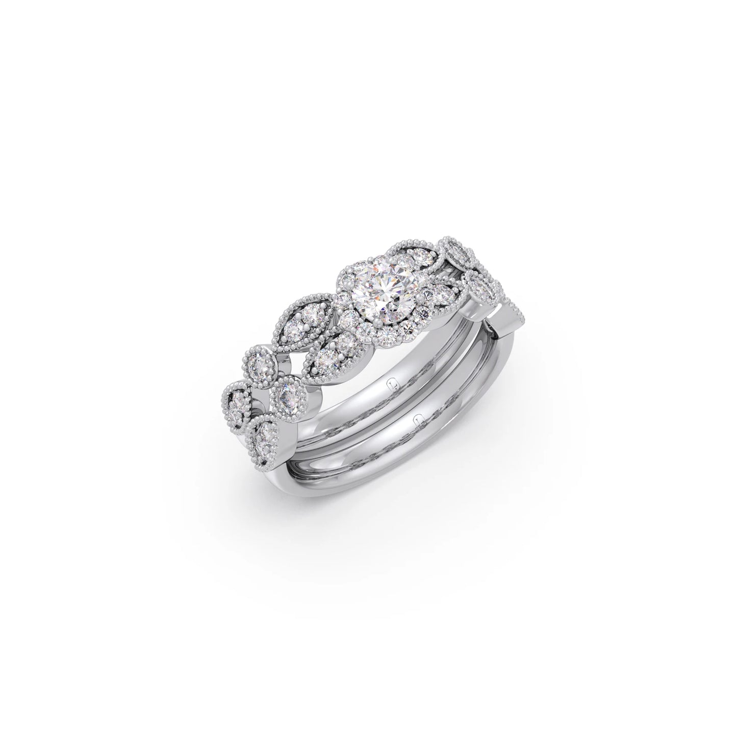 This charming set features a classic round solitaire accompanied by a delicate floral-inspired band with diamond accents. Designed for stacking, it offers a touch of whimsical elegance and personalized style.