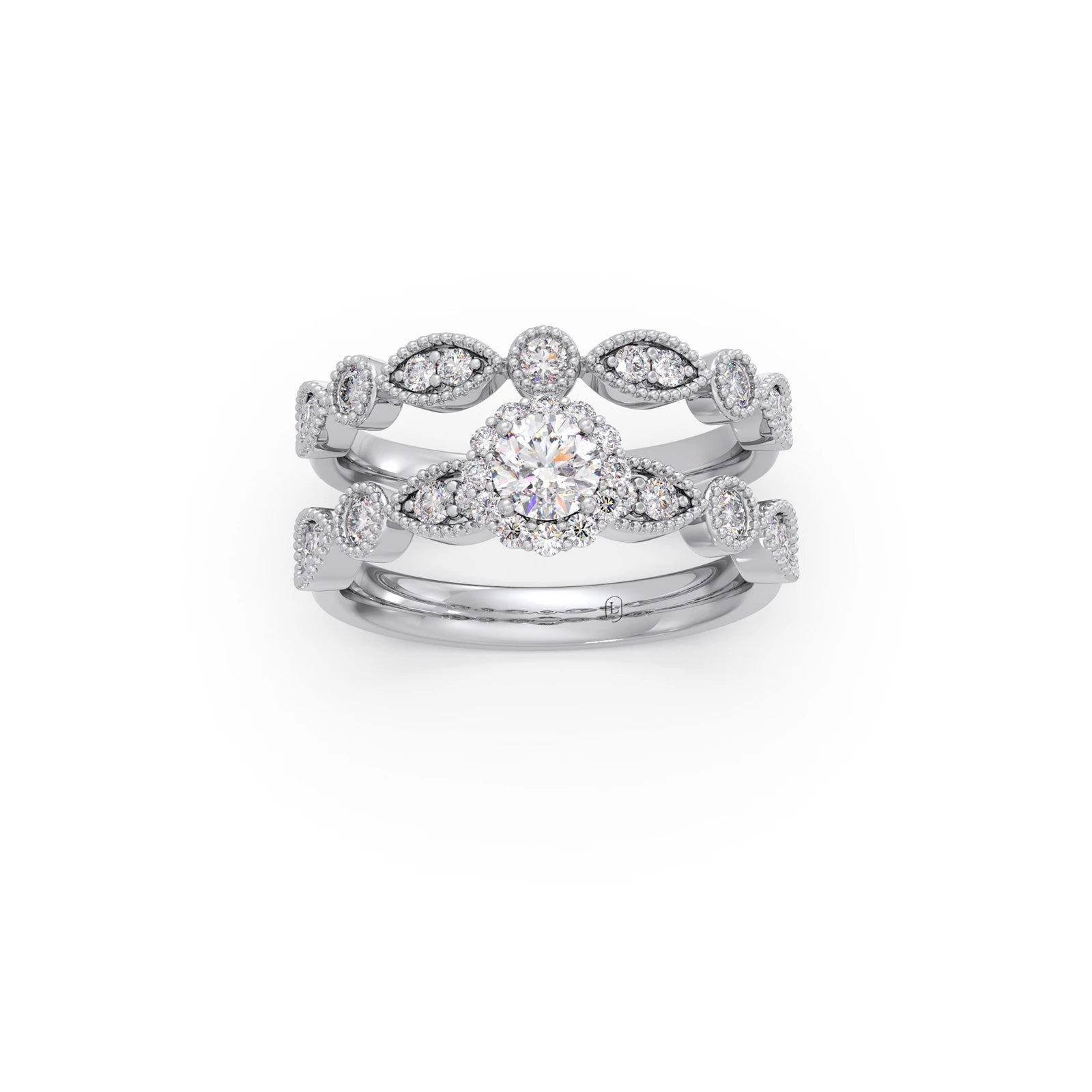 Round Solitaire with Floral Diamond Accent Stackable Ring Set