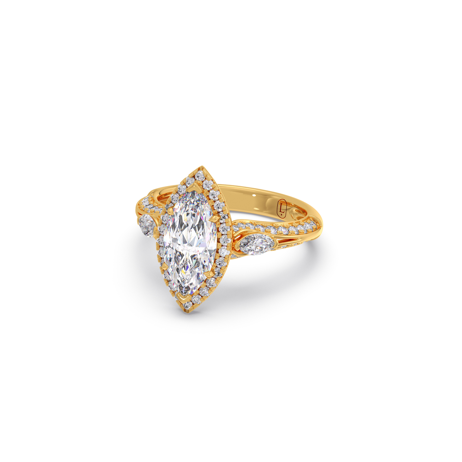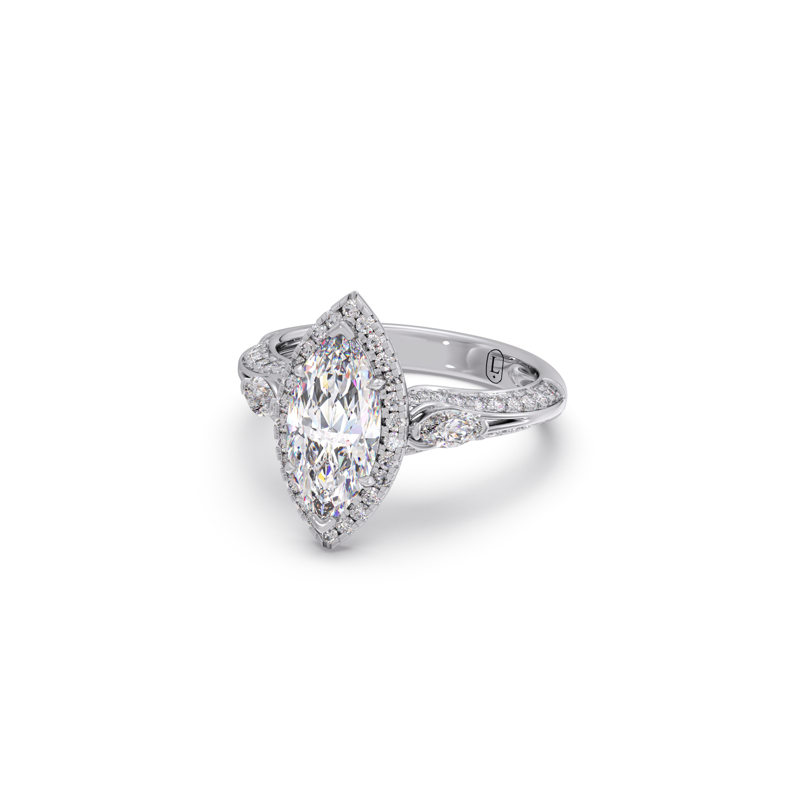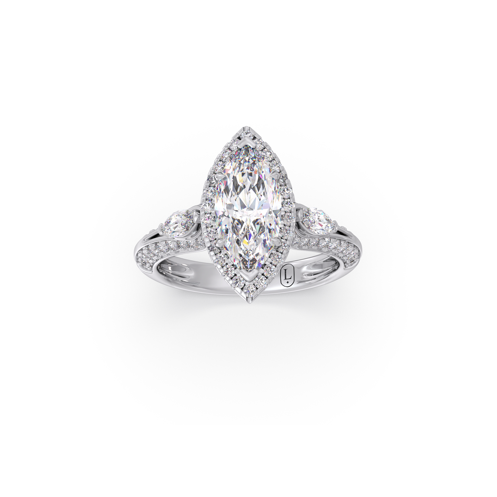 A striking marquise-cut center diamond commands attention, flanked by two matching marquise side stones and delicate round diamond accents. The setting enhances brilliance while adding a regal, sculpted silhouette.