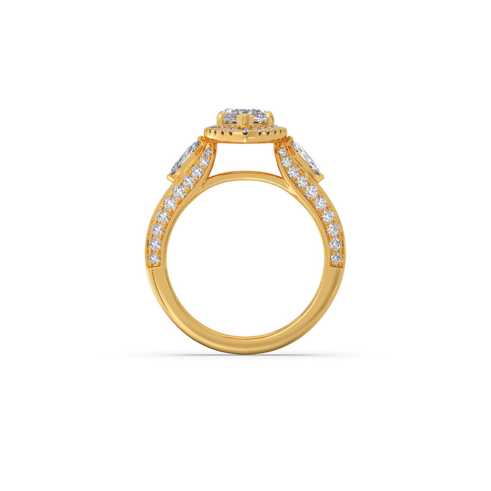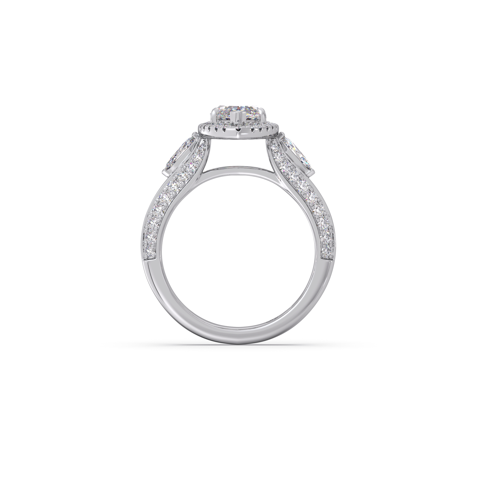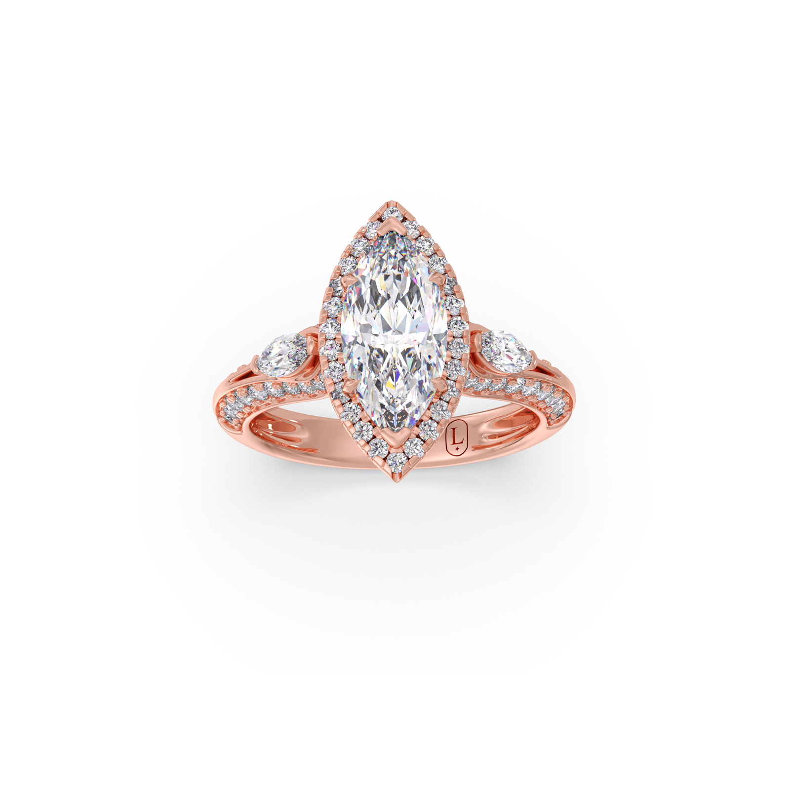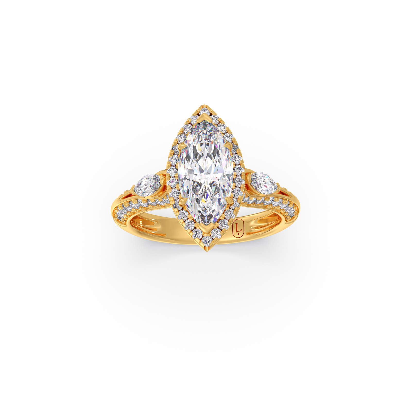 A striking marquise-cut center diamond commands attention, flanked by two matching marquise side stones and delicate round diamond accents. The setting enhances brilliance while adding a regal, sculpted silhouette.