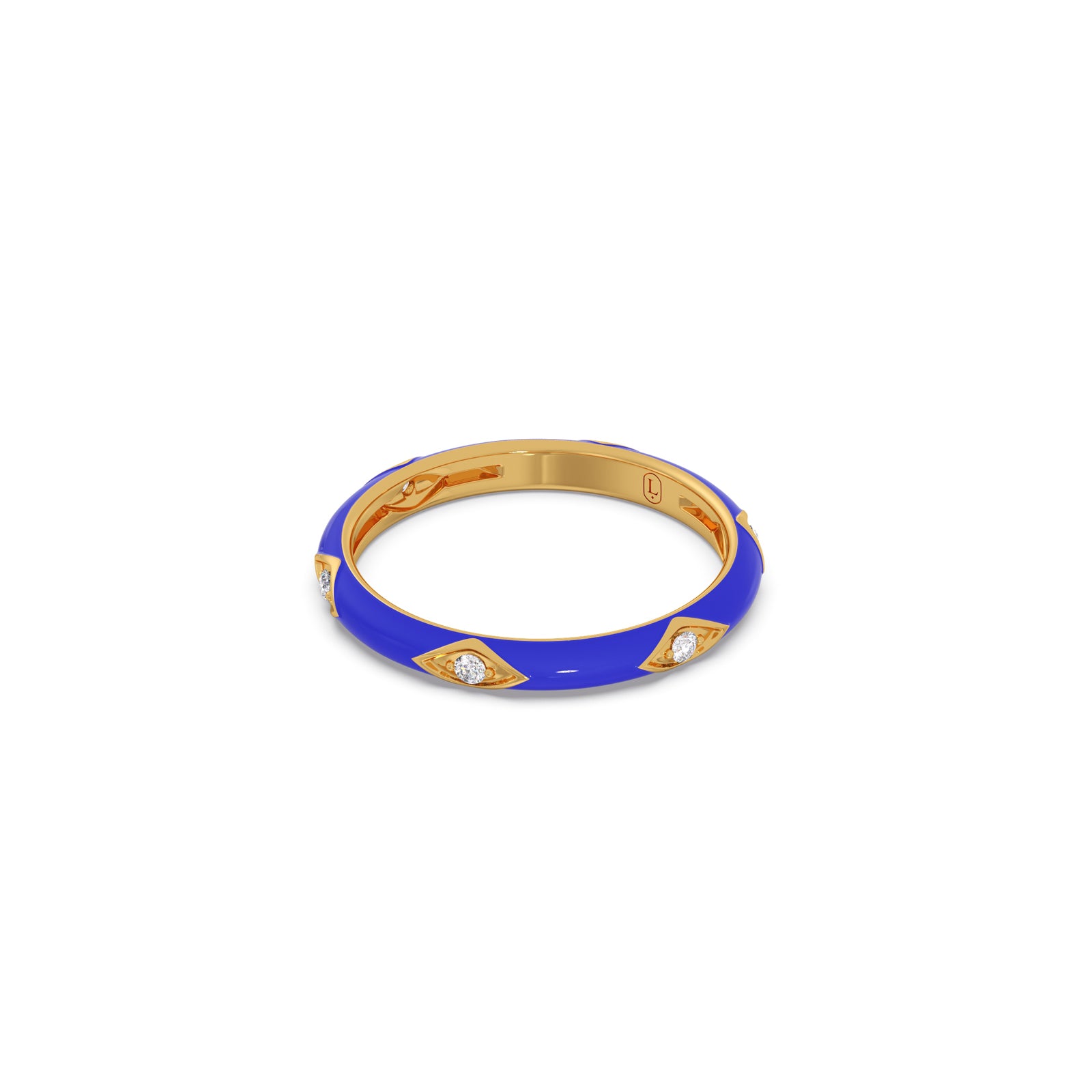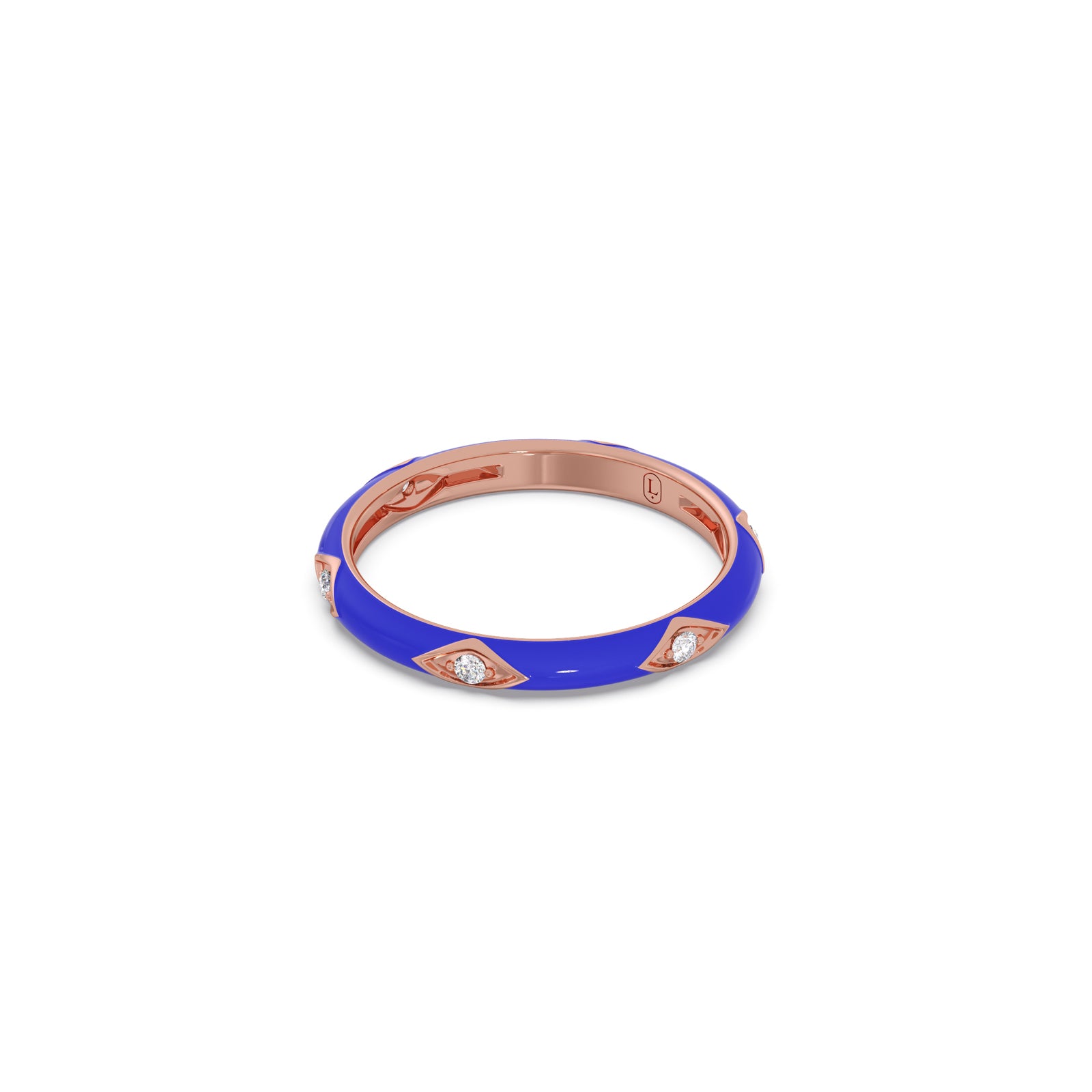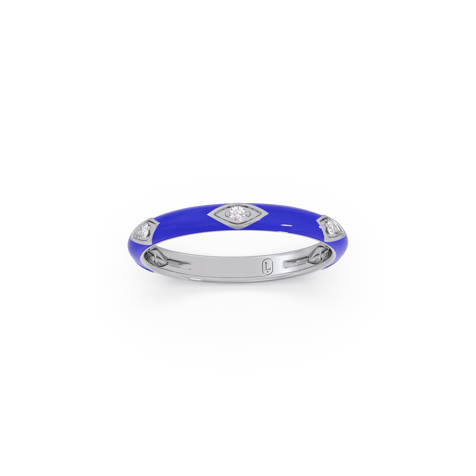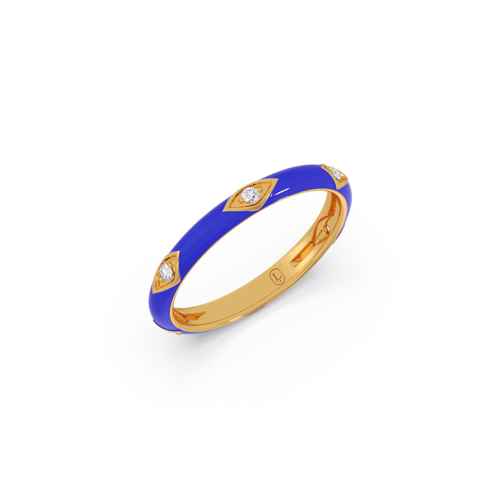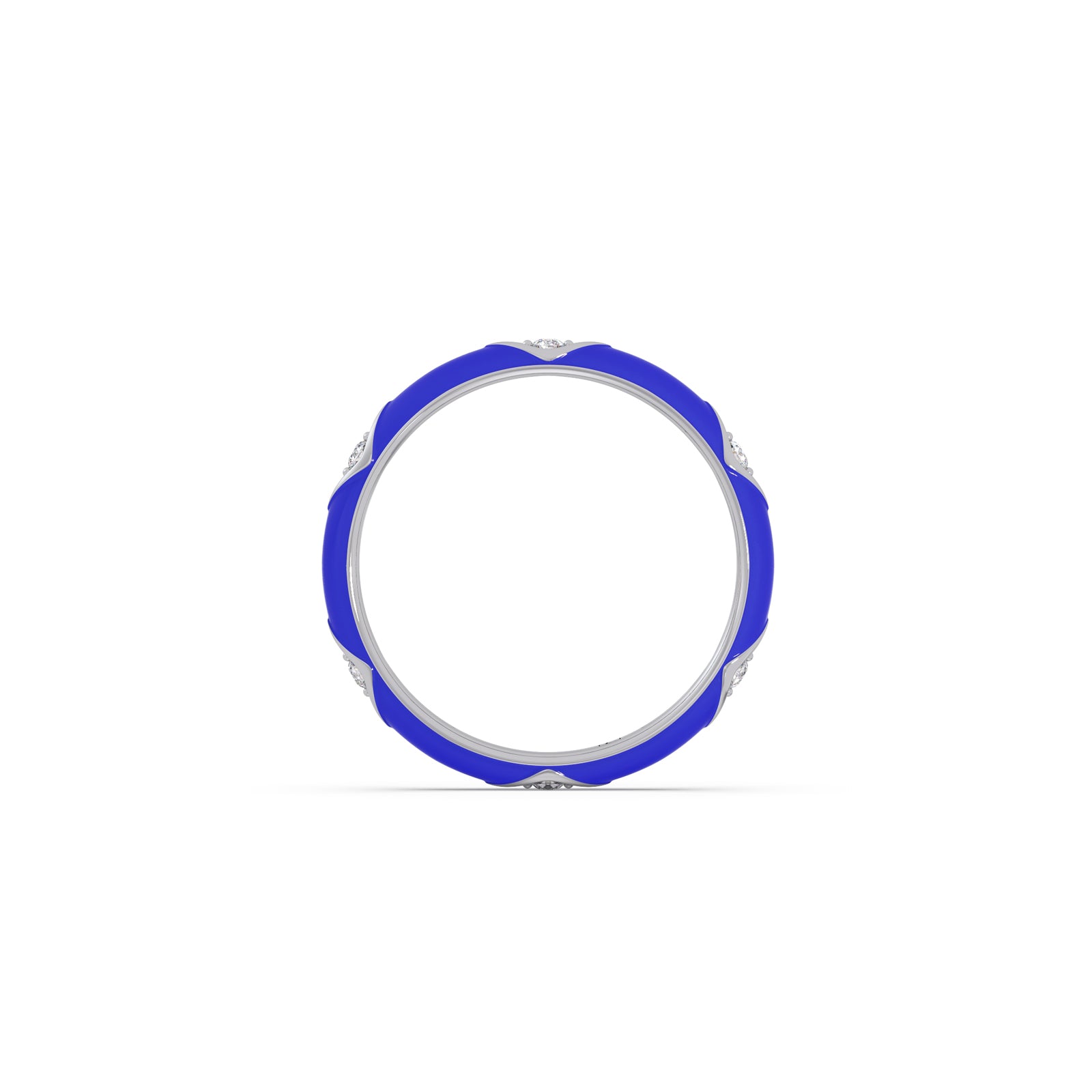 This Royal-Midnight Diamond Eternity Band features a seamless inlay of royal blue cold enamel. The circumference is punctuated by a series of brilliant round-cut diamonds, each diamond set within marquise-shaped gold windows. The slim, rounded profile ensures a comfortable fit for daily wear.