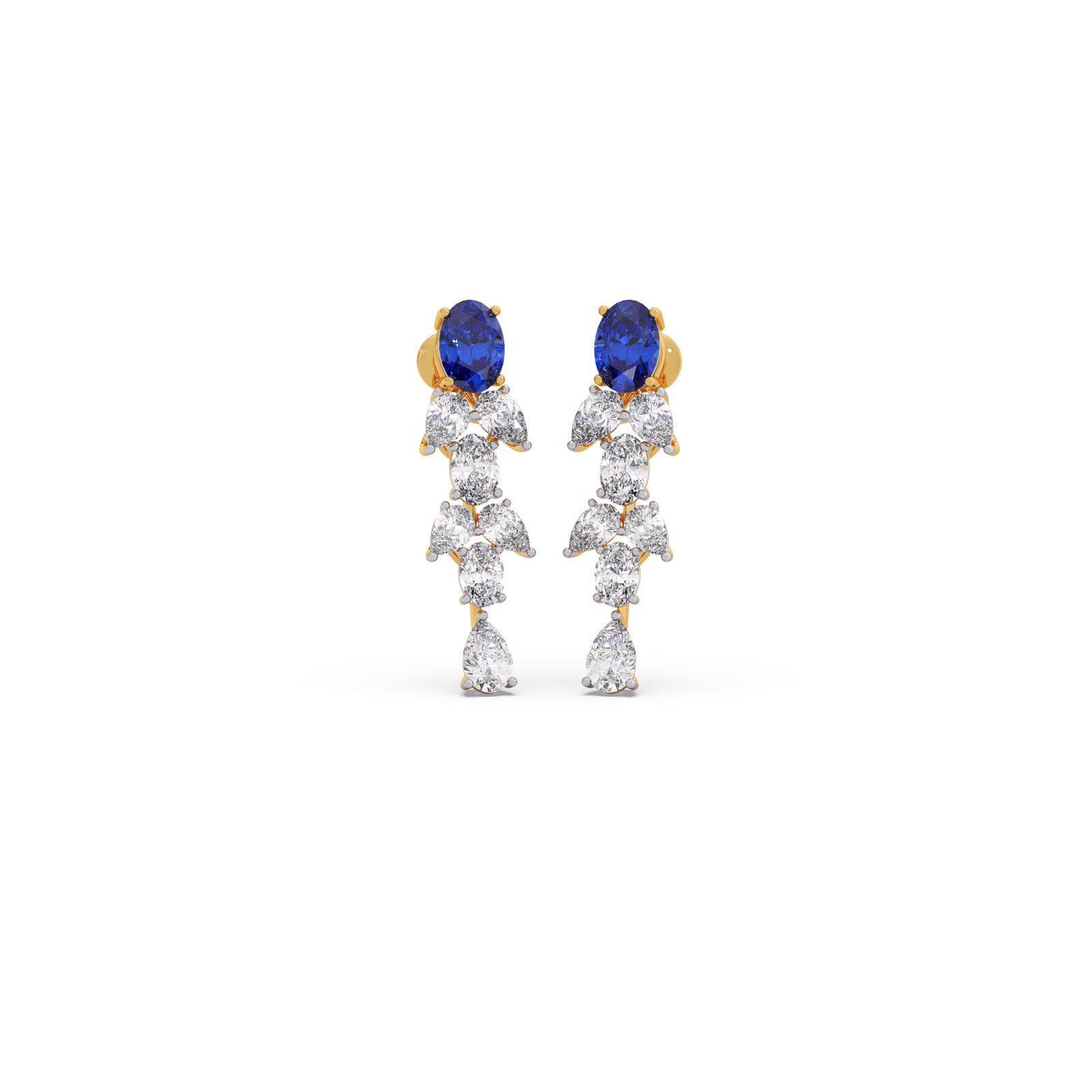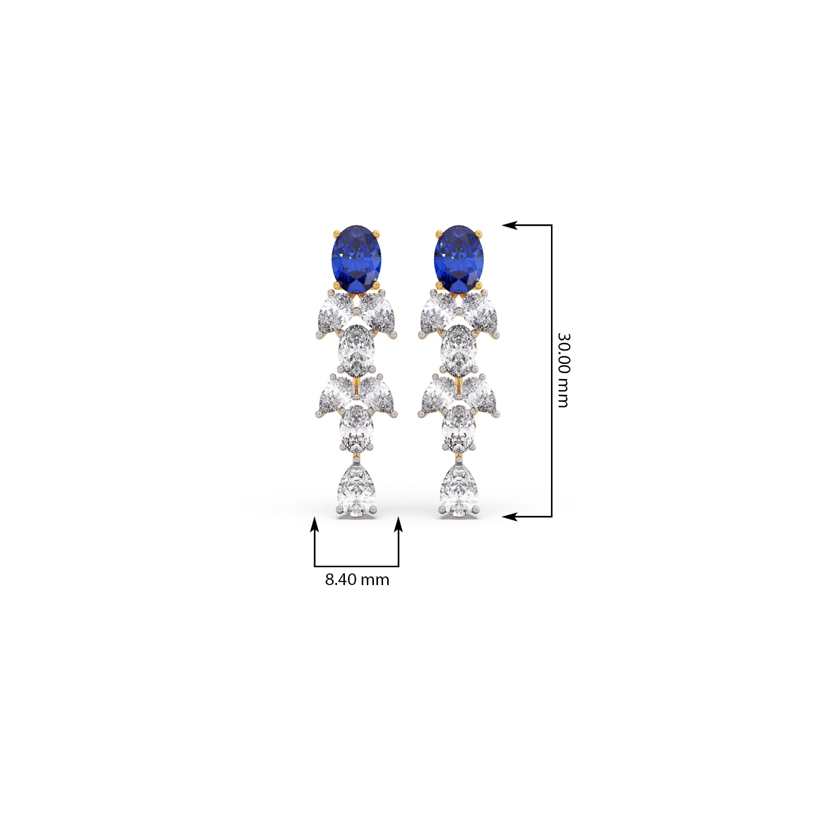 Adorn yourself with the captivating Sparkling Blue Oval-Cut Gemstones Earrings.This exquisite piece features a 3.332ct. shimmering drop of Pear-Cut and Oval-Cut Diamonds.This elegant design beautifully combines classic brilliance with a touch of colorful allure, creating a sophisticated statement perfect for any special occasion.