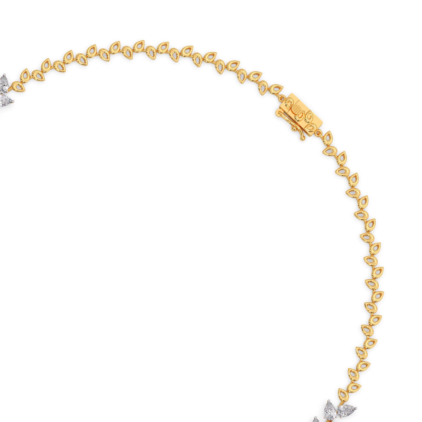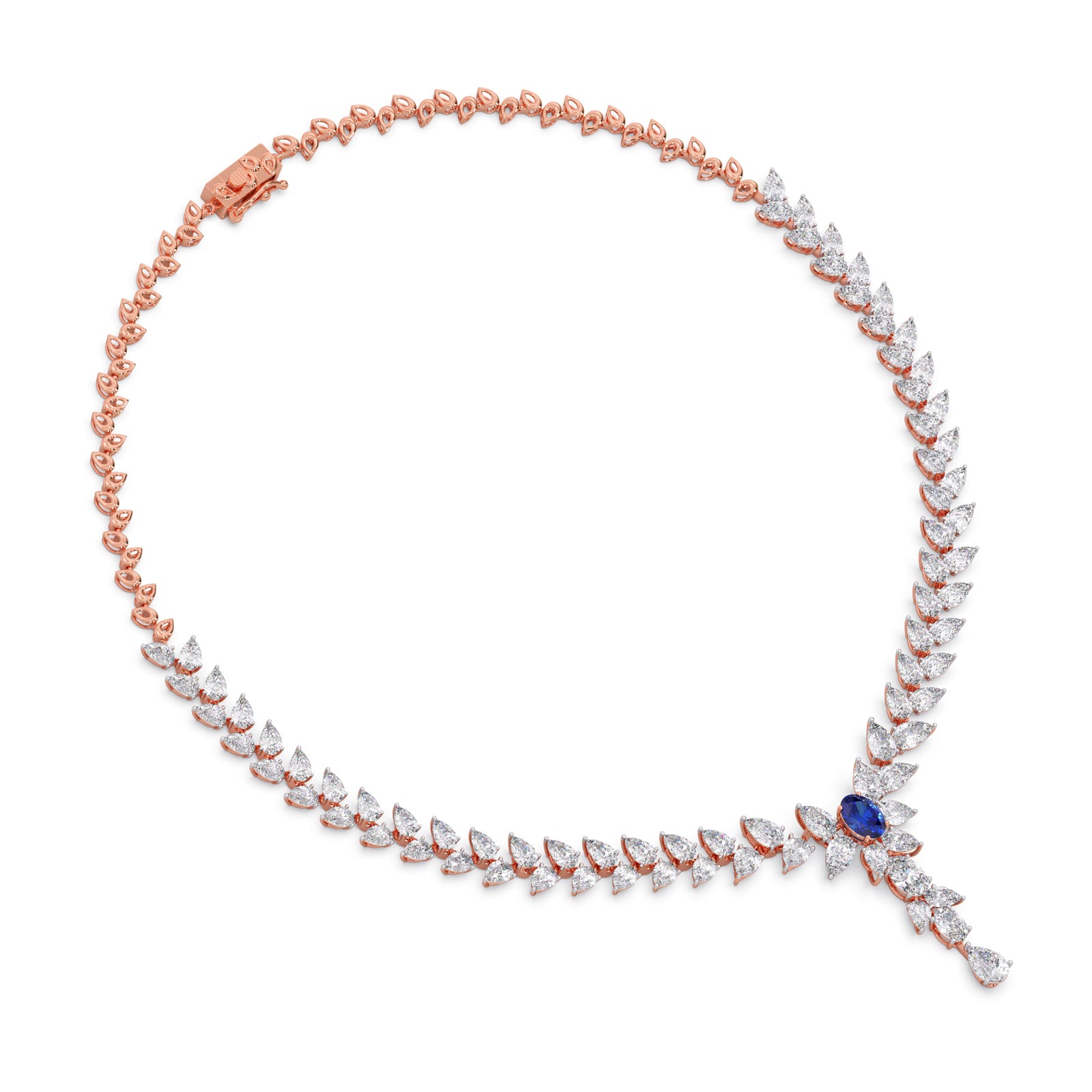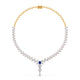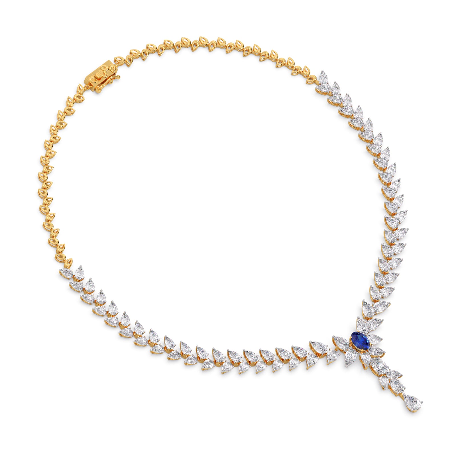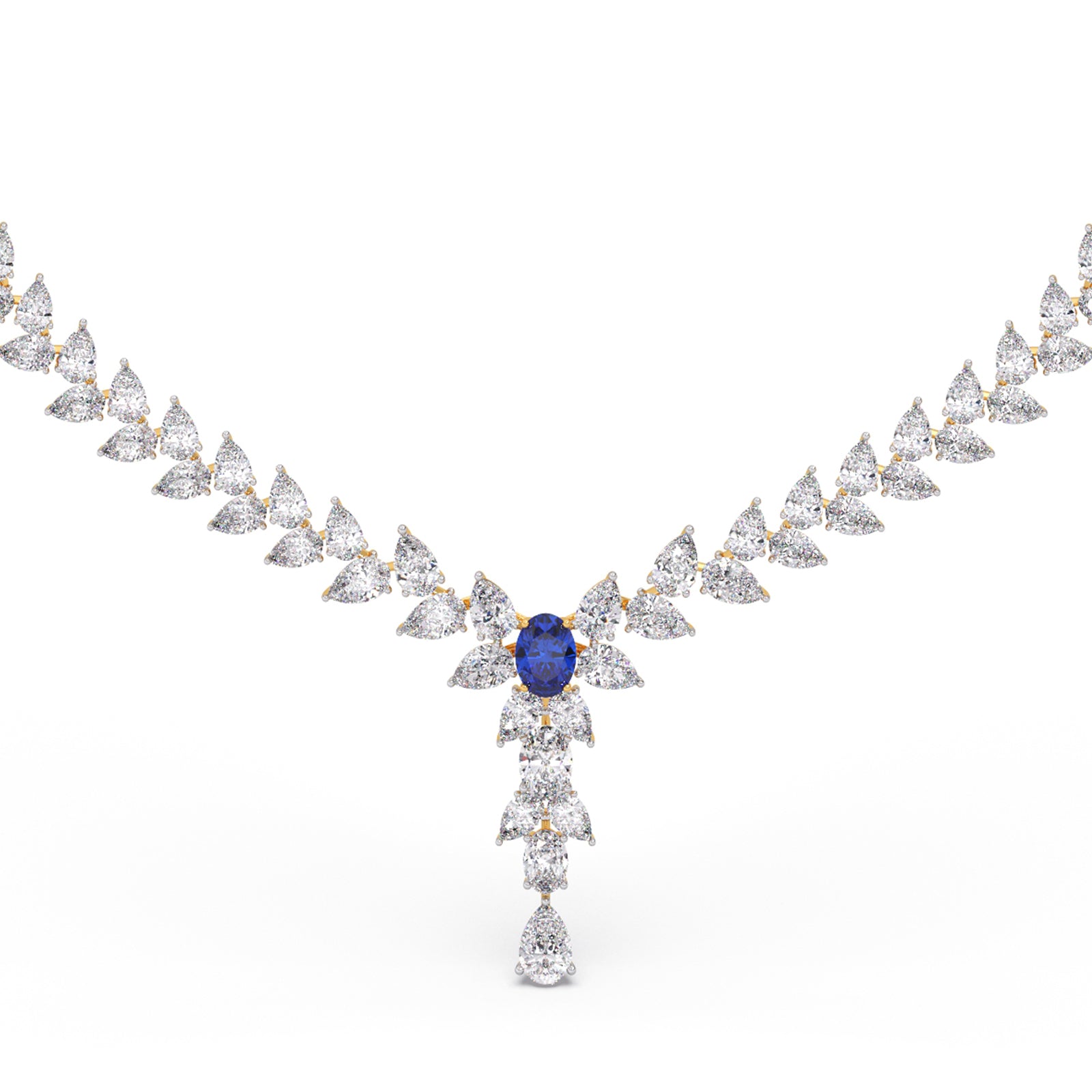 Elegant diamond necklace featuring a graceful pear-cut silhouette, highlighted by a vivid blue centerpiece and delicate drop pendant. Crafted in dual-tone gold, perfect for bridal, festive, and statement luxury styling.