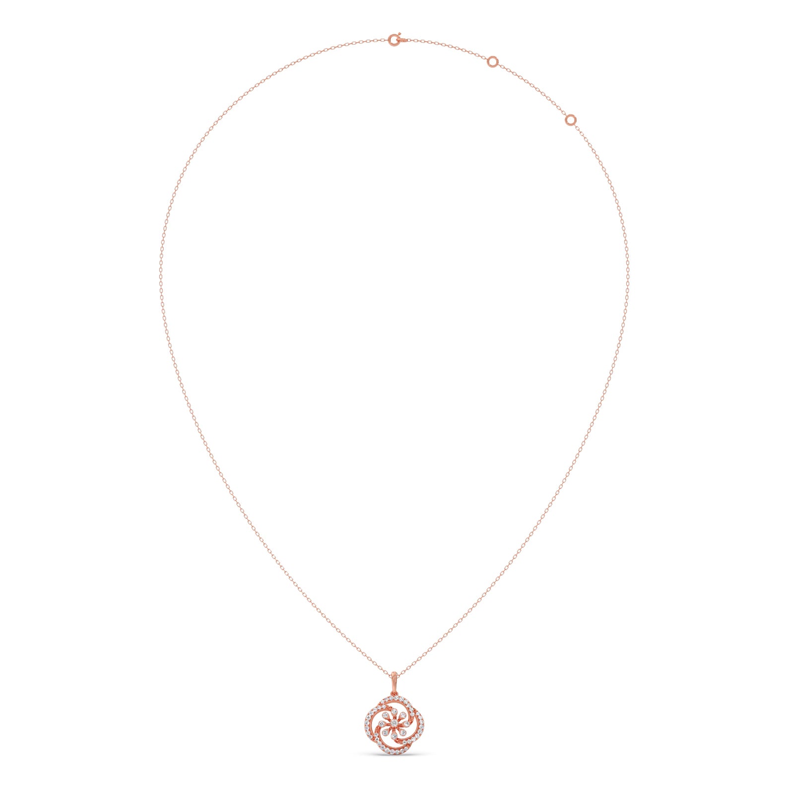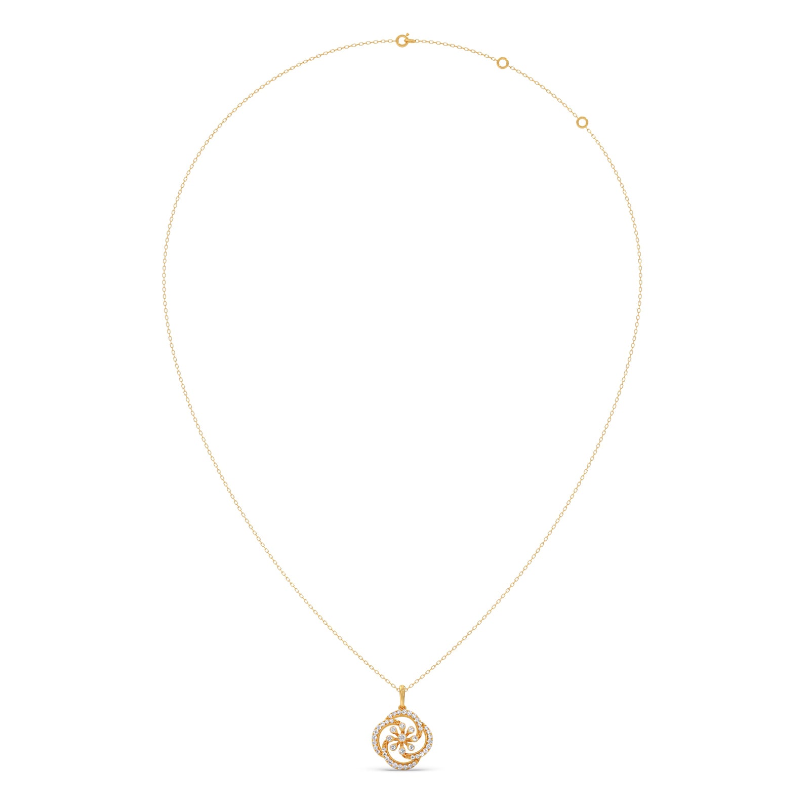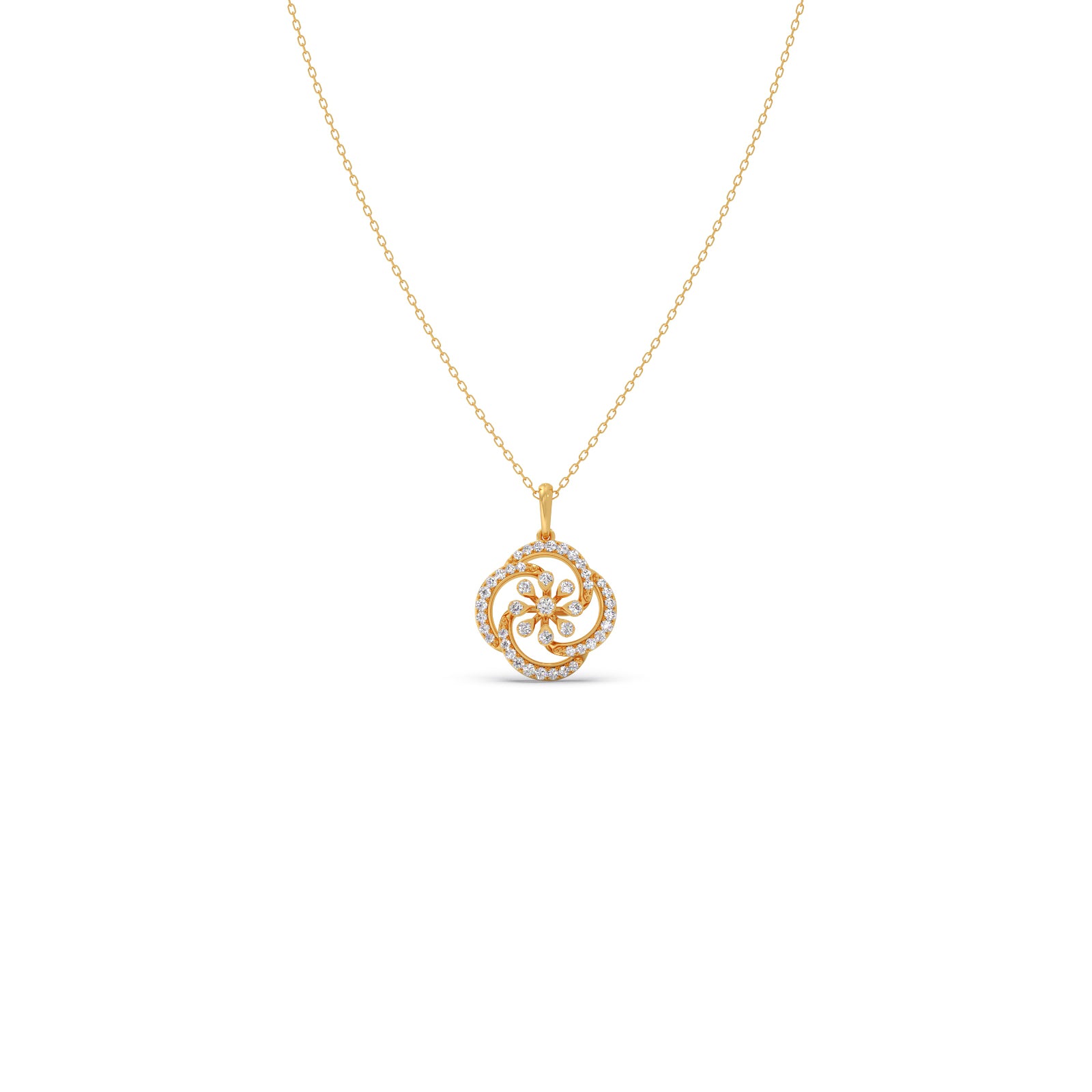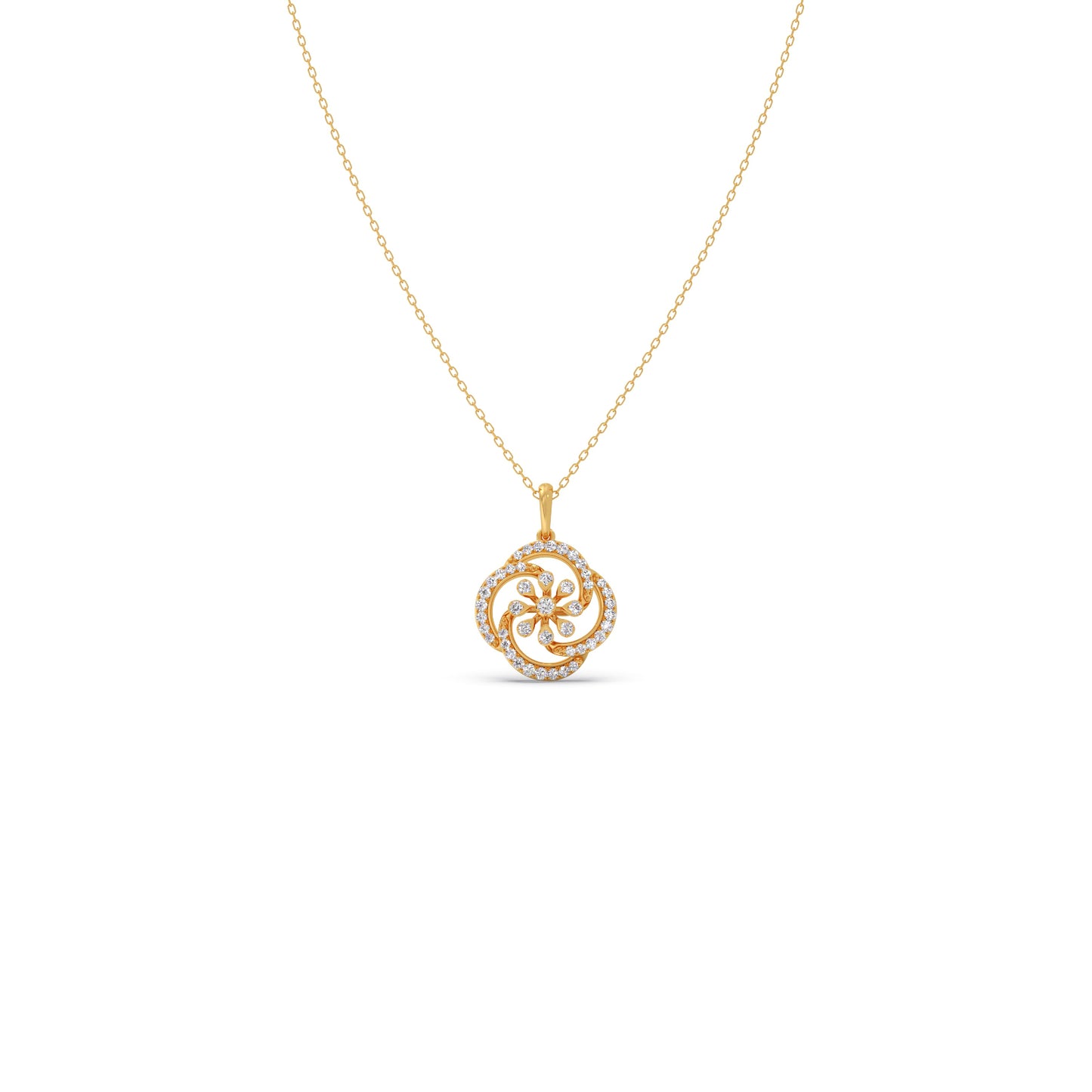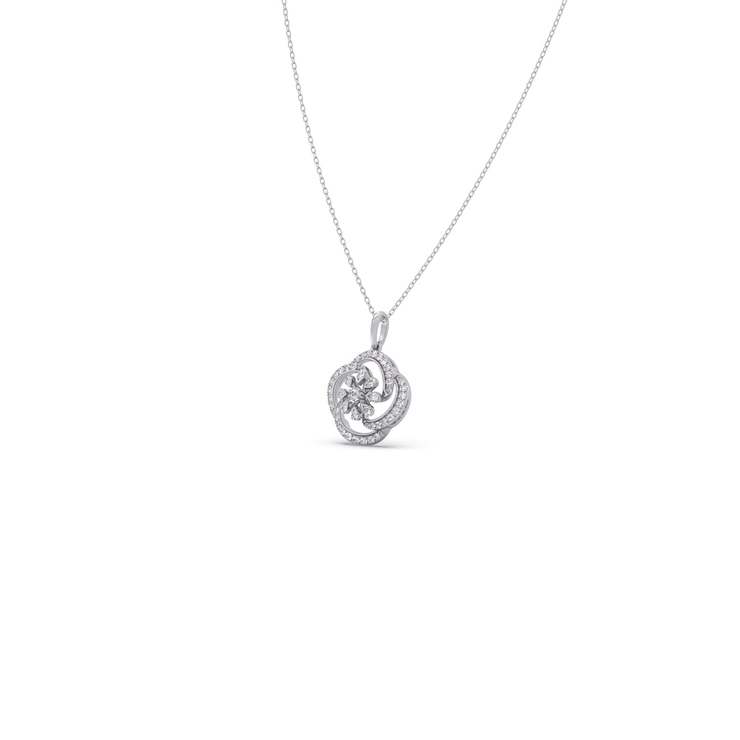 This Shimmering Bloom Diamond Pendant in gold and round diamond features a captivating swirling floral design, meticulously set with sparkling diamonds. Its delicate yet dynamic style makes it a stunning centerpiece for any look, radiating grace and charm. A true celebration of sparkle.