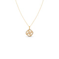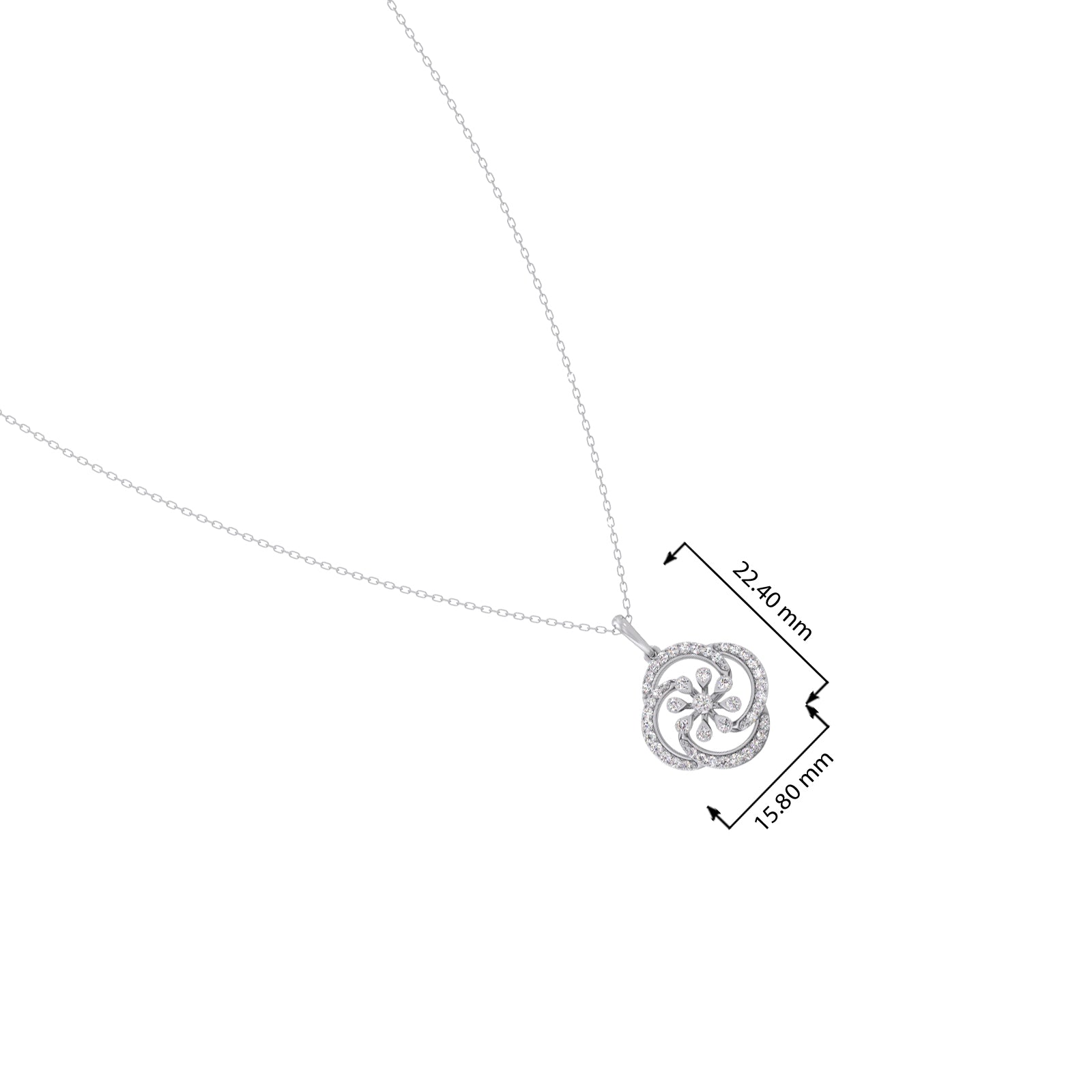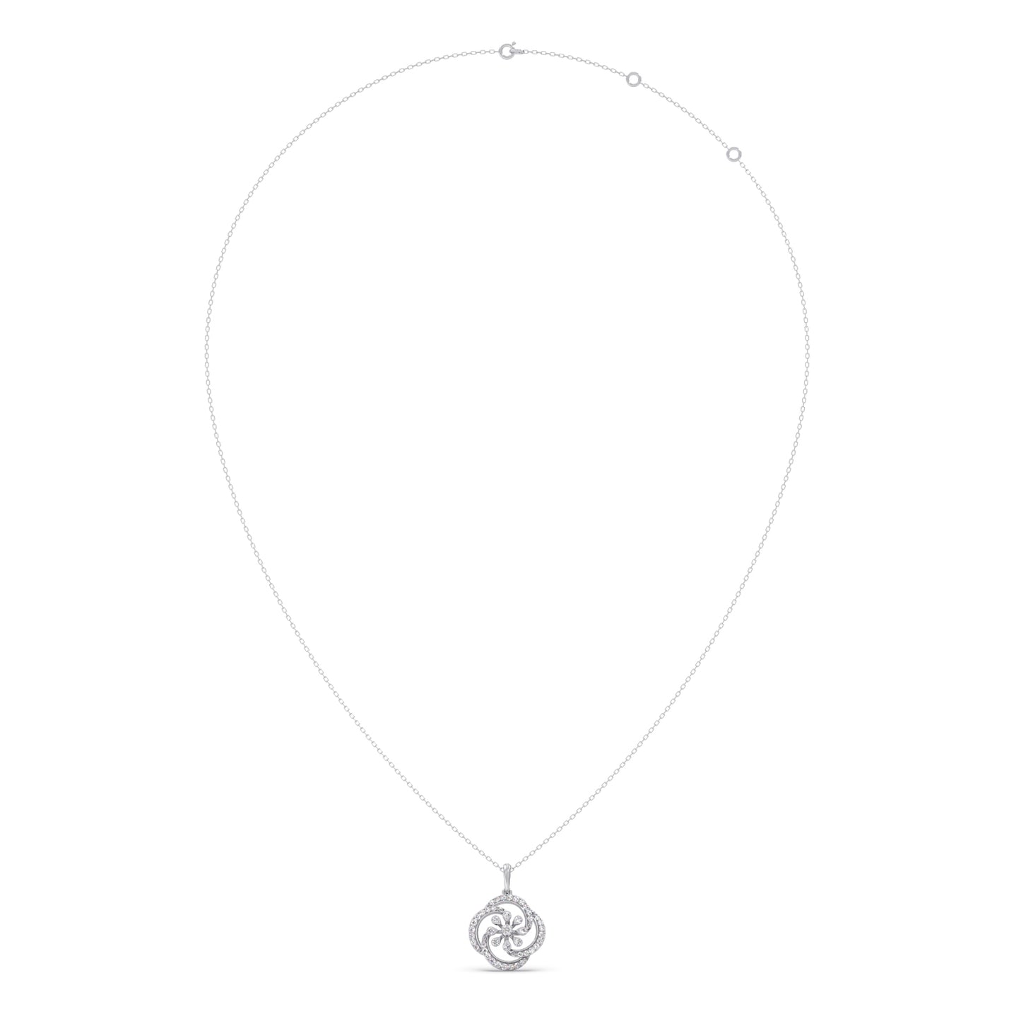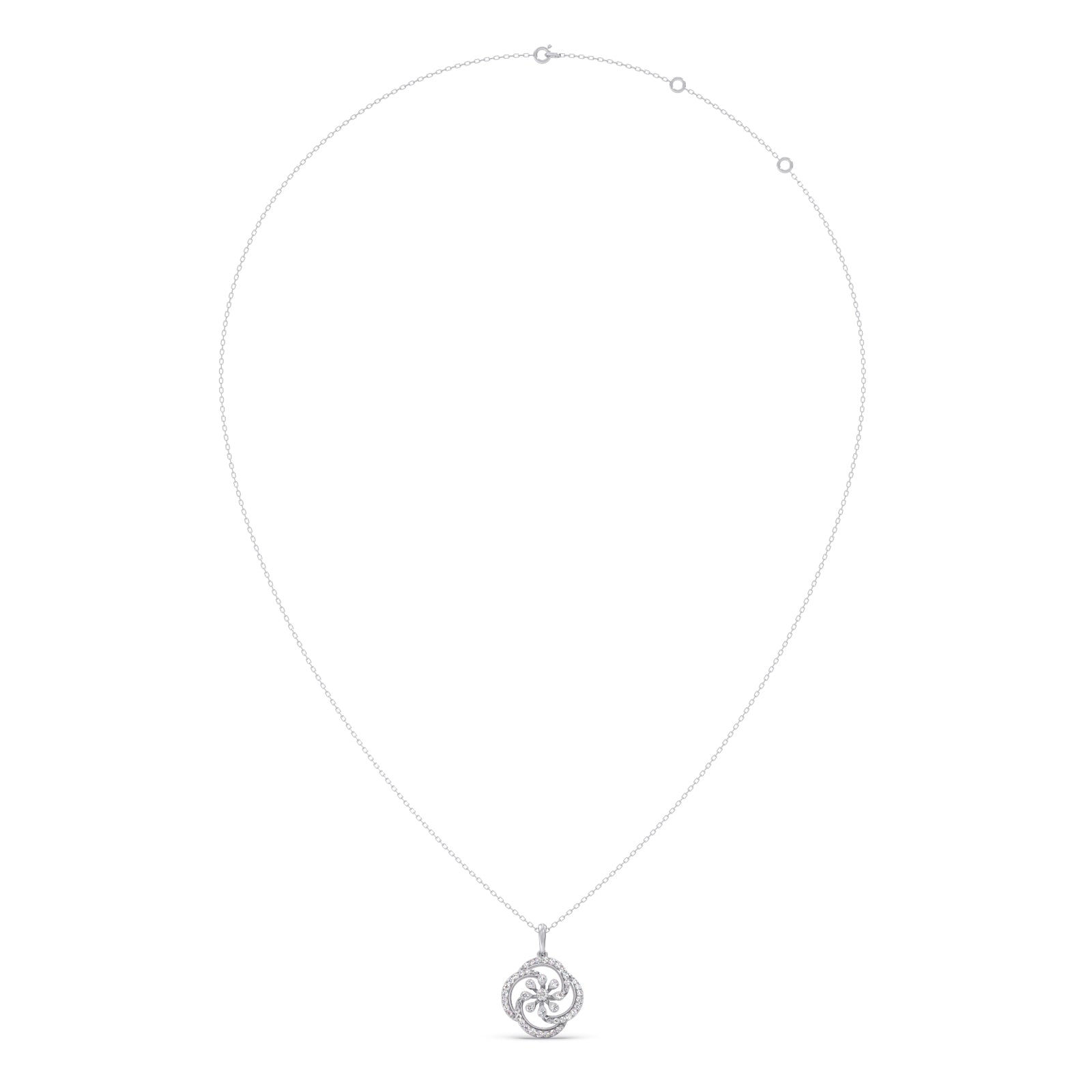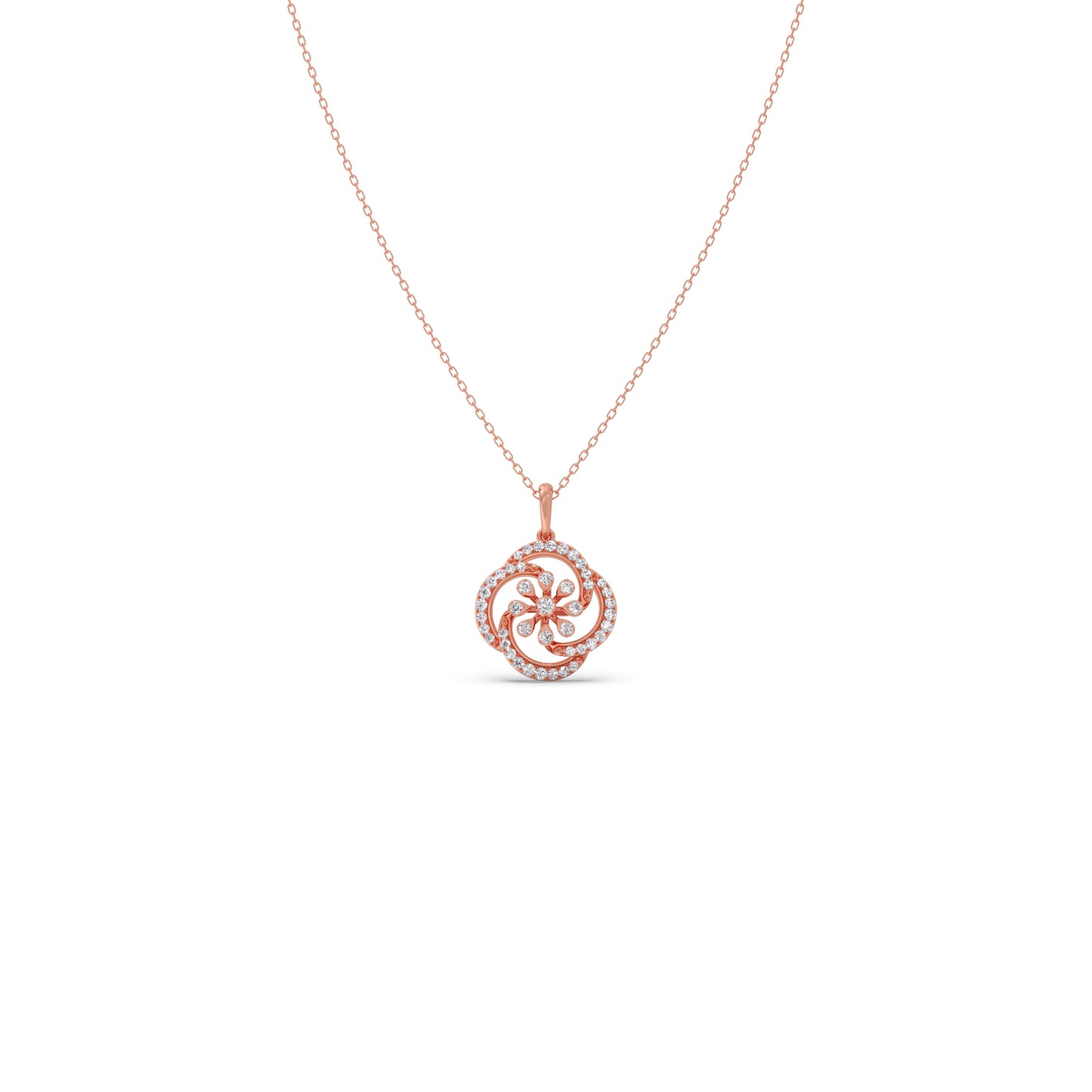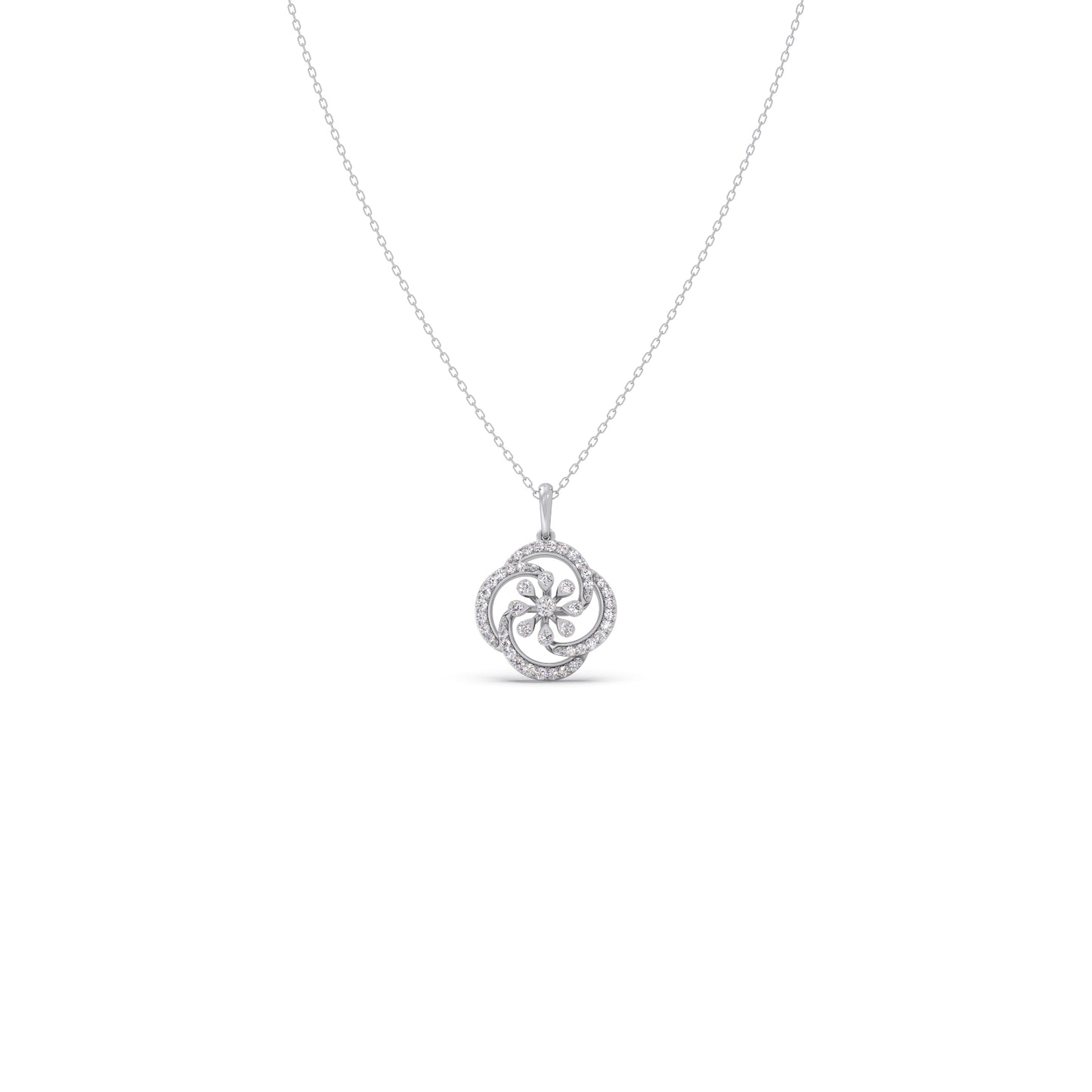 This Shimmering Bloom Diamond Pendant in gold and round diamond features a captivating swirling floral design, meticulously set with sparkling diamonds. Its delicate yet dynamic style makes it a stunning centerpiece for any look, radiating grace and charm. A true celebration of sparkle.