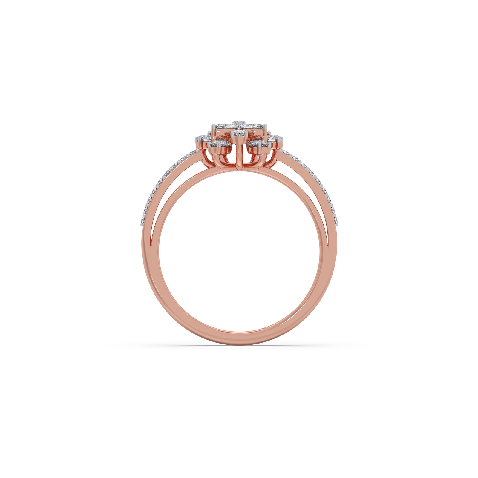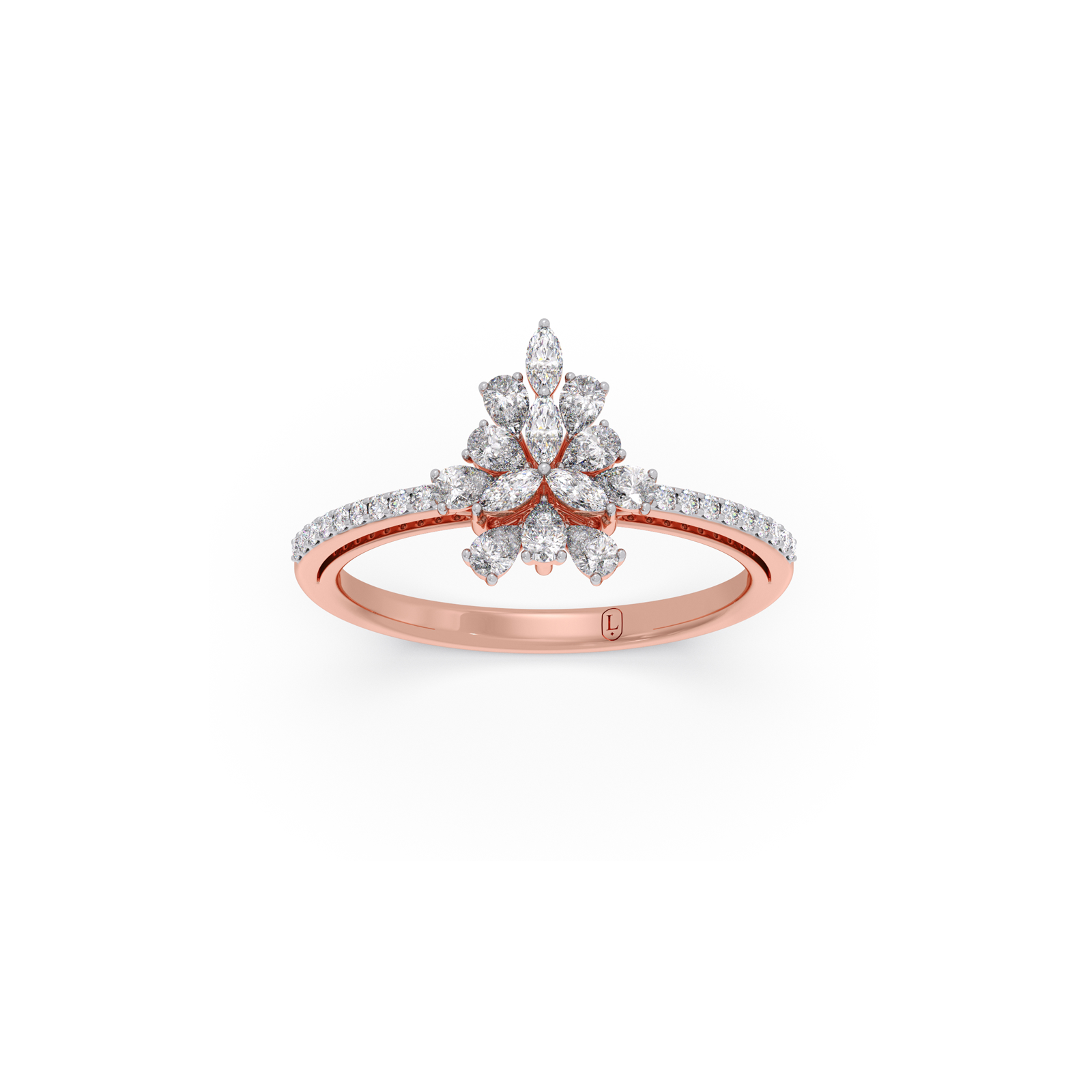 This elegant ring features a sophisticated floral cluster design, crafted in classic pear-cut and marquise diamonds. A slender gold band features a row of brilliant round diamonds, makes it an ideal cocktail or fashion ring for formal events.