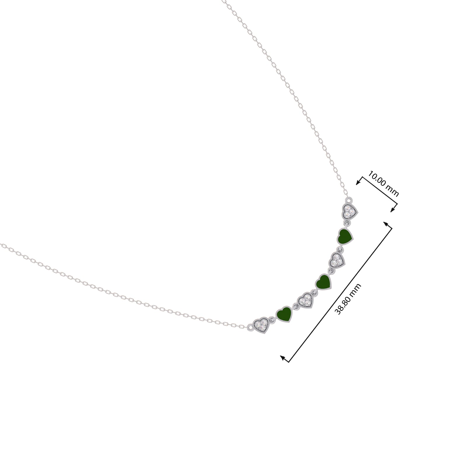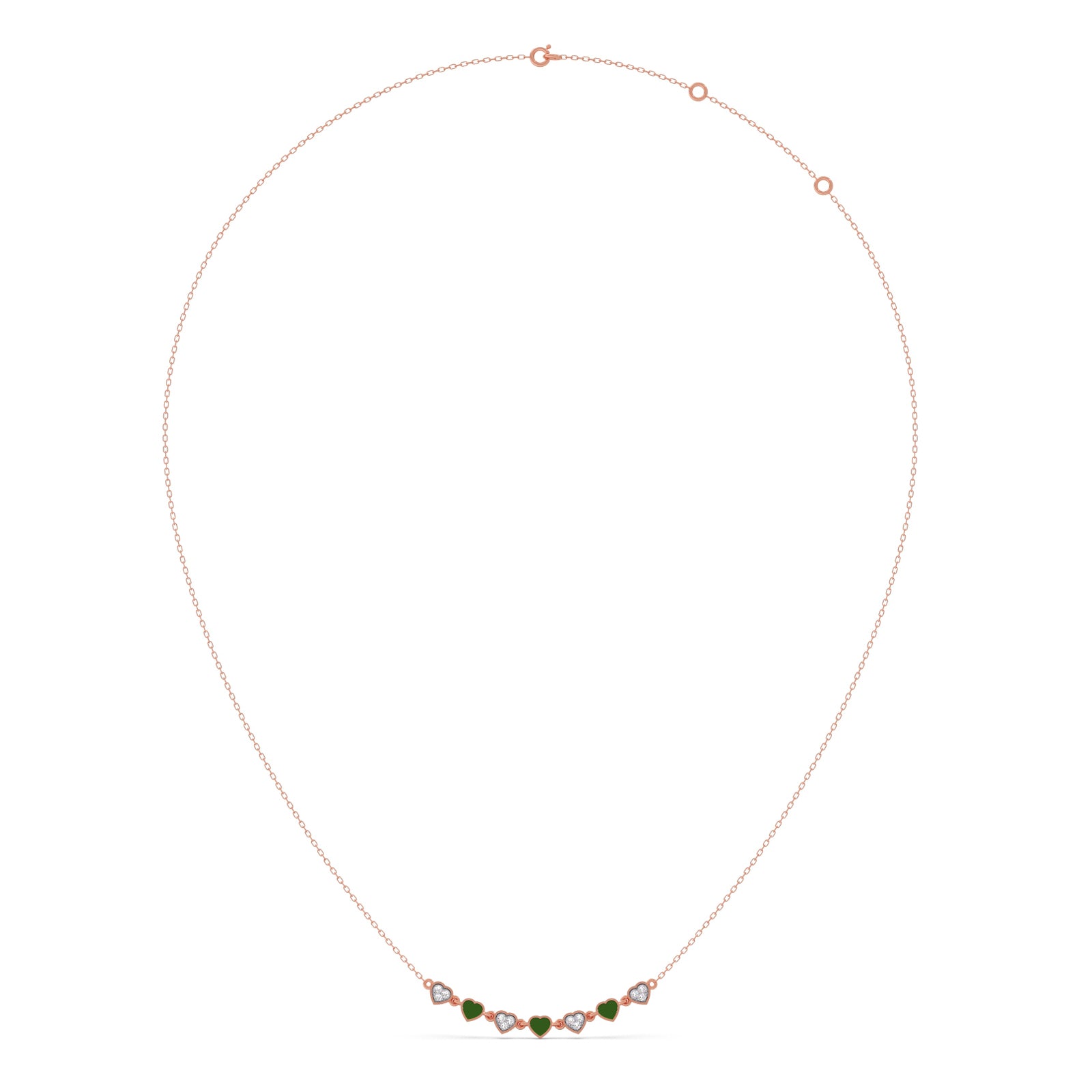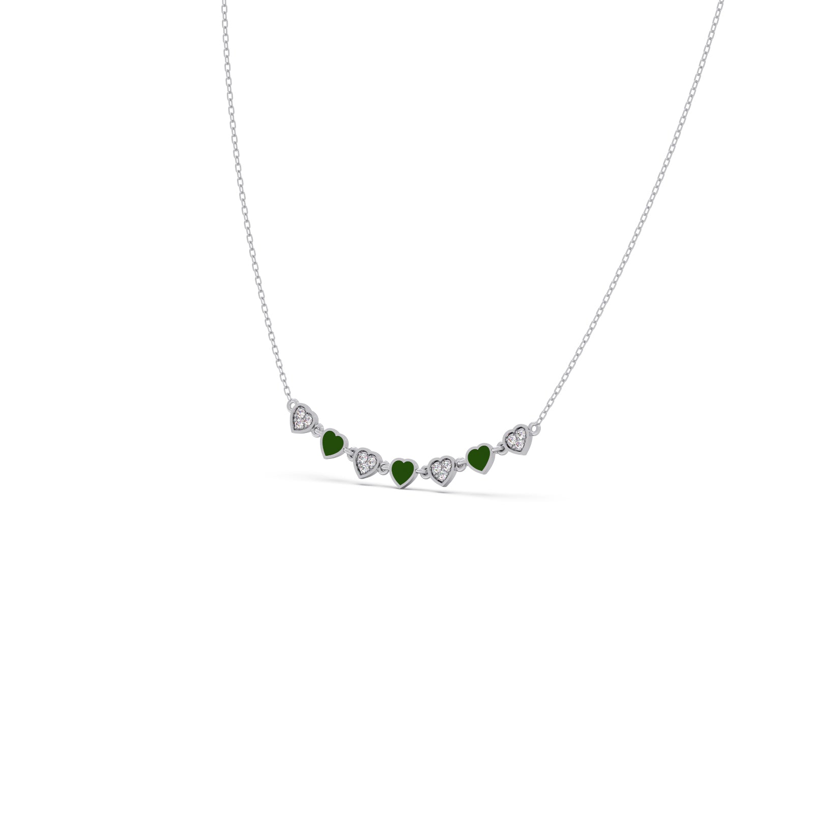 This is a dainty station-style necklace featuring a curved horizontal arrangement of small heart charms. Four hearts feature a deep green enamel inlay set within a gold border, while other three hearts are pavé-set with shimmering round diamonds. This necklace gives a sophisticated yet playful look, making it ideal for layering or wearing as a subtle statement piece.