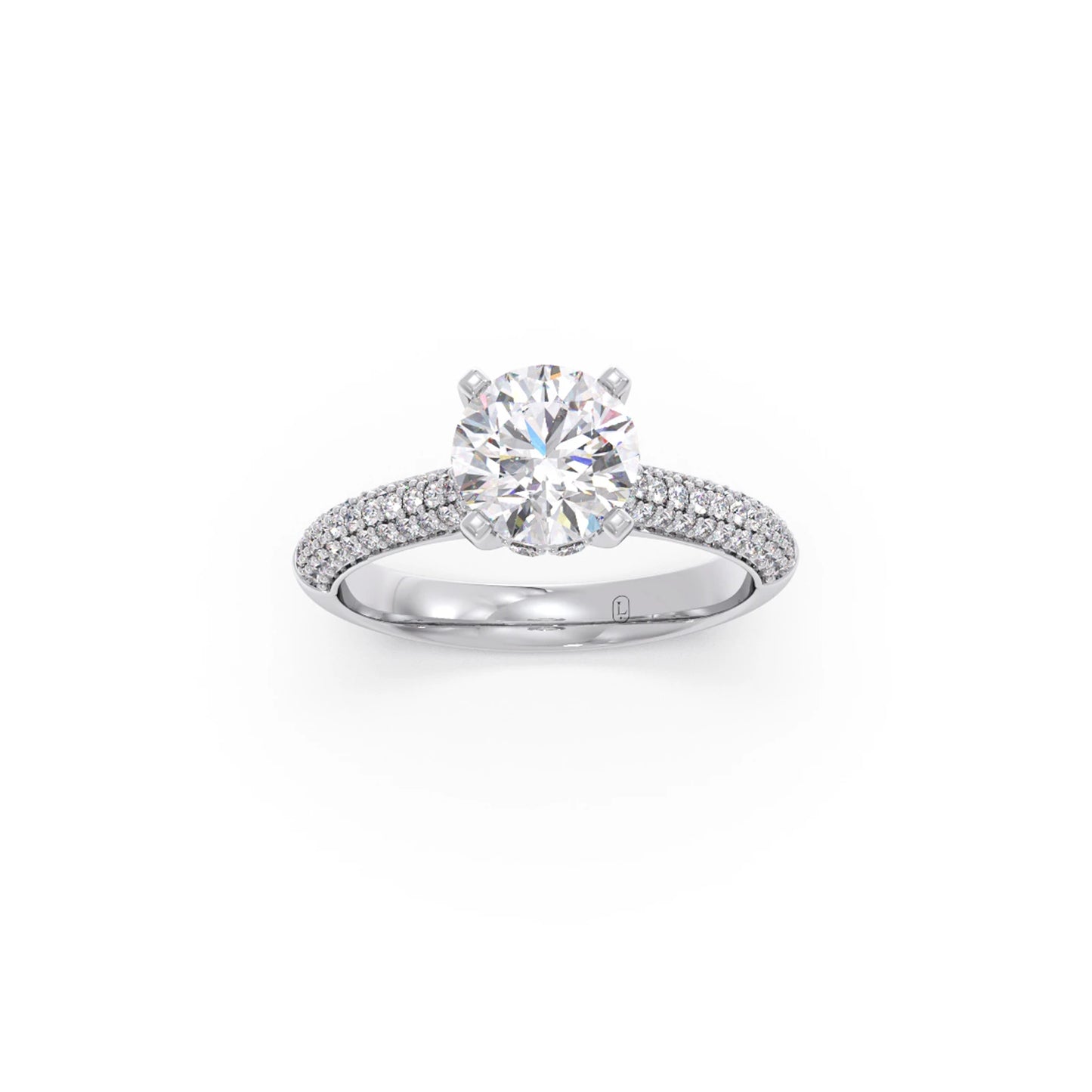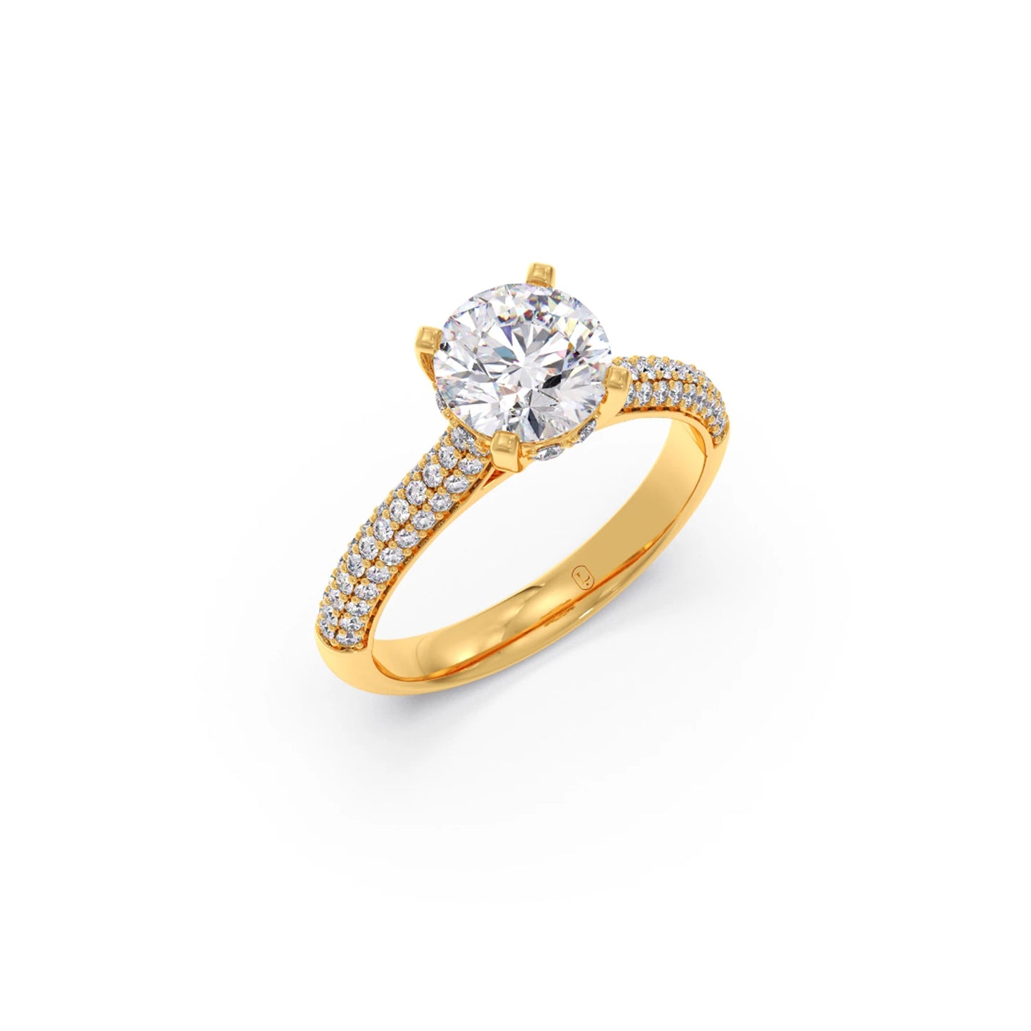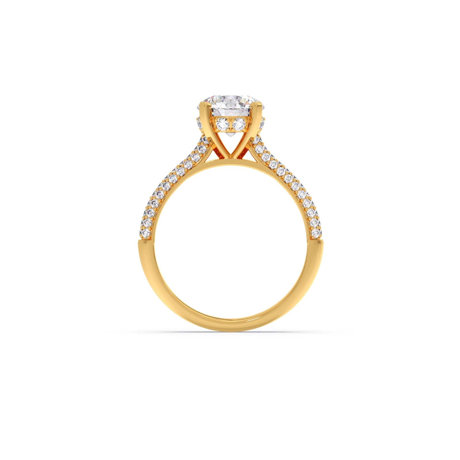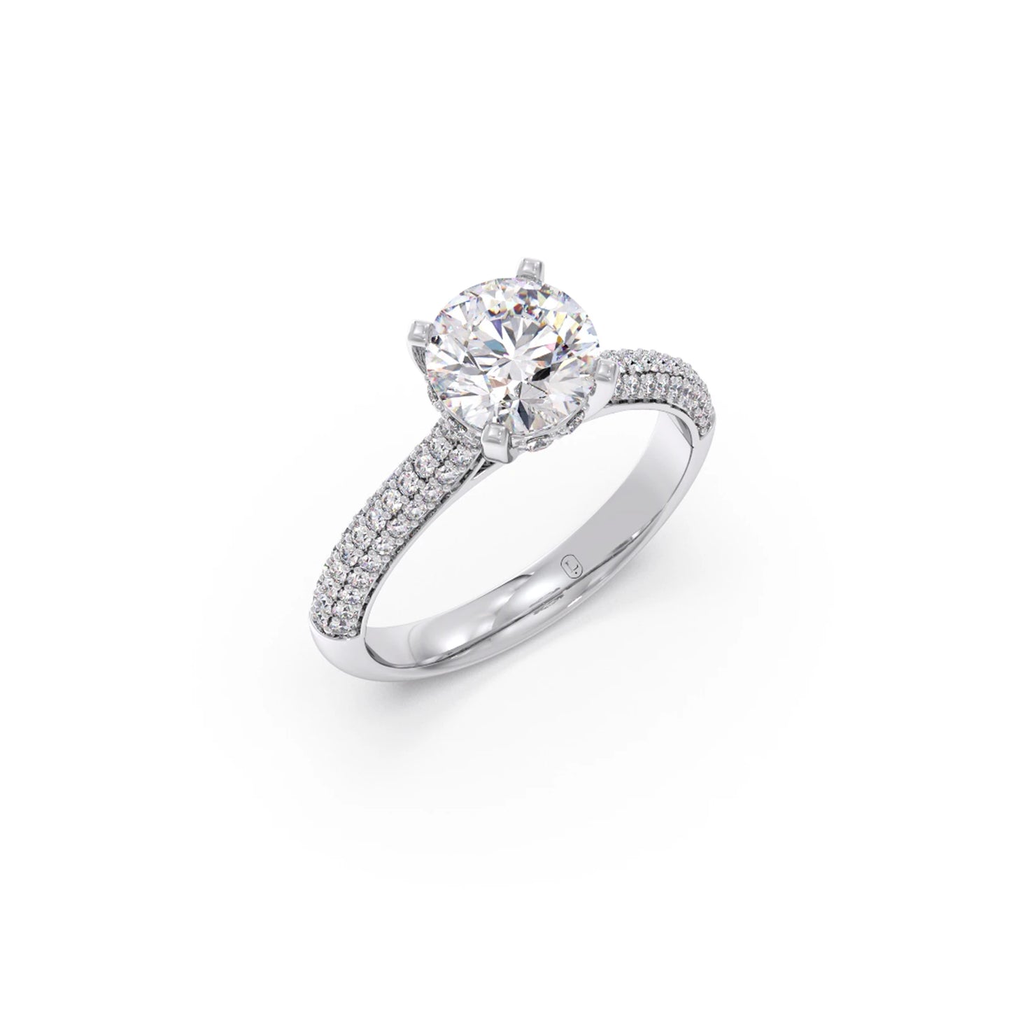 The Sparkling Round Solitaire with Diamond Accent Band Engagement Ring features a brilliant round-cut center stone, elegantly set on a shimmering diamond-accented band. This timeless design enhances sparkle and sophistication, making it the perfect choice for those who appreciate classic elegance with a touch of modern brilliance.