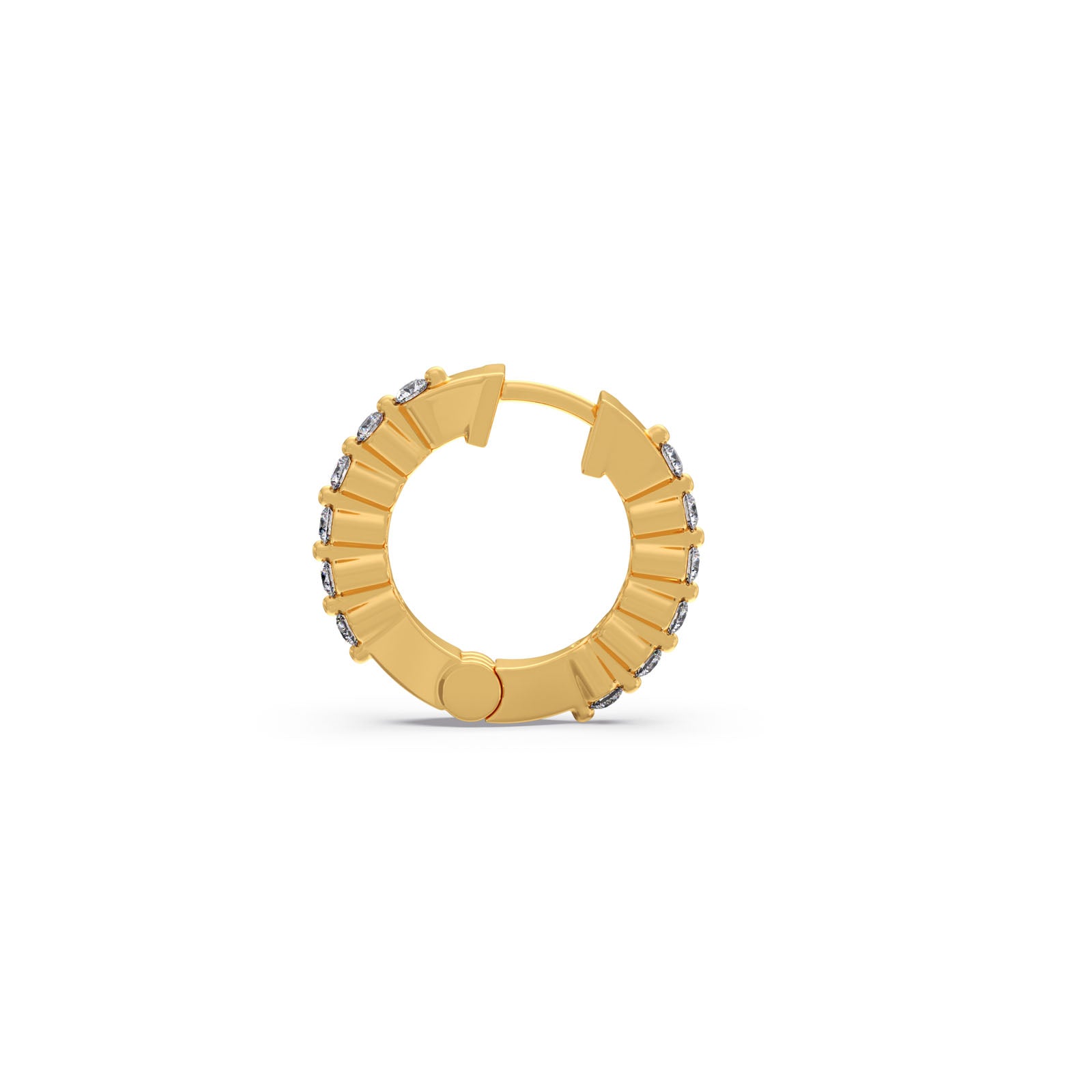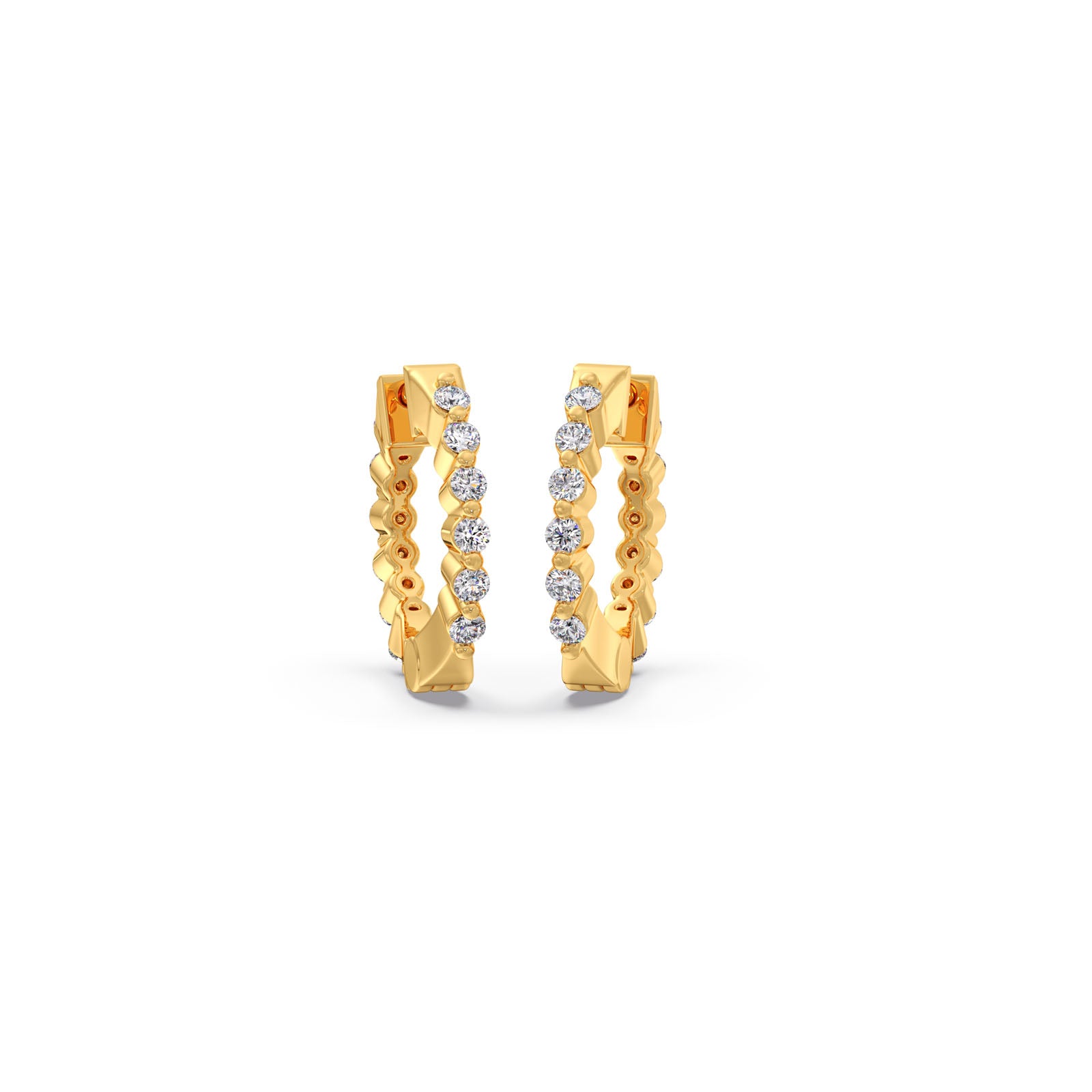 Inspired by the night sky, these unique huggie earrings feature a striking star-cut pattern along the polished yellow gold band. Brilliant round diamonds are set between each geometric star, creating a captivating sparkle. This modern and distinctive design is perfect for adding a touch of celestial charm to your look.