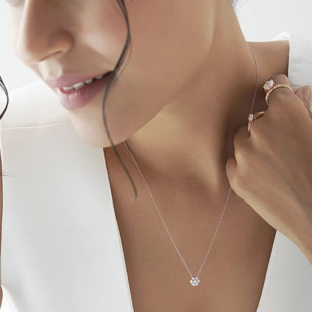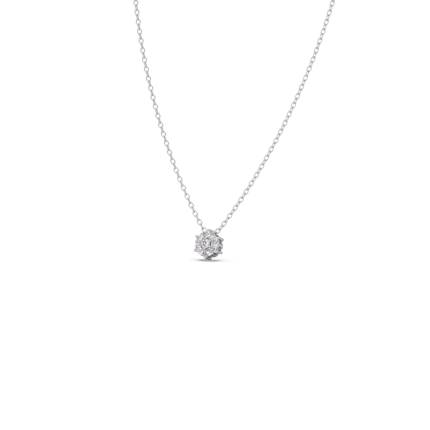 This stunning platinum pendant combines the brilliance of a starburst with the delicate beauty of a floral design. A central cluster of diamonds radiates outwards like blossoming petals, each shimmering with exceptional sparkle. Suspended from a fine platinum chain, this pendant offers a unique blend of radiant energy and elegant femininity. A captivating statement piece.