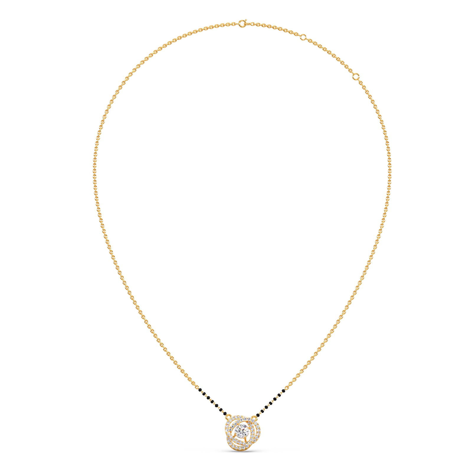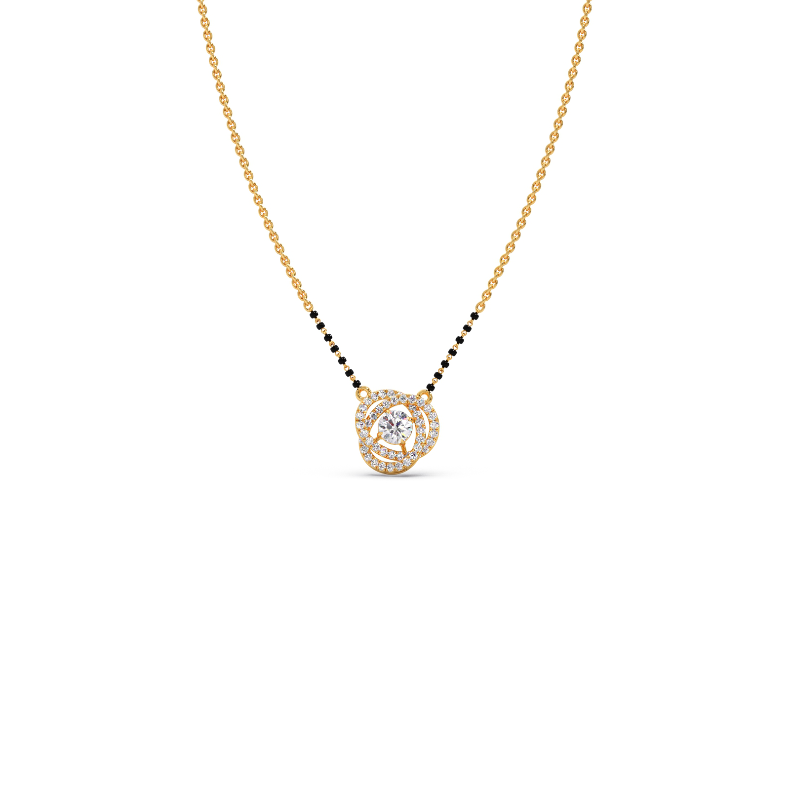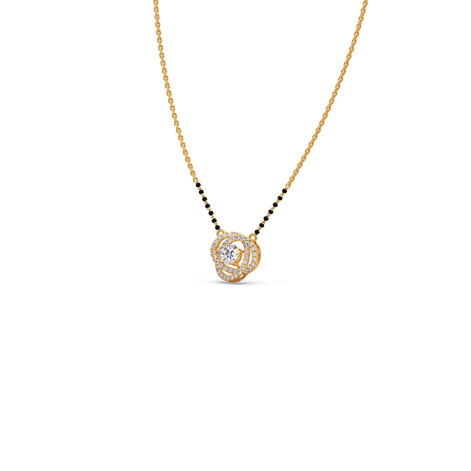The Swirl Halo Diamond Mangalsutra Necklace is more than just jewelry — it’s a symbol of love wrapped in elegance. A brilliant round diamond sits at the center of an intricate swirl, capturing the beauty of endless togetherness. Paired with delicate black beads, this piece blends tradition with modern charm — perfect for the woman who honors her roots while embracing her own unique journey.