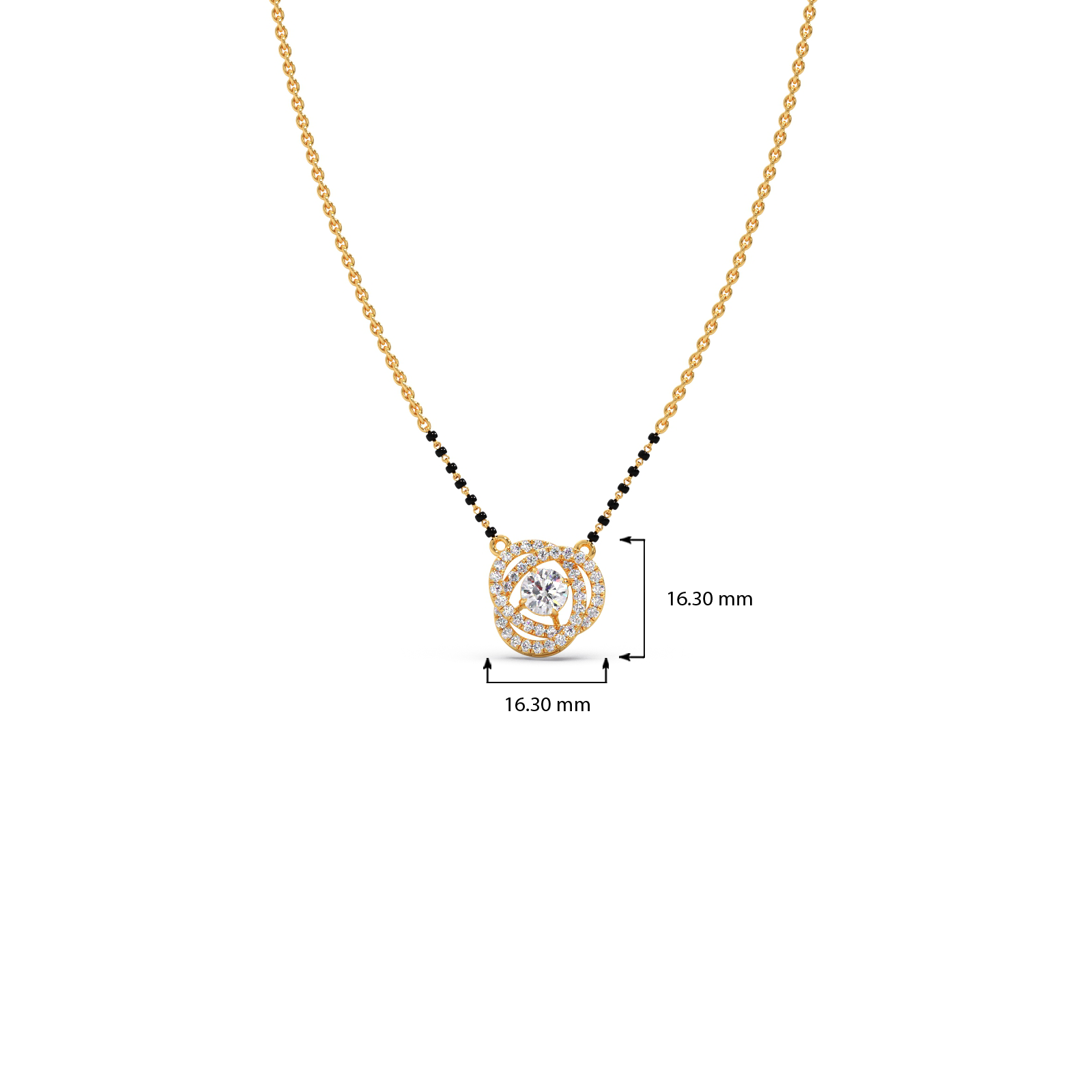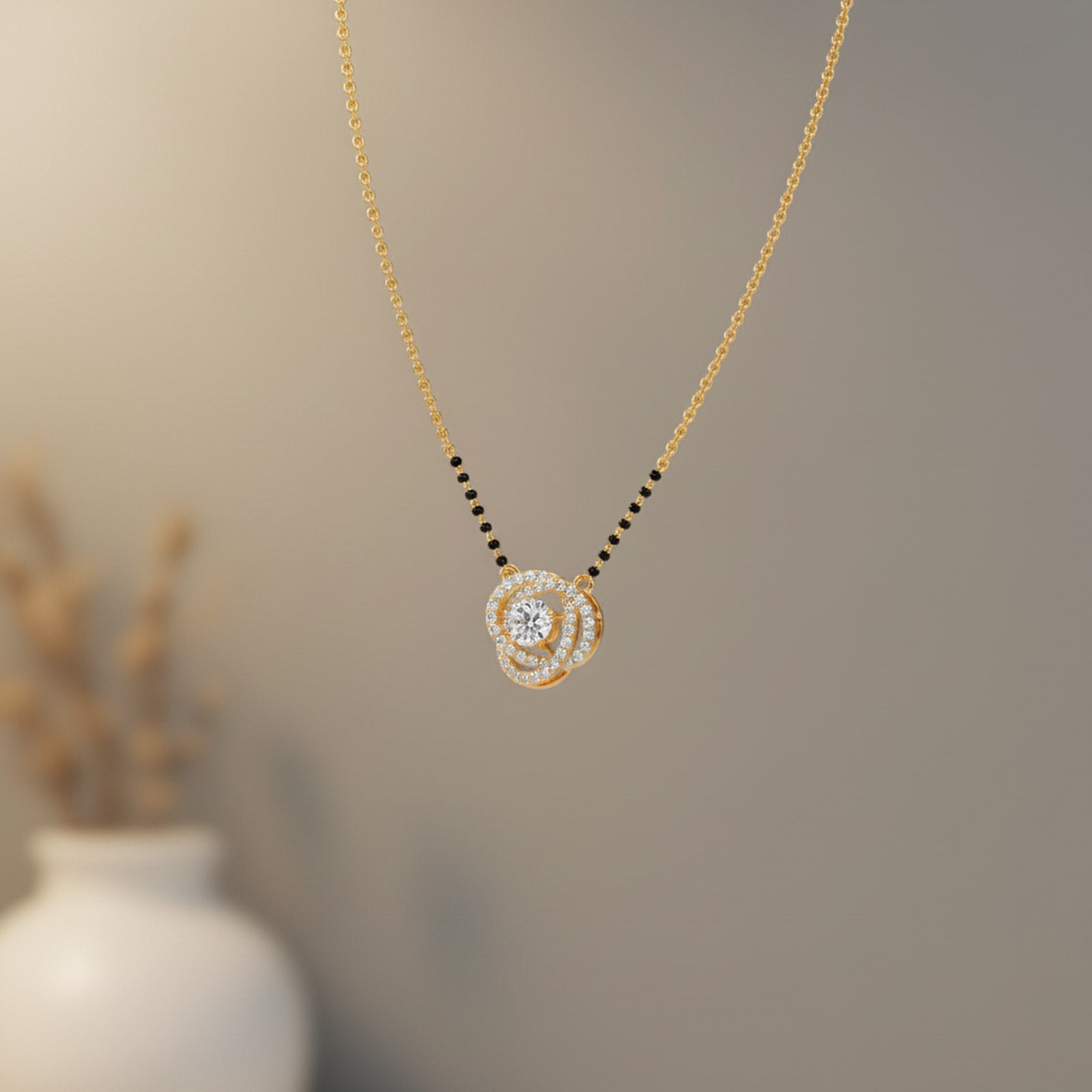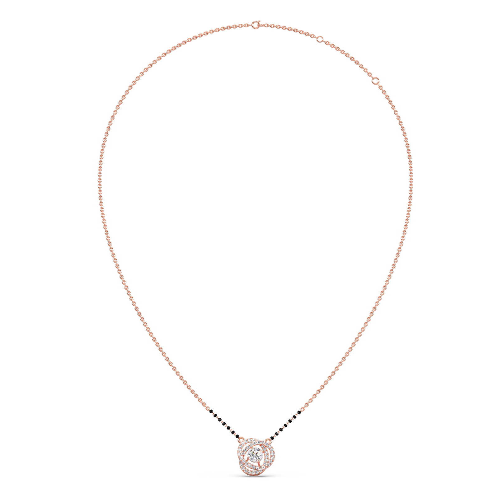 The Swirl Halo Diamond Mangalsutra Necklace is more than just jewelry — it’s a symbol of love wrapped in elegance. A brilliant round diamond sits at the center of an intricate swirl, capturing the beauty of endless togetherness. Paired with delicate black beads, this piece blends tradition with modern charm — perfect for the woman who honors her roots while embracing her own unique journey.