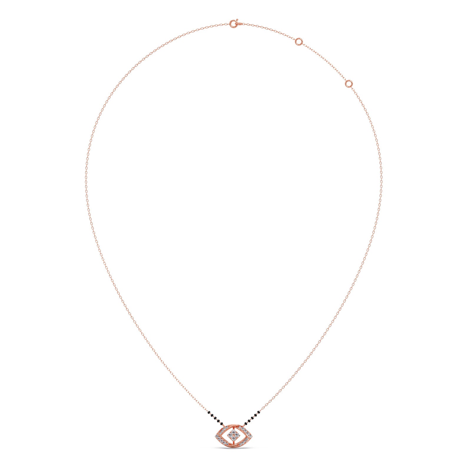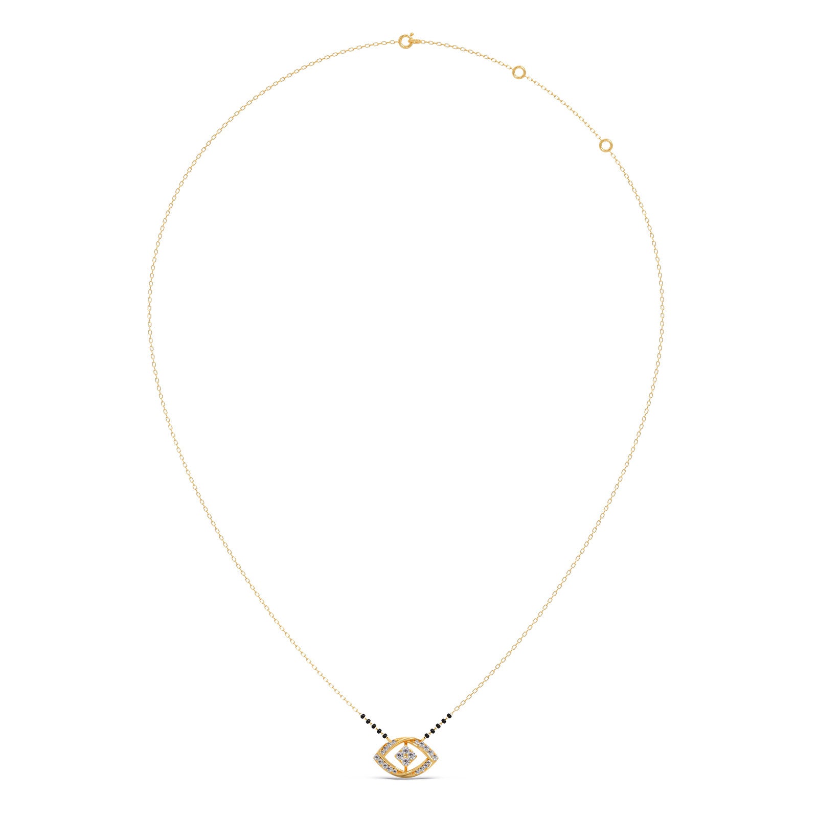 Forever connected, forever yours. Our Eternal Gaze Round Diamond Mangalsutra is a modern symbol of timeless commitment. A single, brilliant round-cut diamond serves as the center of this elegant piece, representing a bond that shines brightly and forever. It's a tribute to a love that is as enduring as a diamond.