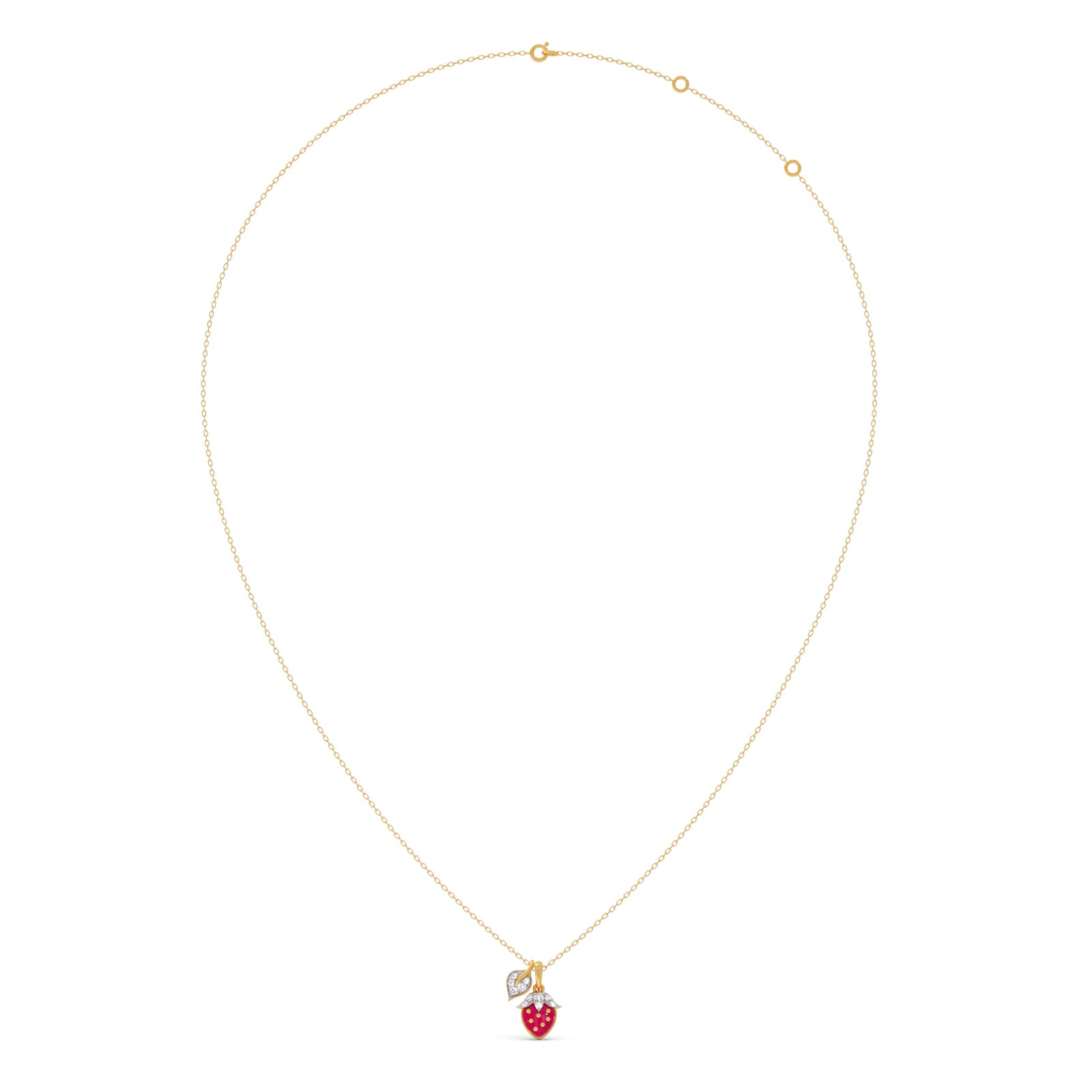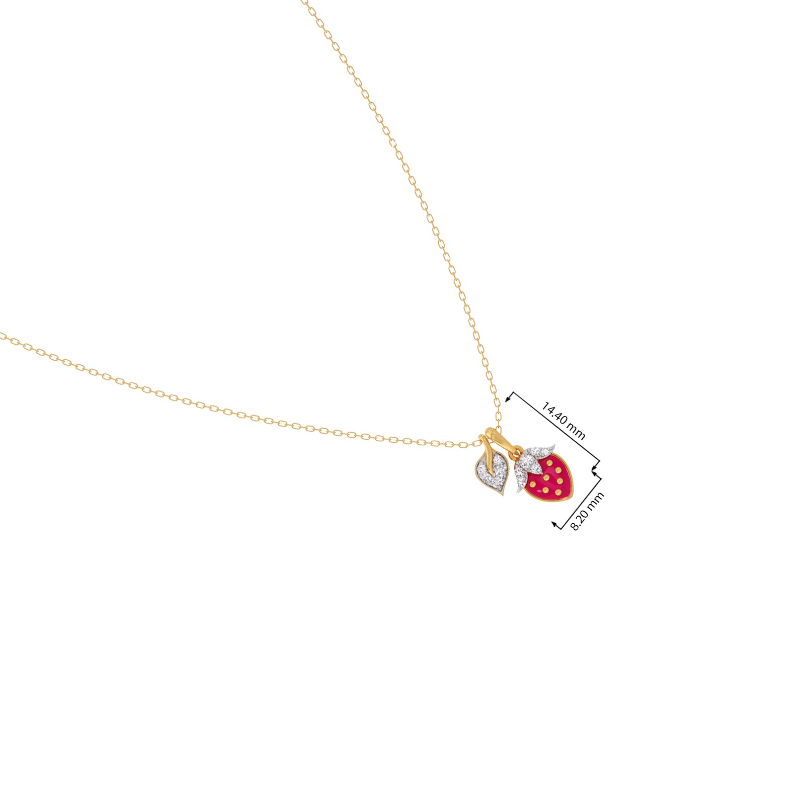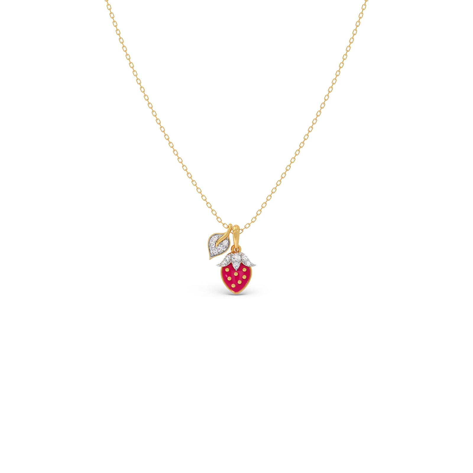 The Leafy Luxe Strawberry Diamond Kids Pendant With Chain- A delightful pendant shaped like a lush strawberry with sparkling diamond accents, bringing a touch of sweetness, charm, and playful luxury to every little one’s look.