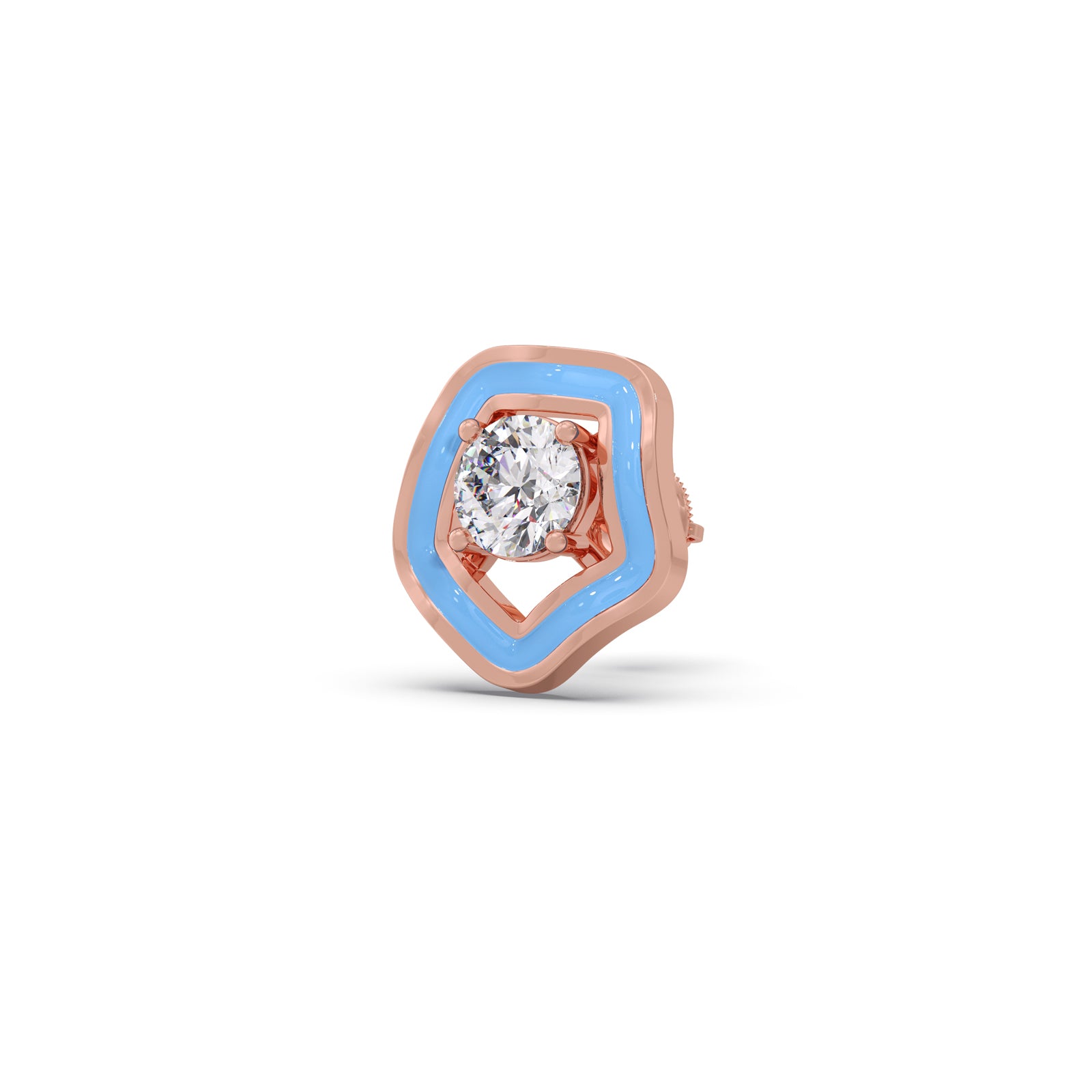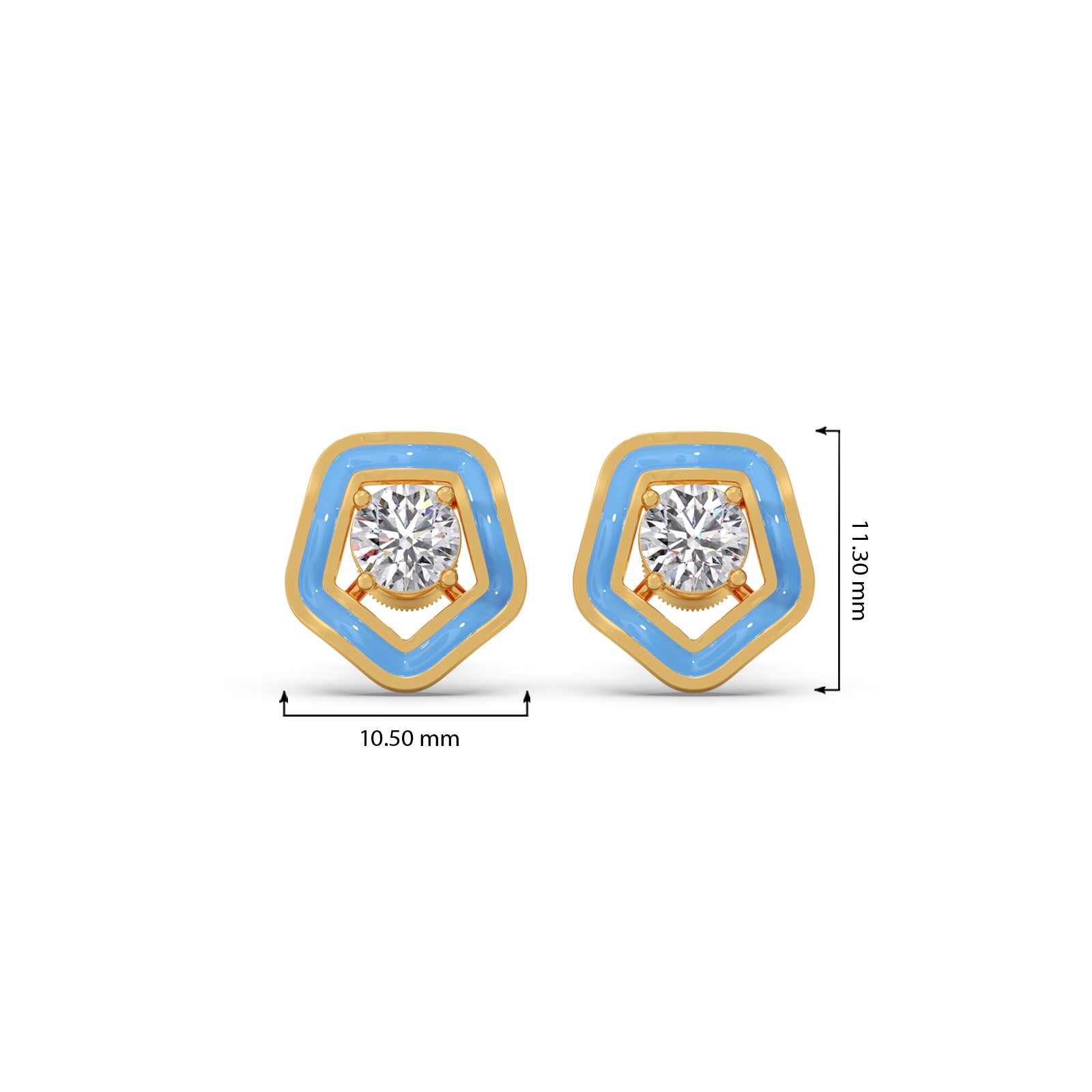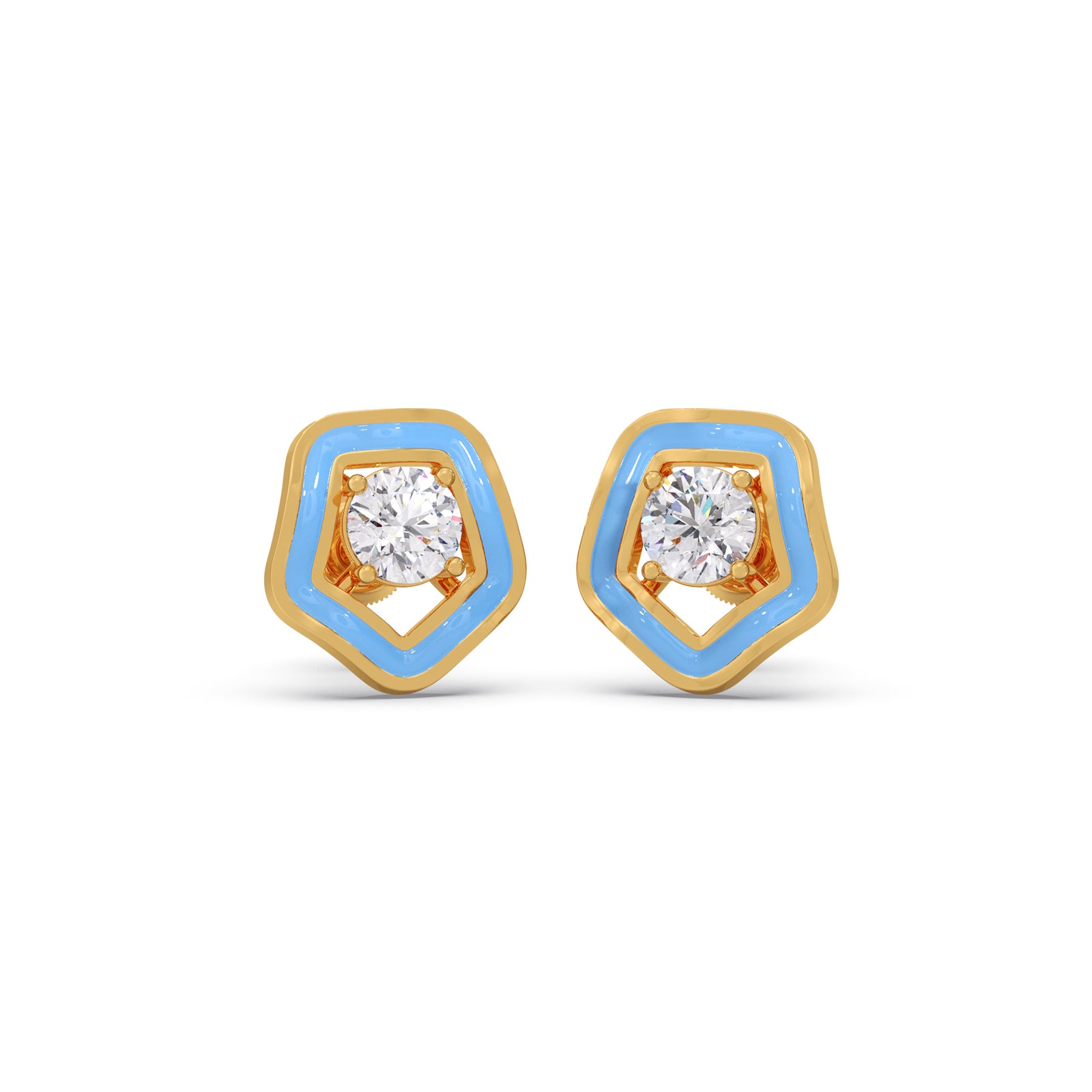 Define your modern look with The Penta Solitaire Studs. These unique earrings feature a brilliant diamond set within a layered frame of polished gold and vibrant sky-blue enamel. The soft, pentagon-like shape offers an artistic, geometric edge that's truly eye-catching.