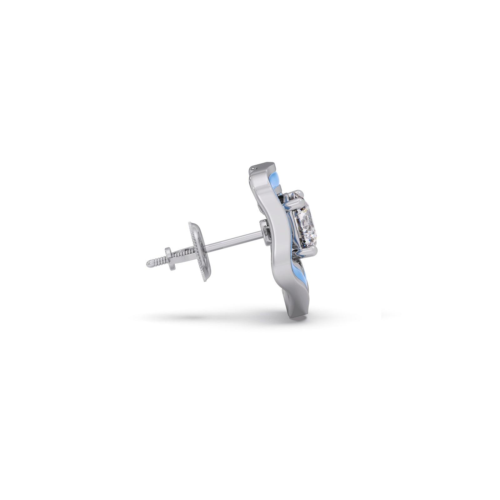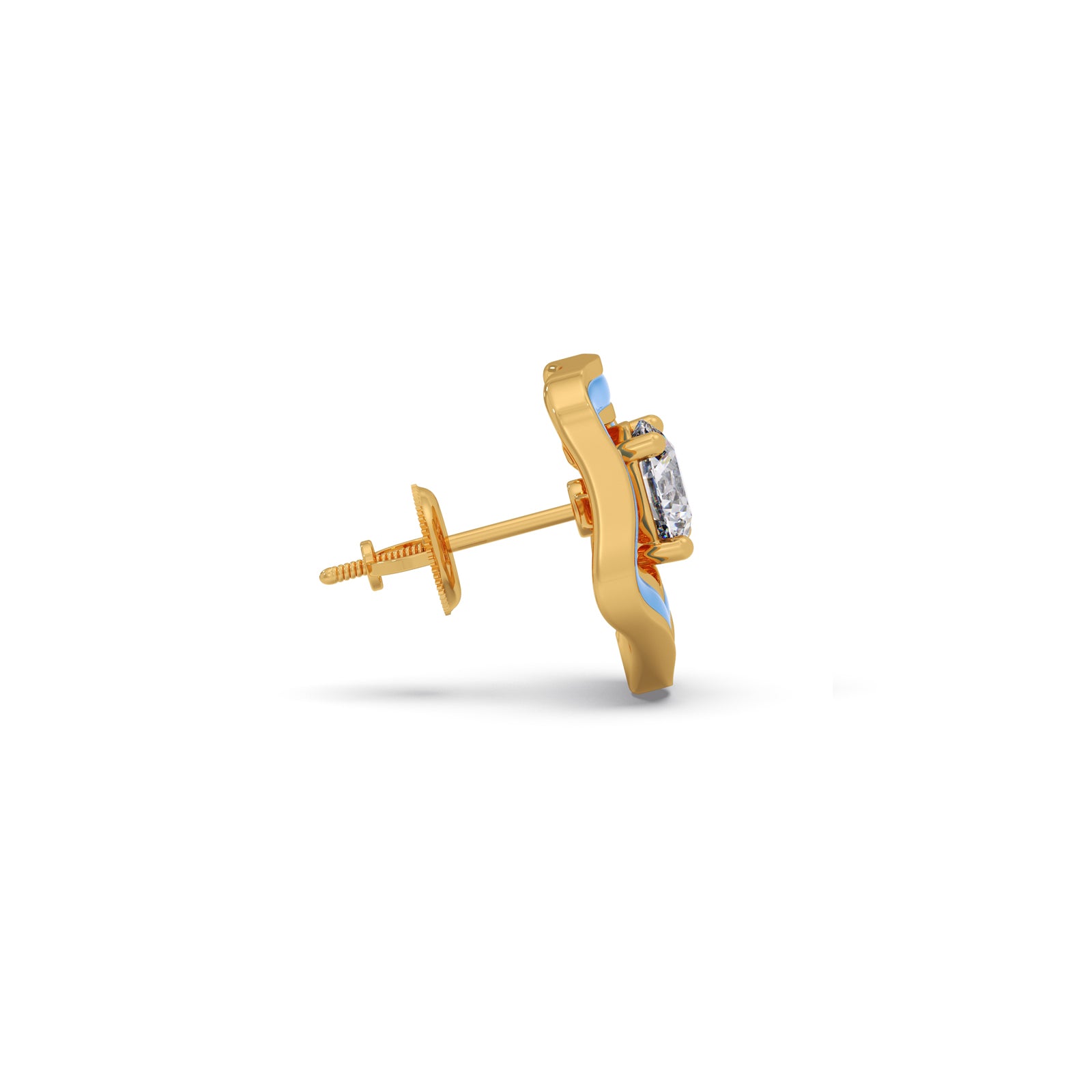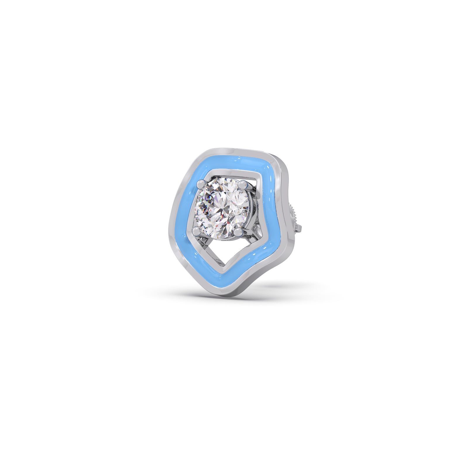Define your modern look with The Penta Solitaire Studs. These unique earrings feature a brilliant diamond set within a layered frame of polished gold and vibrant sky-blue enamel. The soft, pentagon-like shape offers an artistic, geometric edge that's truly eye-catching.