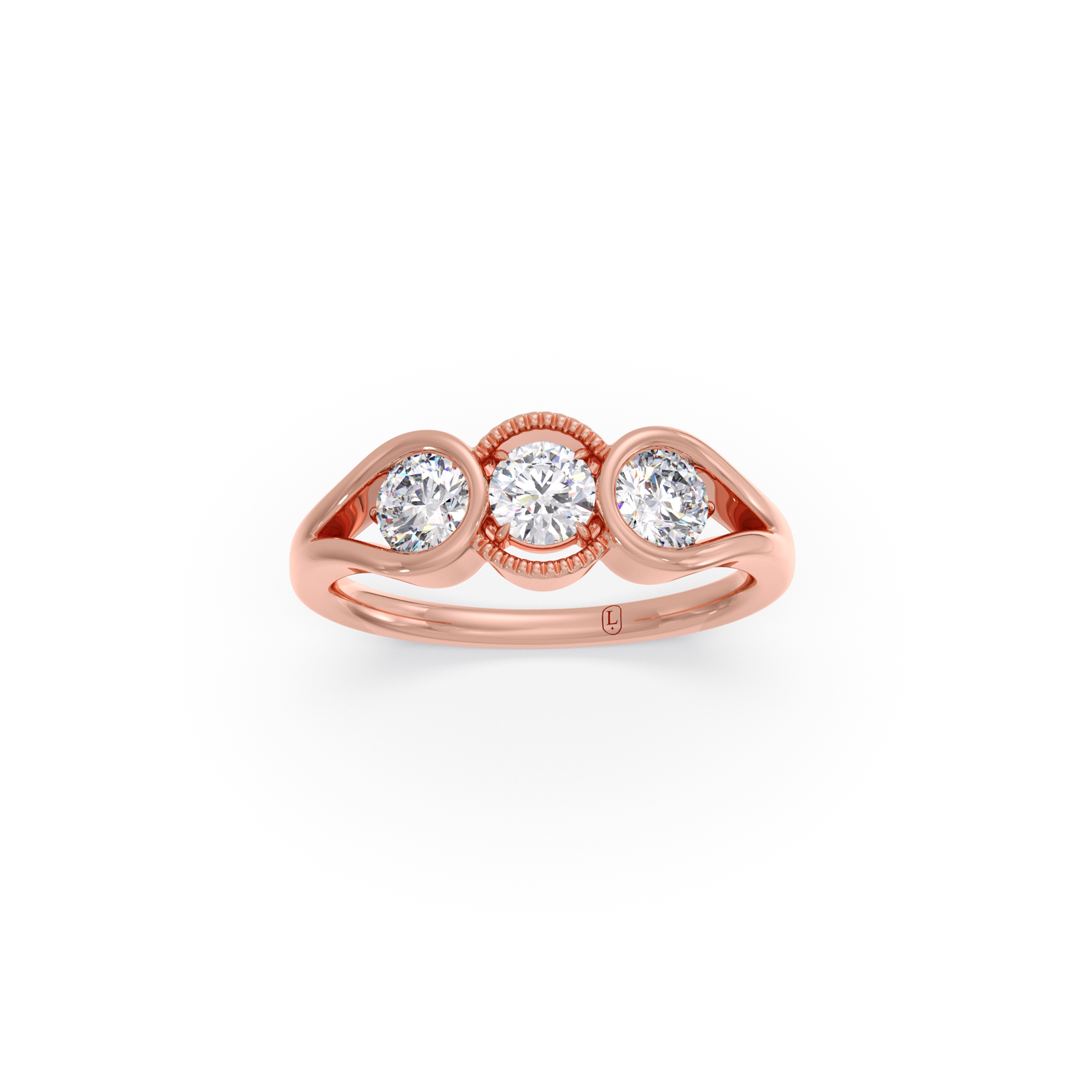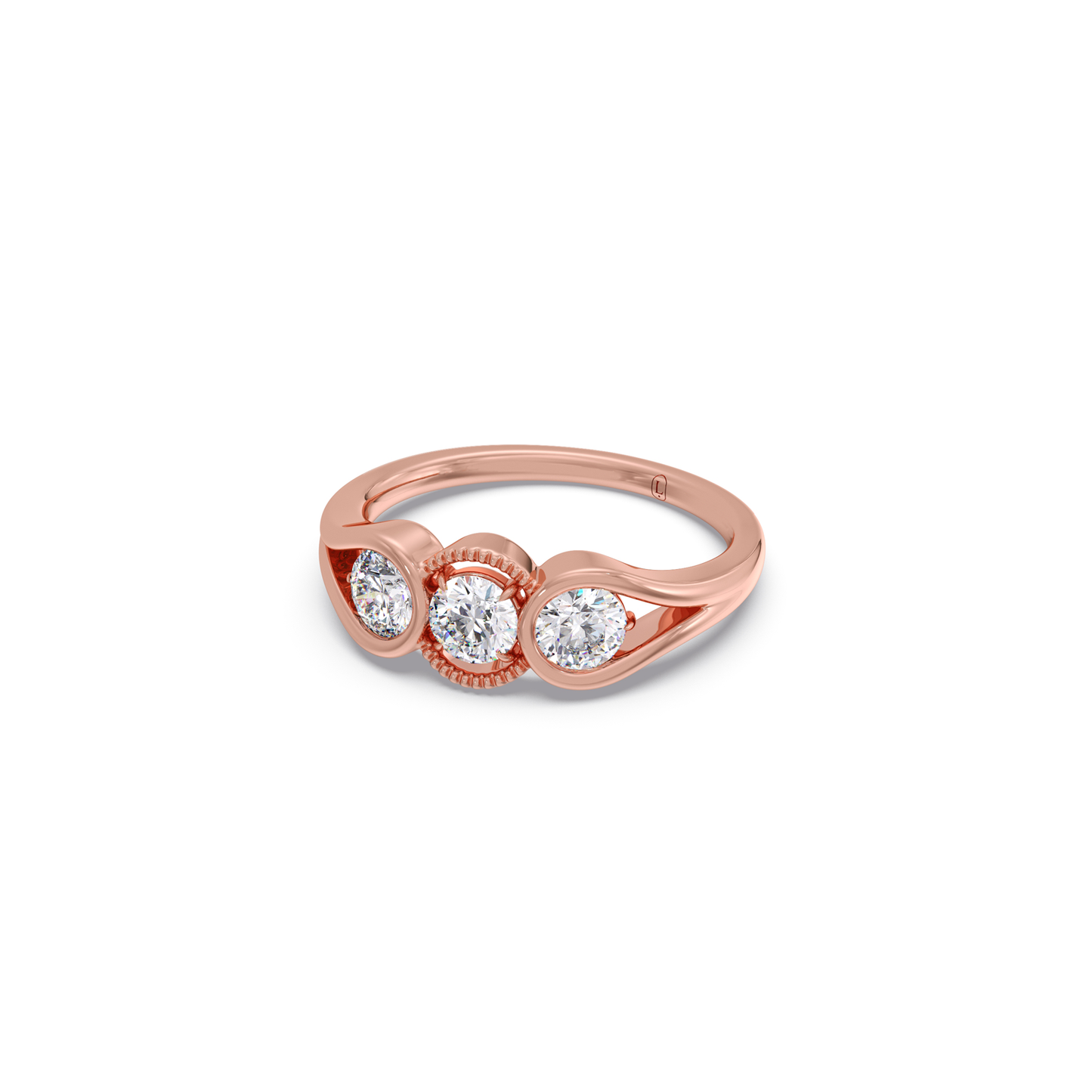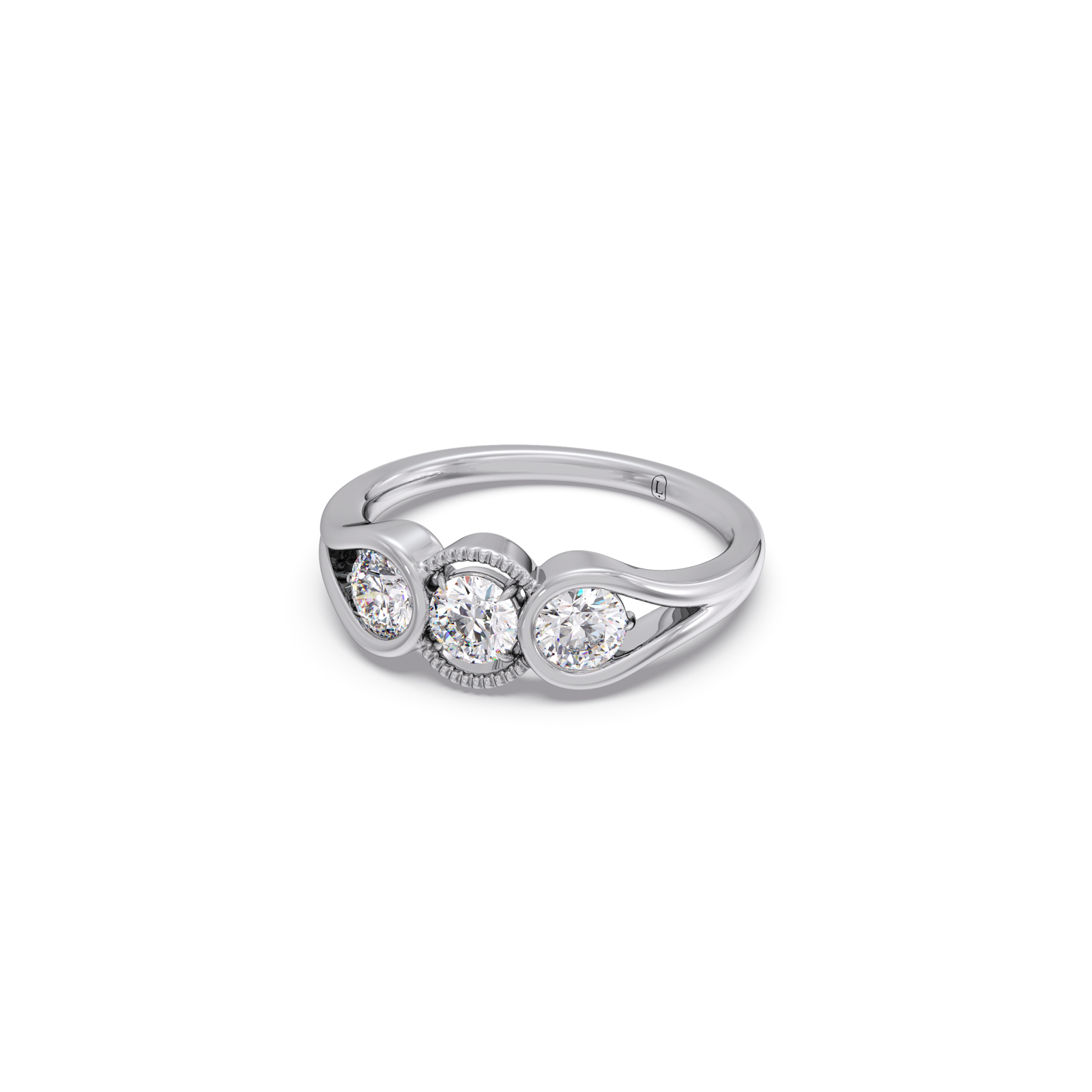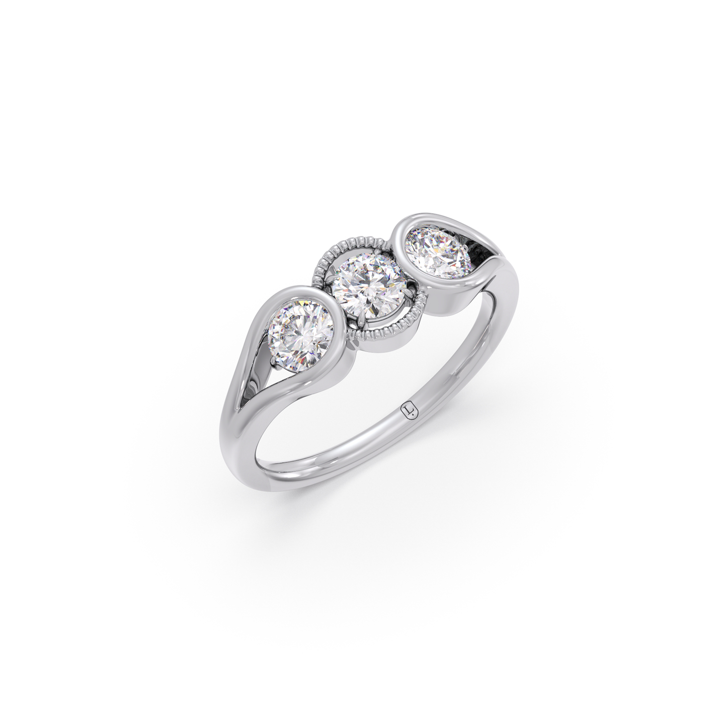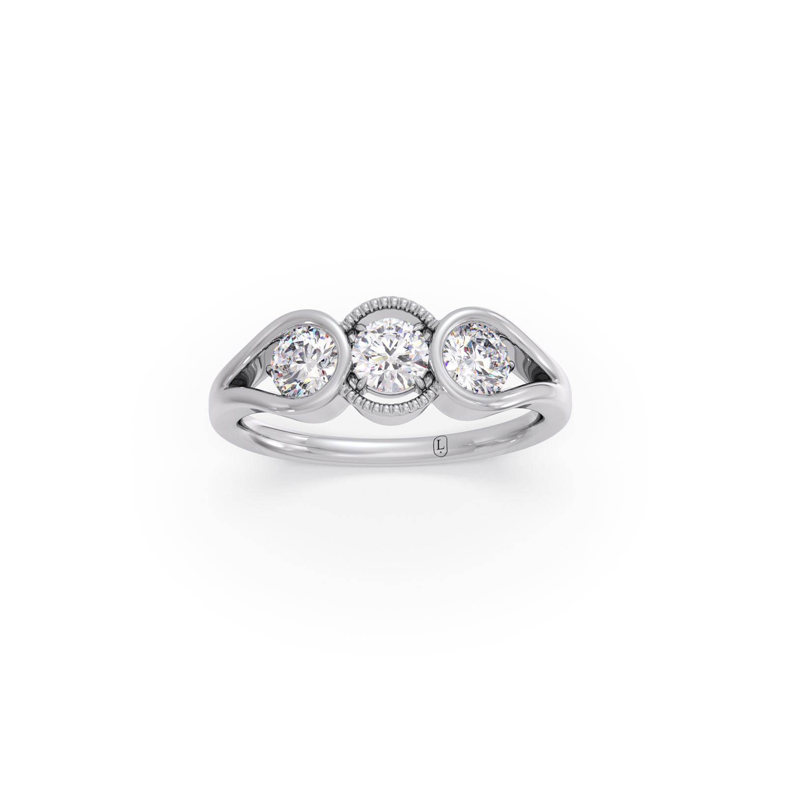 Inspired by the journey of a love story, this three-stone ring features a trio of brilliant round-cut diamonds. The stones are elegantly set within a flowing gold band with unique textured details, symbolizing your past, present, and future. This piece is a beautiful and meaningful token of your commitment.
