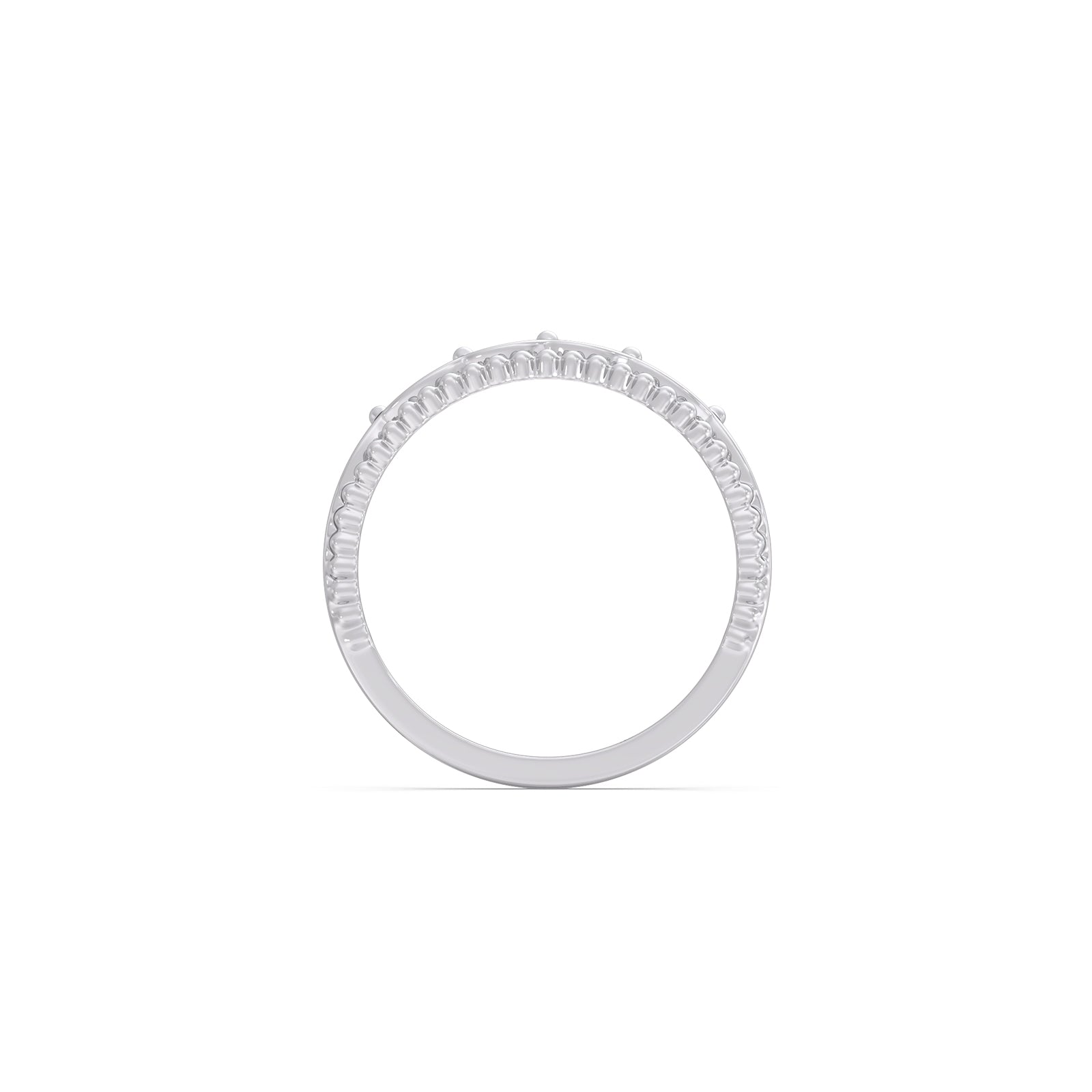 This gold ring features a tiara or crown silhouette on the top half of the ring, with beaded or milgrain texture band. This ring represents the delicate lightweight and comfortable for daily wear.
