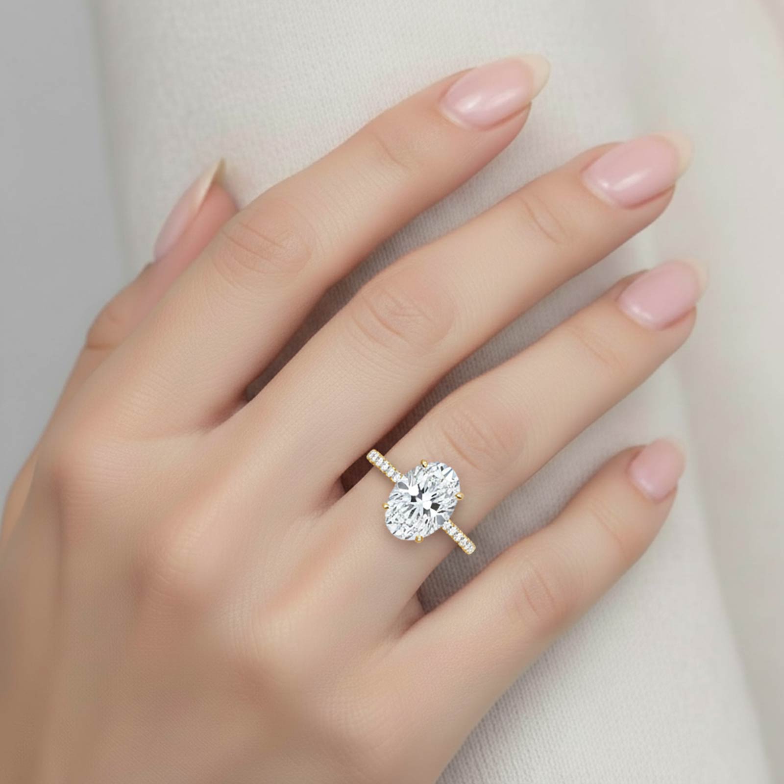 The Timeless Four-prong Oval Cut Engagement ring, showcasing a 7.80mm oval brilliant-cut diamond radiates elegance and sophistication. The rings timeless design, captured in a close-up shot, highlights the intricate details of the setting and the diamond's brilliant sparkle.