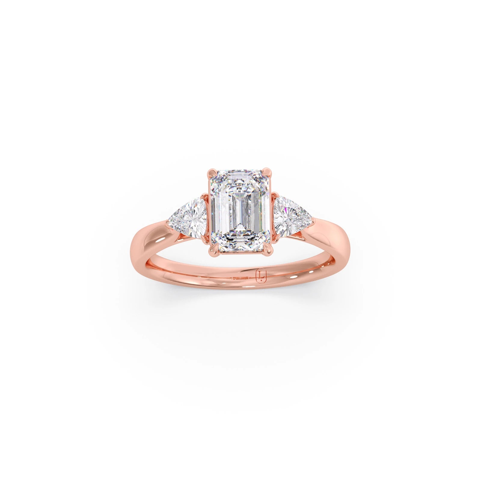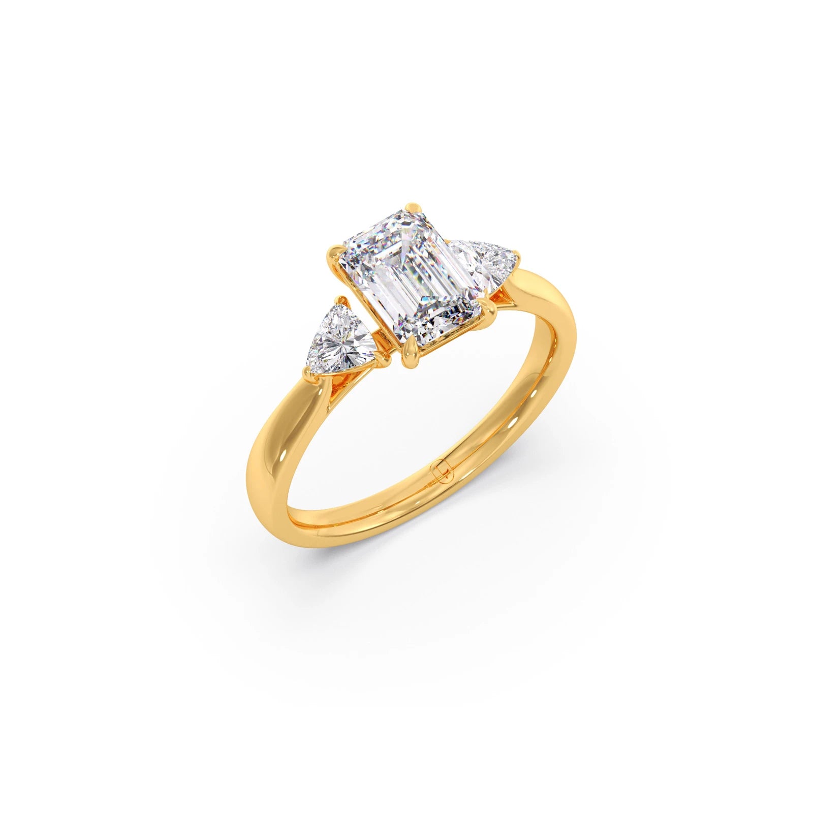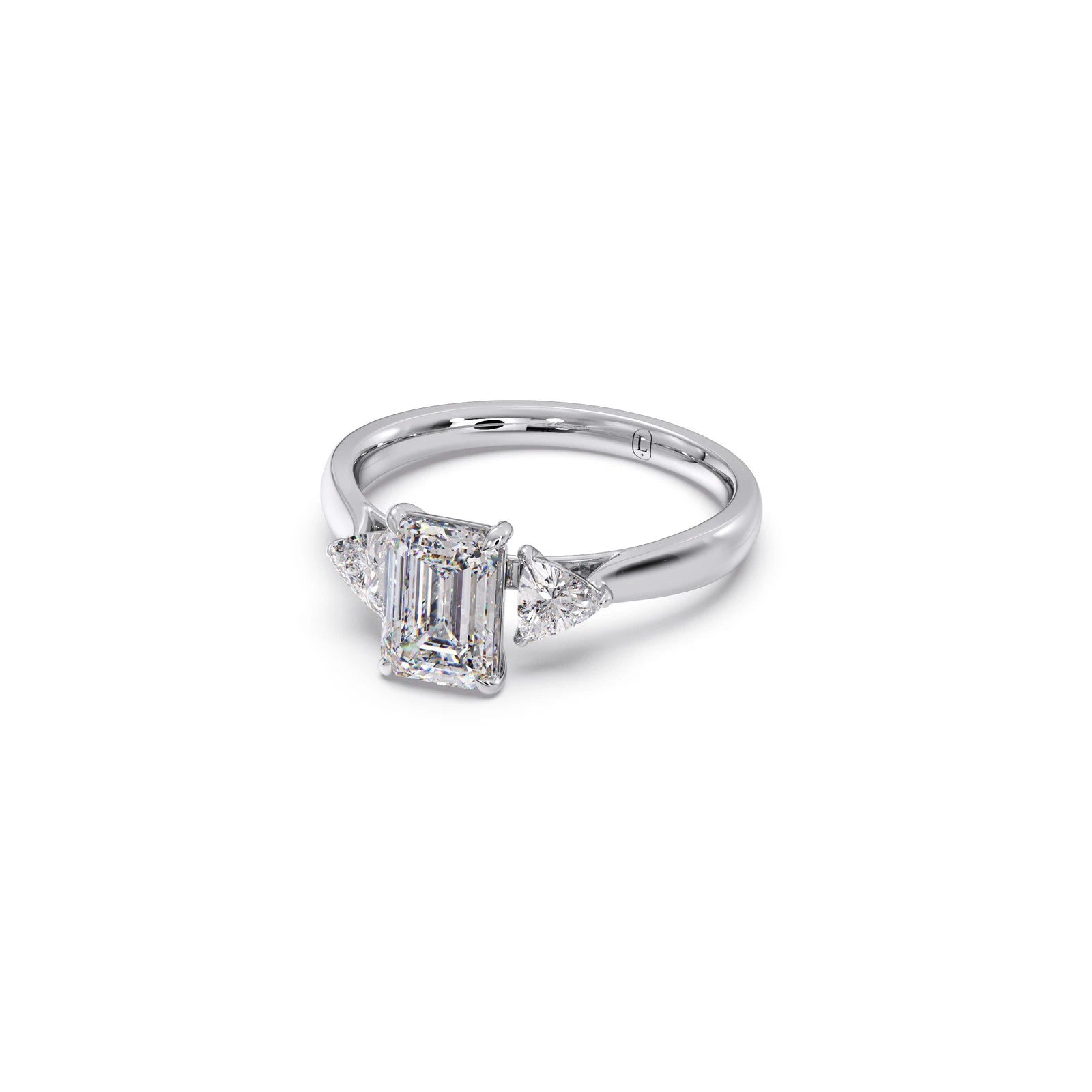 A vibrant emerald takes center stage in this captivating trilogy ring, flanked by two brilliant trillion-cut diamonds. Representing past, present, and future, this design beautifully balances rich green hues with the sharp, modern sparkle of the diamonds, all set in a sleek band for timeless elegance.