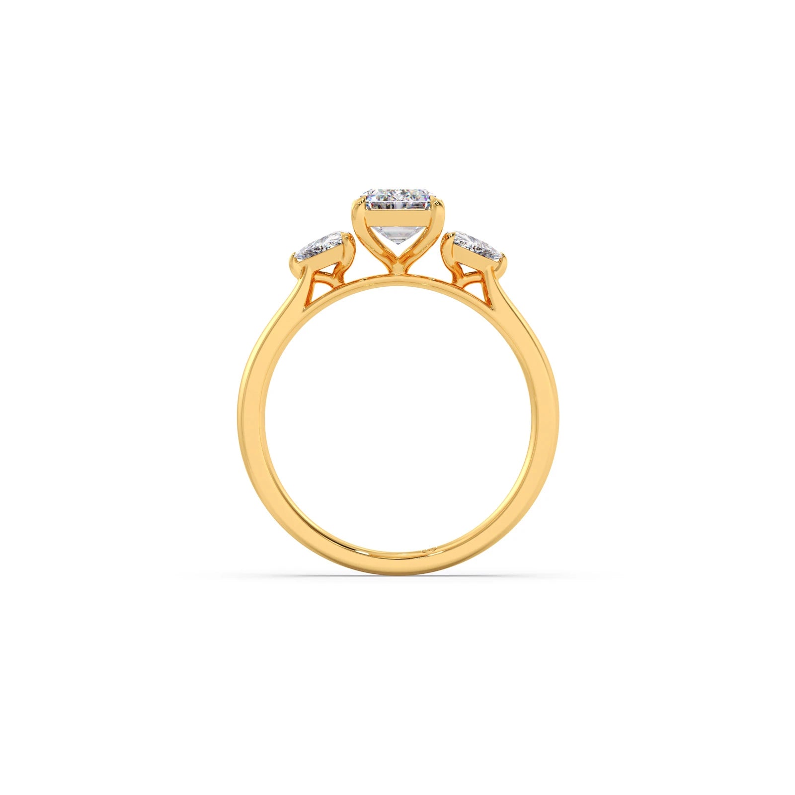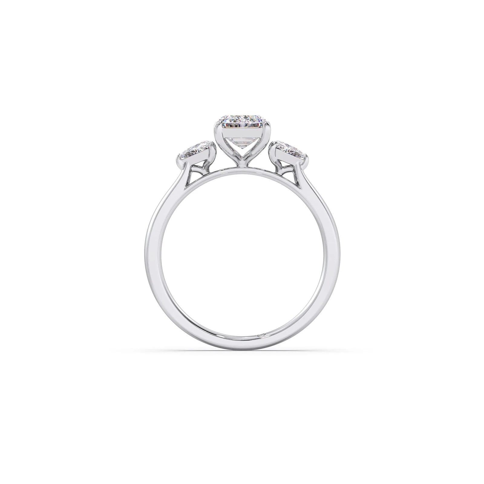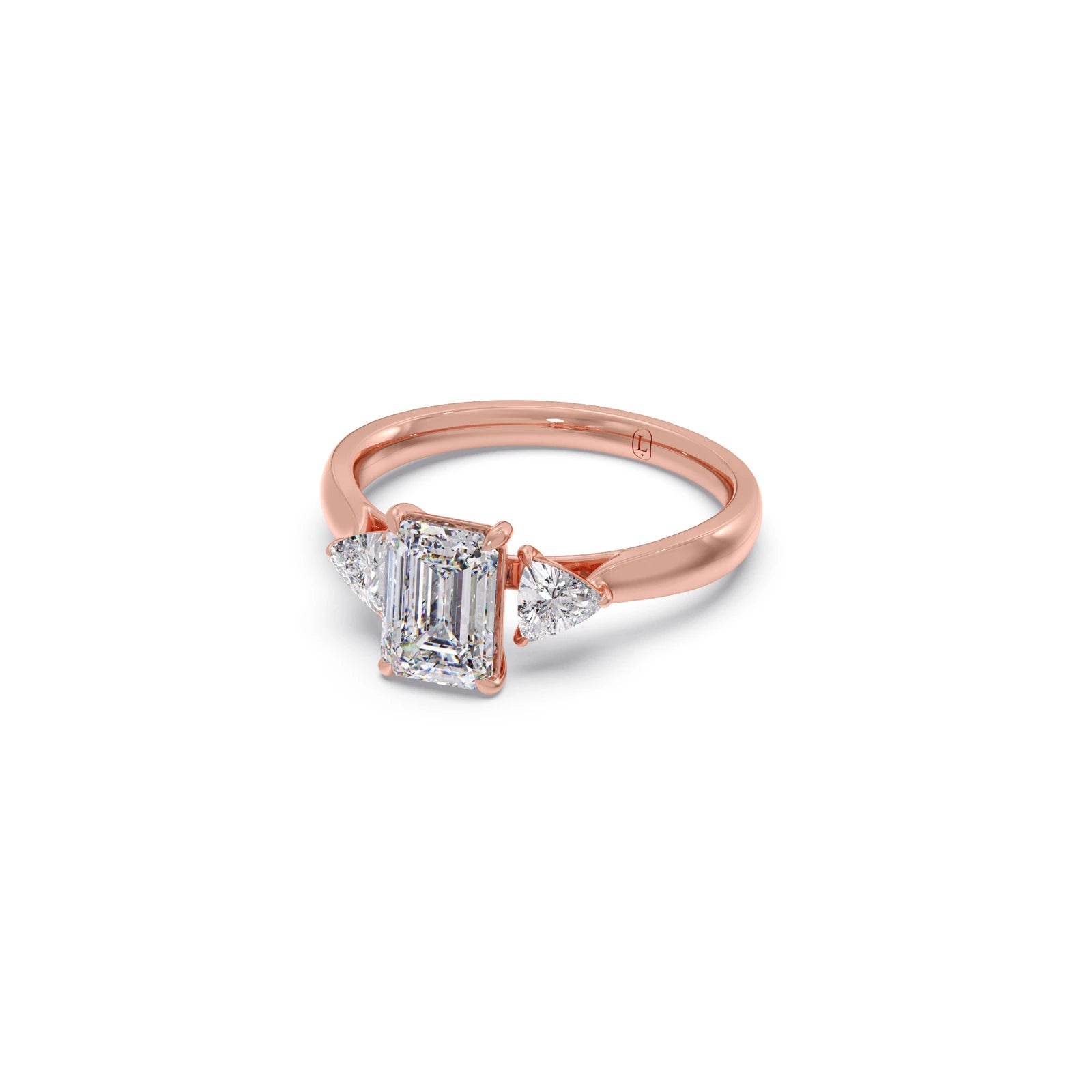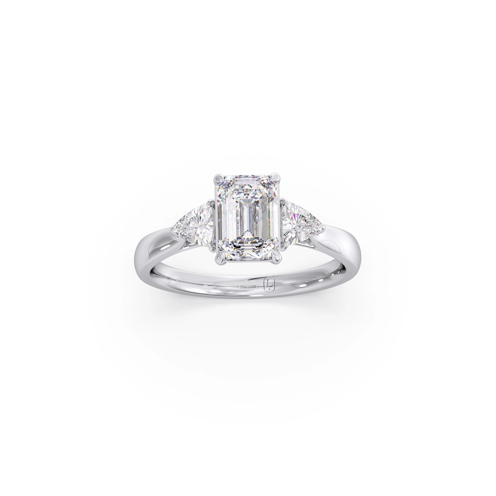 A vibrant emerald takes center stage in this captivating trilogy ring, flanked by two brilliant trillion-cut diamonds. Representing past, present, and future, this design beautifully balances rich green hues with the sharp, modern sparkle of the diamonds, all set in a sleek band for timeless elegance.