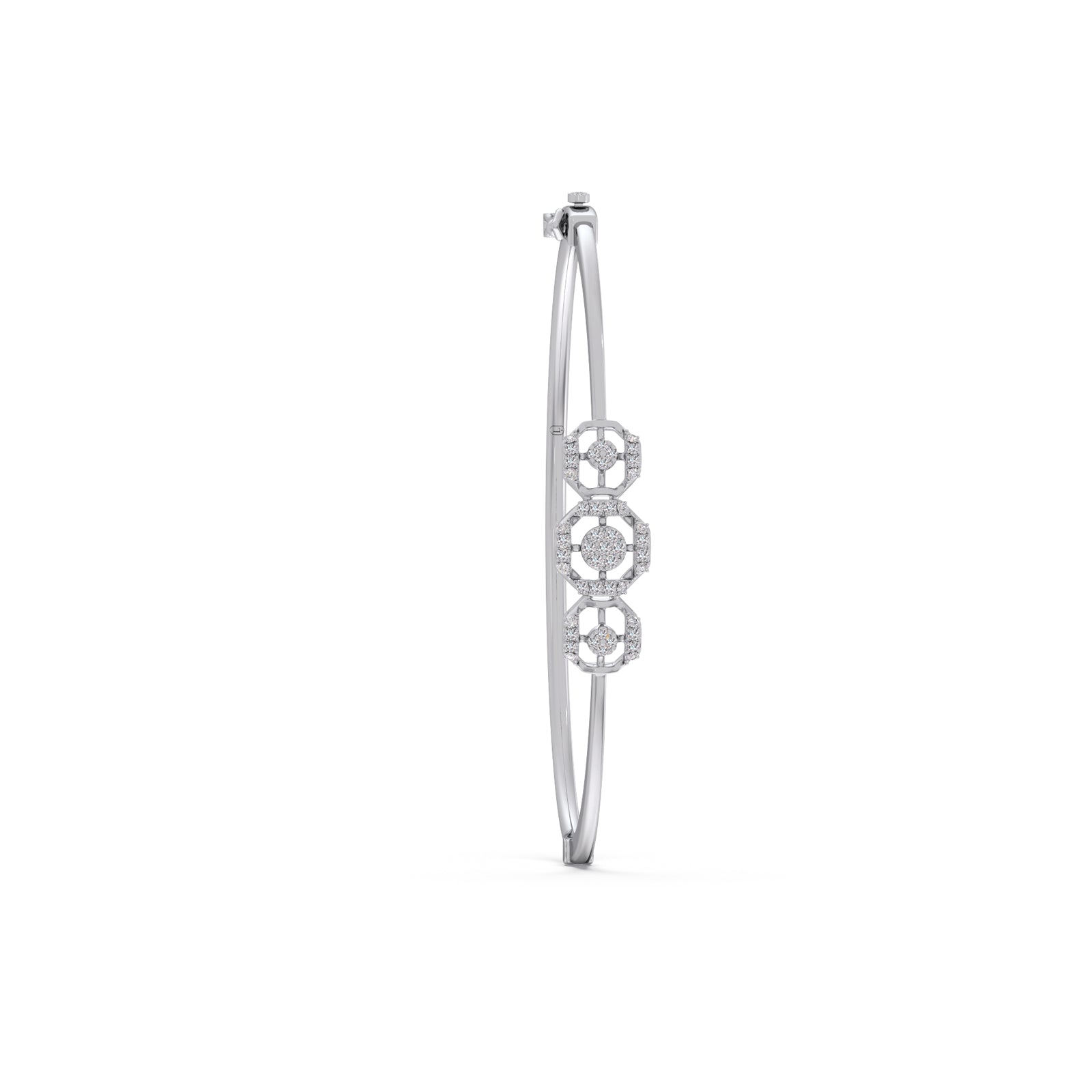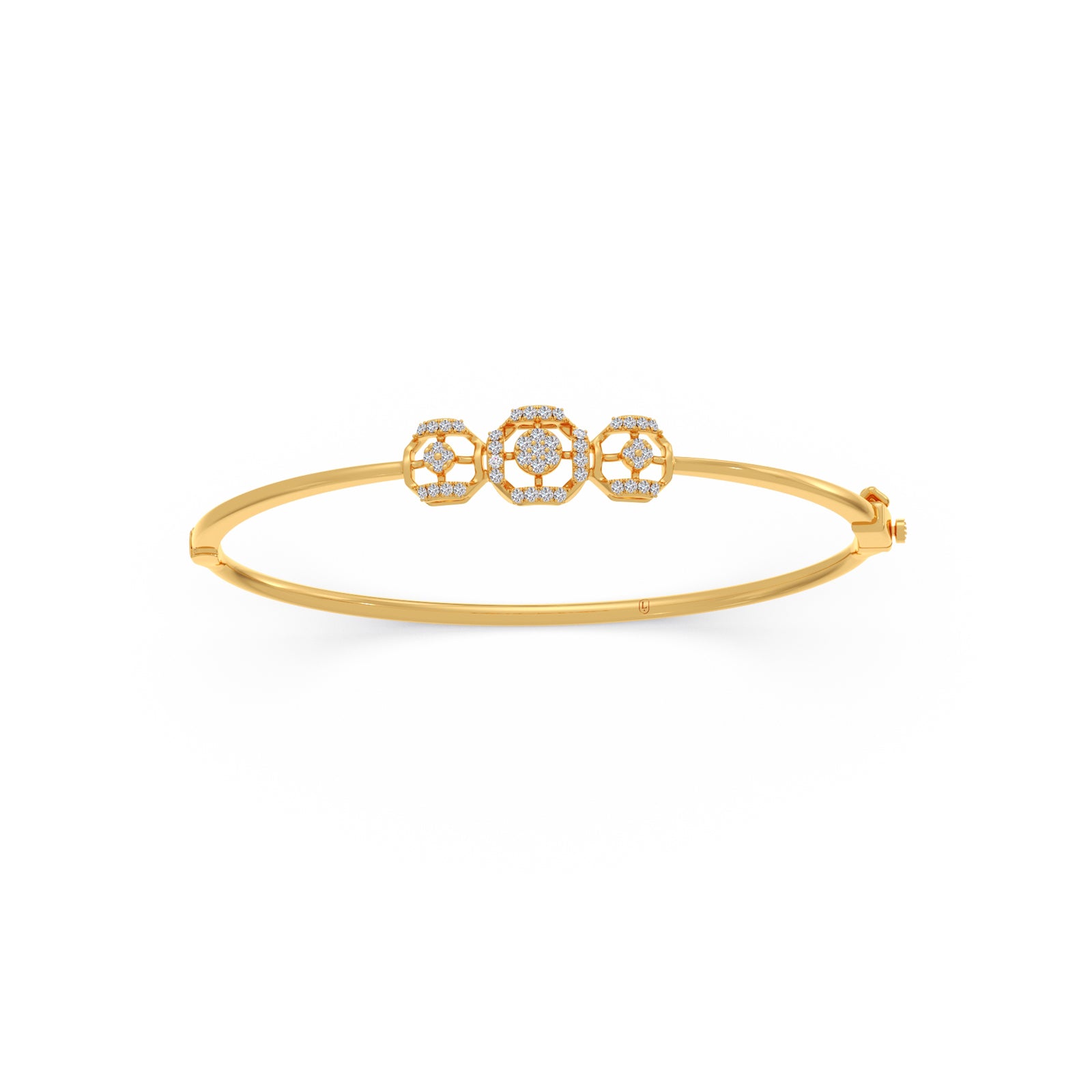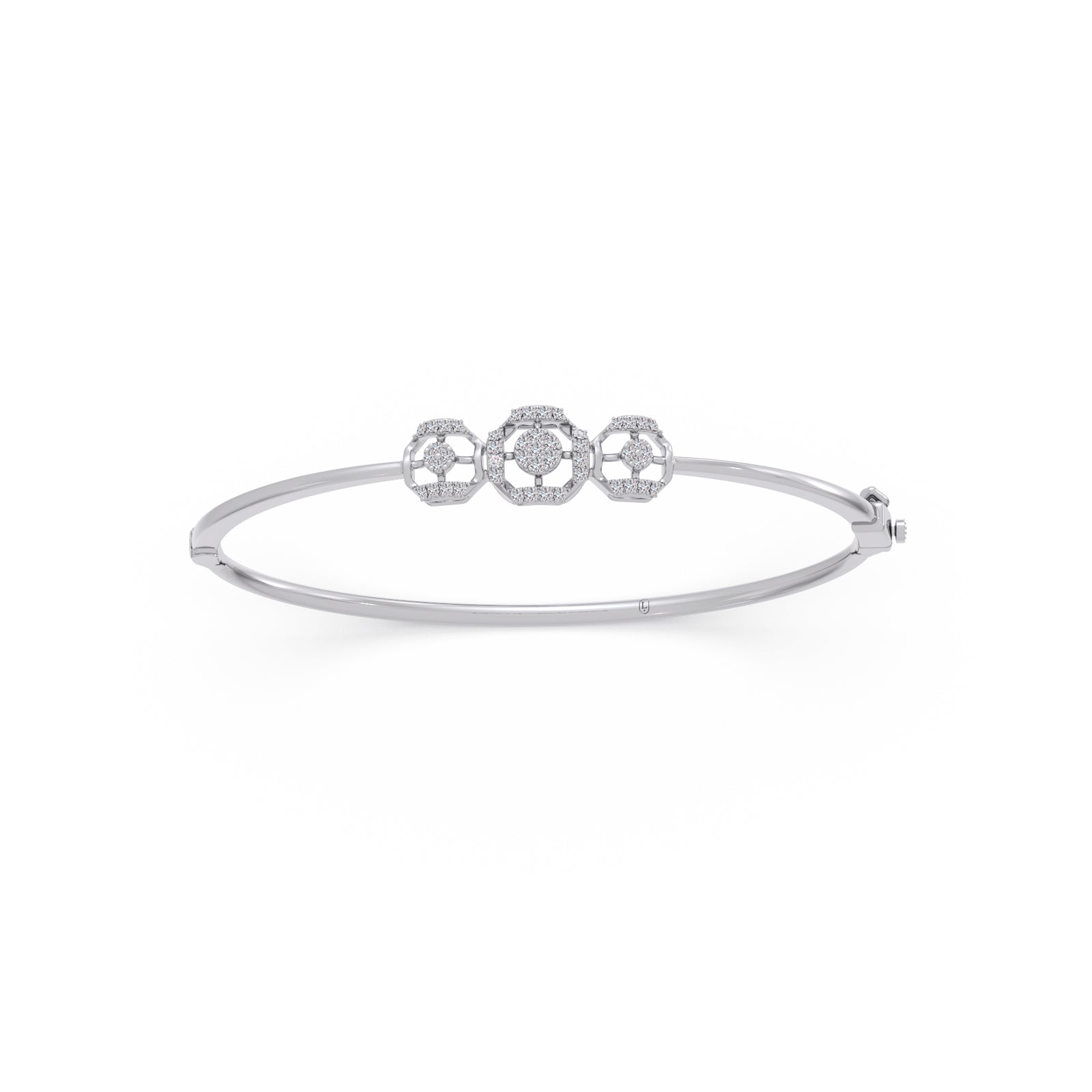 A refined cuff bracelet featuring three interlinked halo frames, each adorned with brilliant Round Diamonds. The connected circular design symbolizes unity and elegance, creating a radiant, timeless piece perfect for both everyday wear and special occasions.