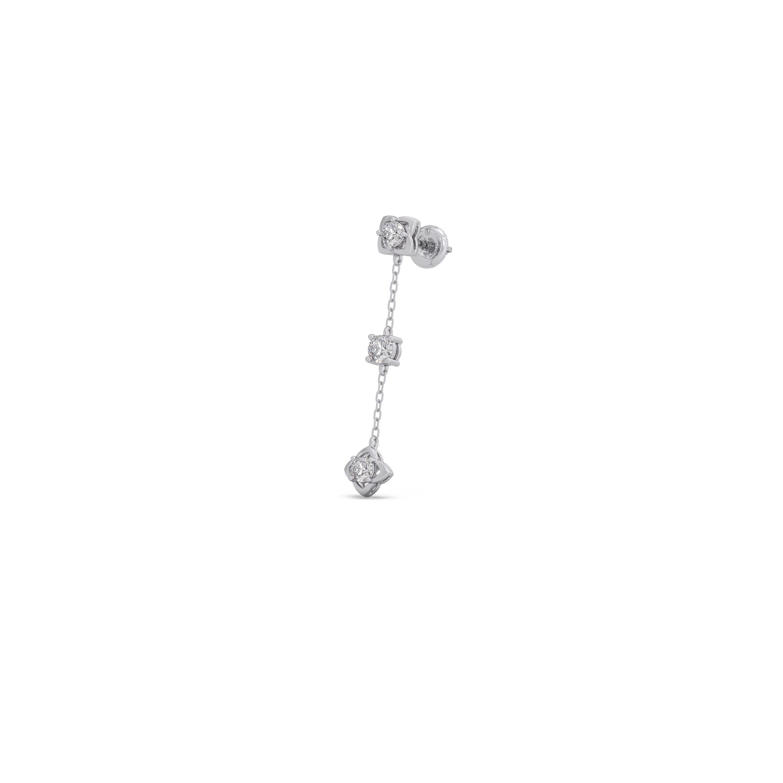 This earrings features a delicate, linear design that balances classic floral motifs with modern fluidity. Each earring showcases three distinct floral-inspired parts, each part consists of a brilliant round-cut diamond held within a unique dangling gold chain. Making them an ideal statement piece that remains delicate enough for daytime wear.