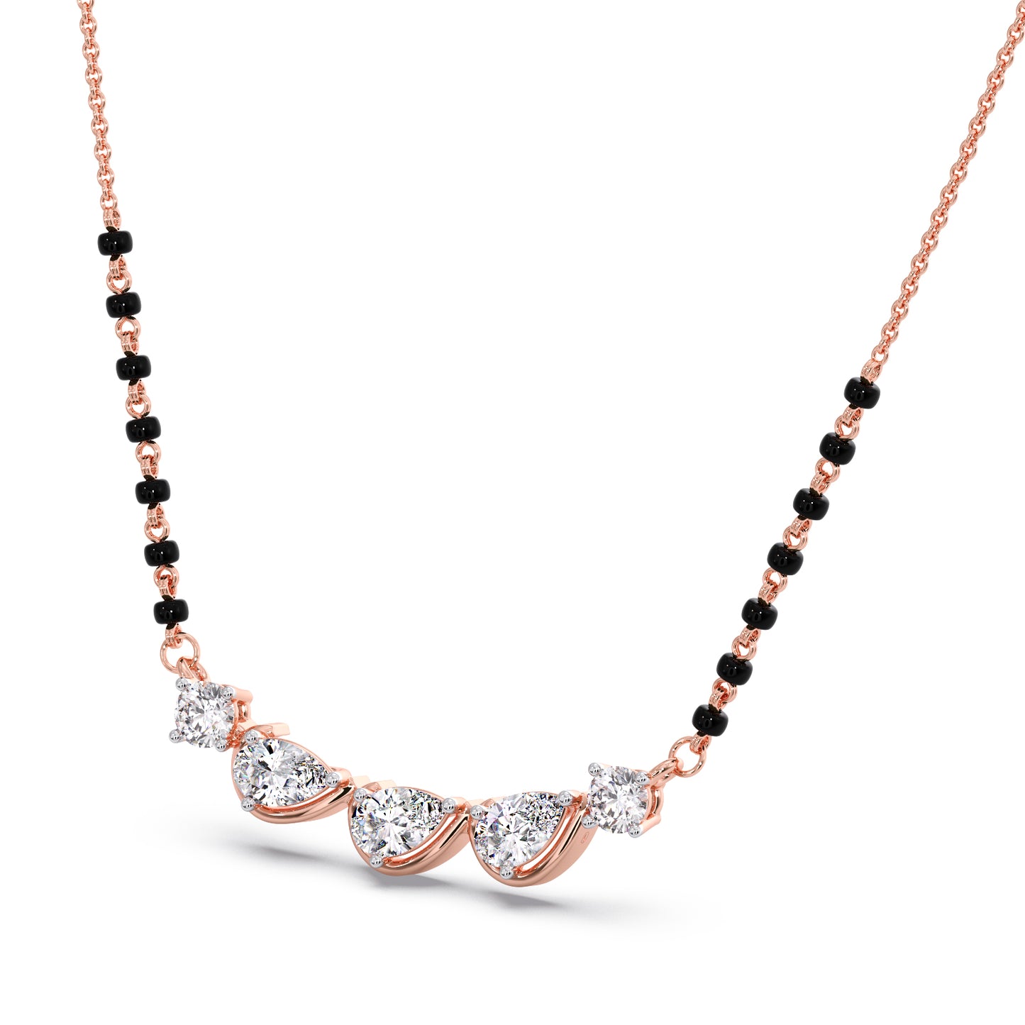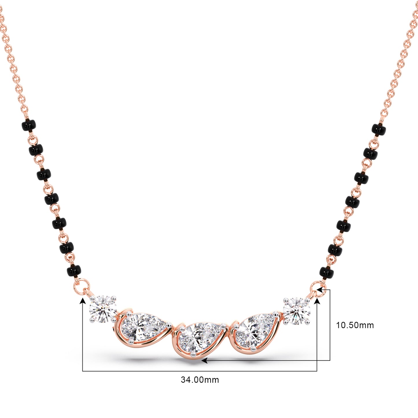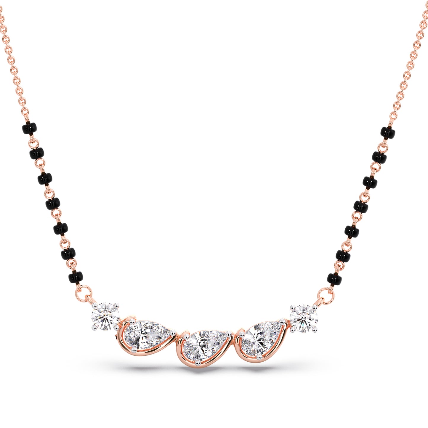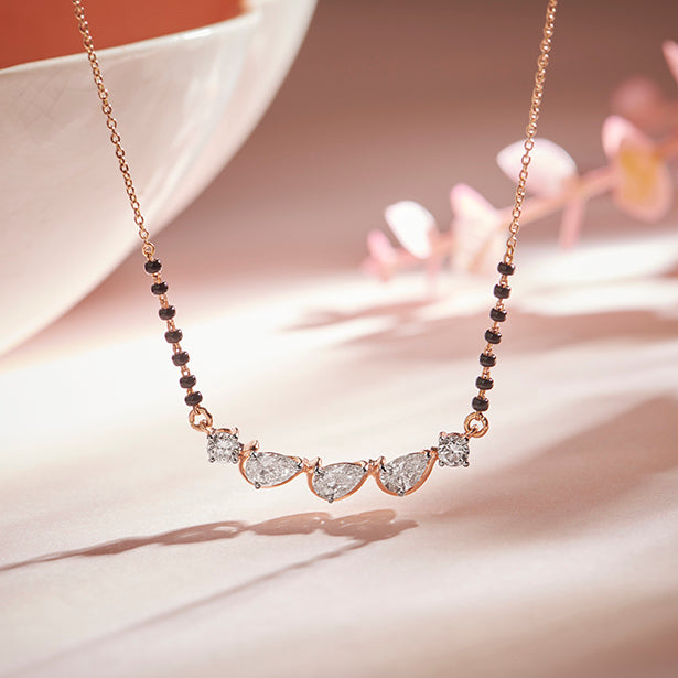 Grace meets tradition in this stunning mangalsutra, featuring three dazzling pear-cut diamonds set in warm rose gold. Delicate round diamonds and classic black beads add a touch of timeless elegance, making it a perfect symbol of love and commitment.