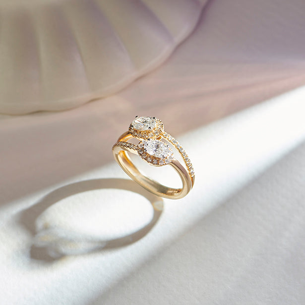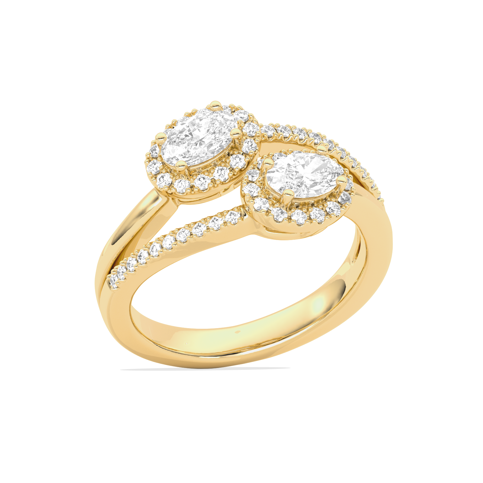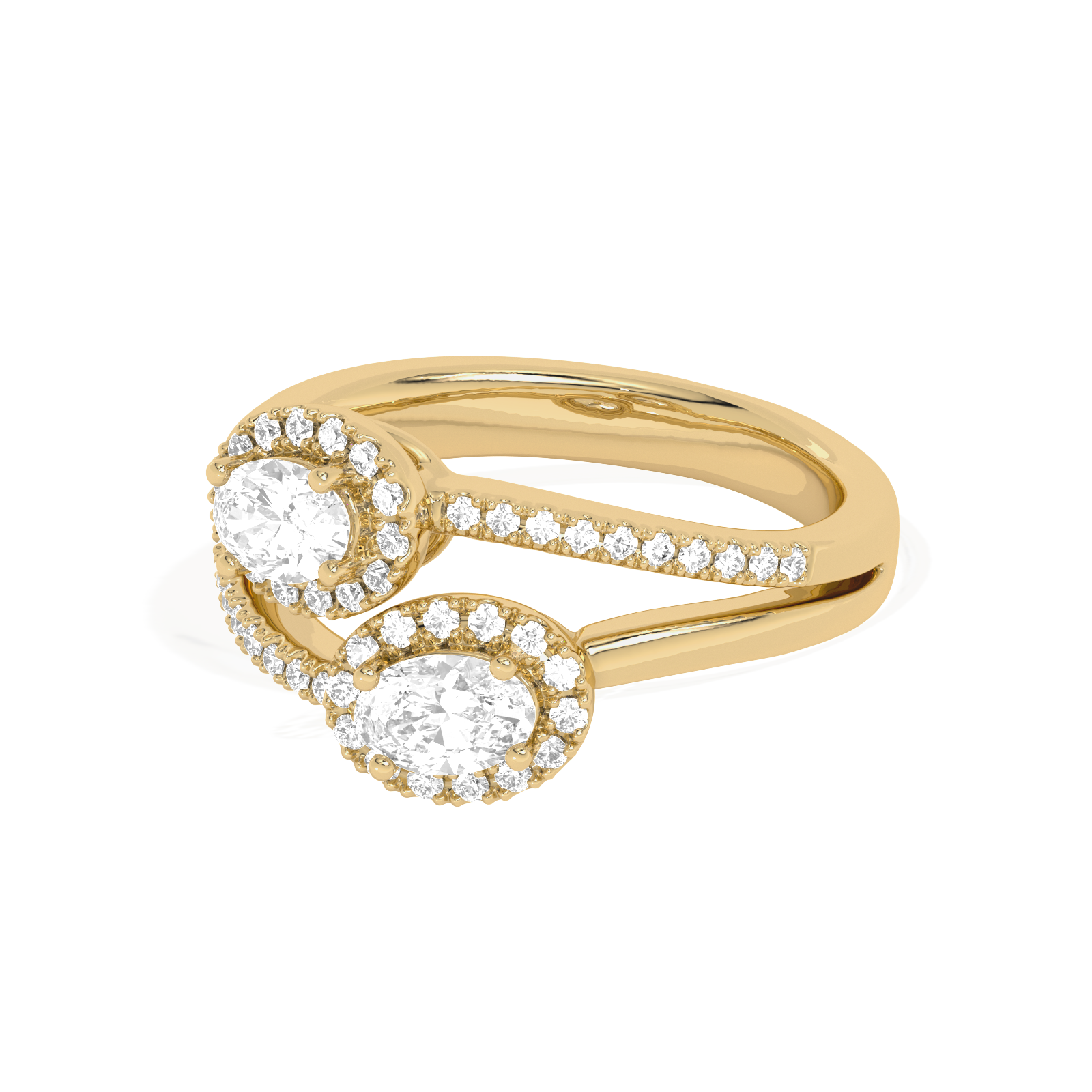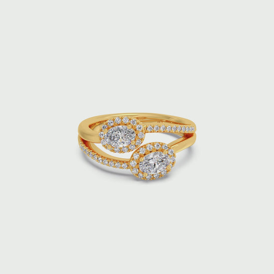 This stunning Two Oval Halo Engagement Ring is a symbol of love and partnership, beautifully crafted in radiant yellow gold. Featuring two dazzling oval-cut lab-grown diamonds, each encircled by a delicate halo of shimmering accent stones, this ring exudes elegance and brilliance. The split-shank band is adorned with pave diamonds, adding an extra layer of sparkle and sophistication.