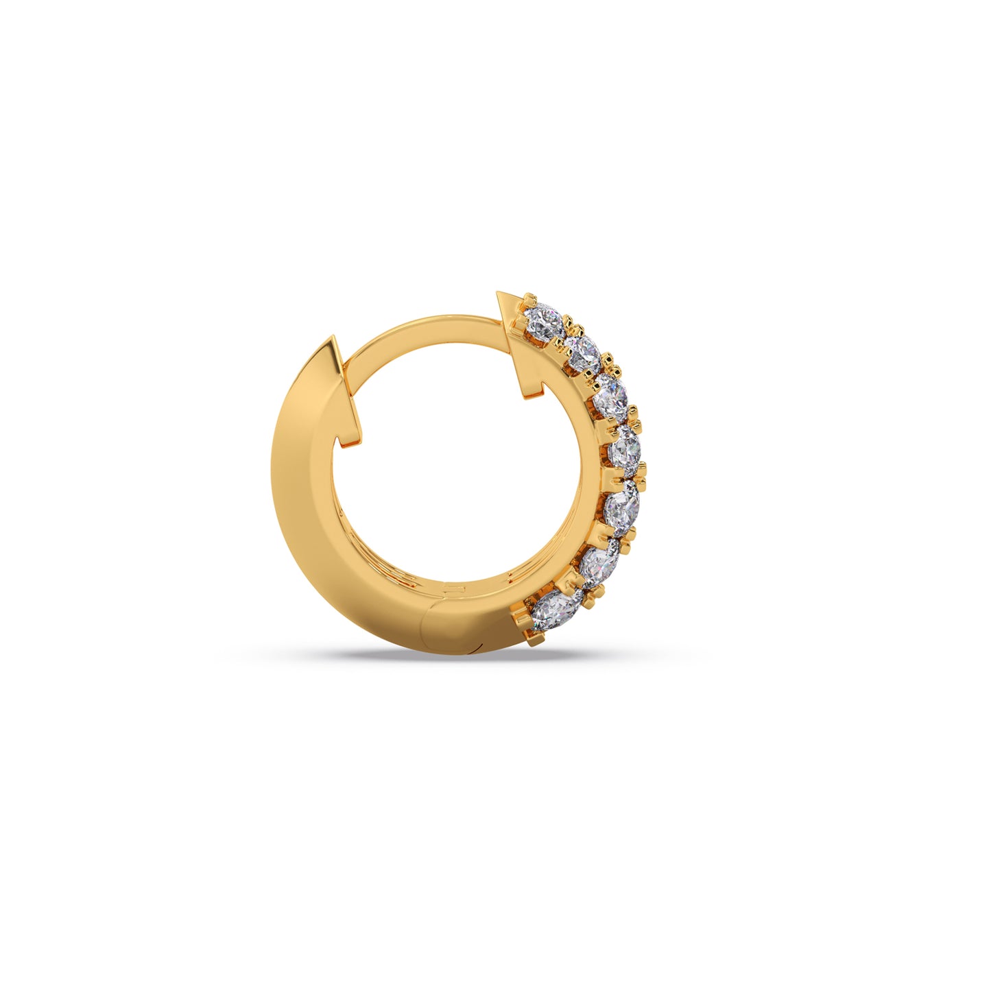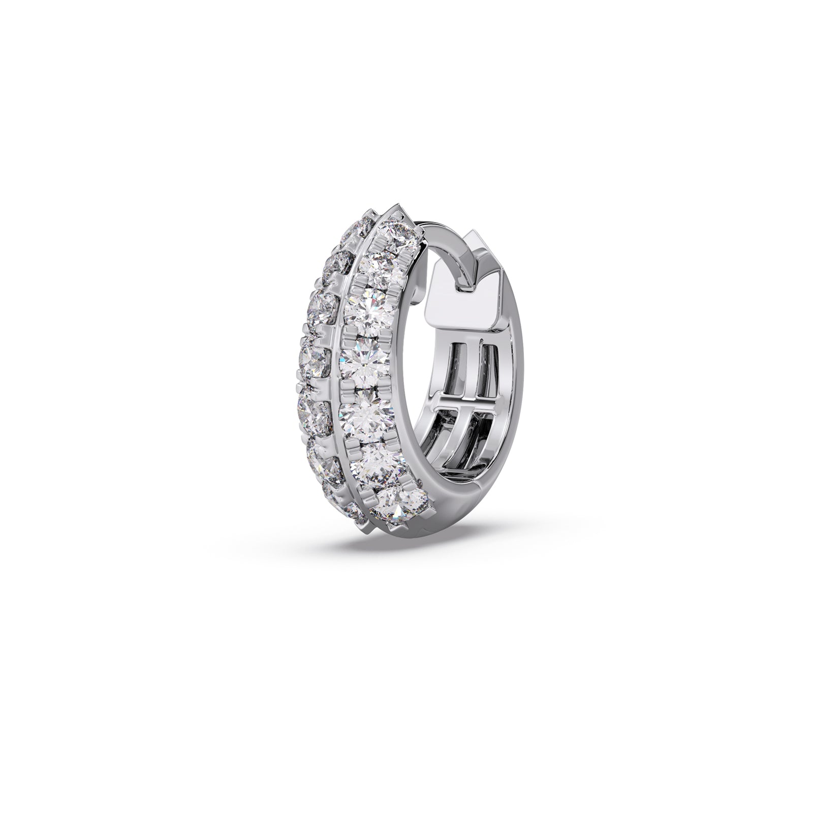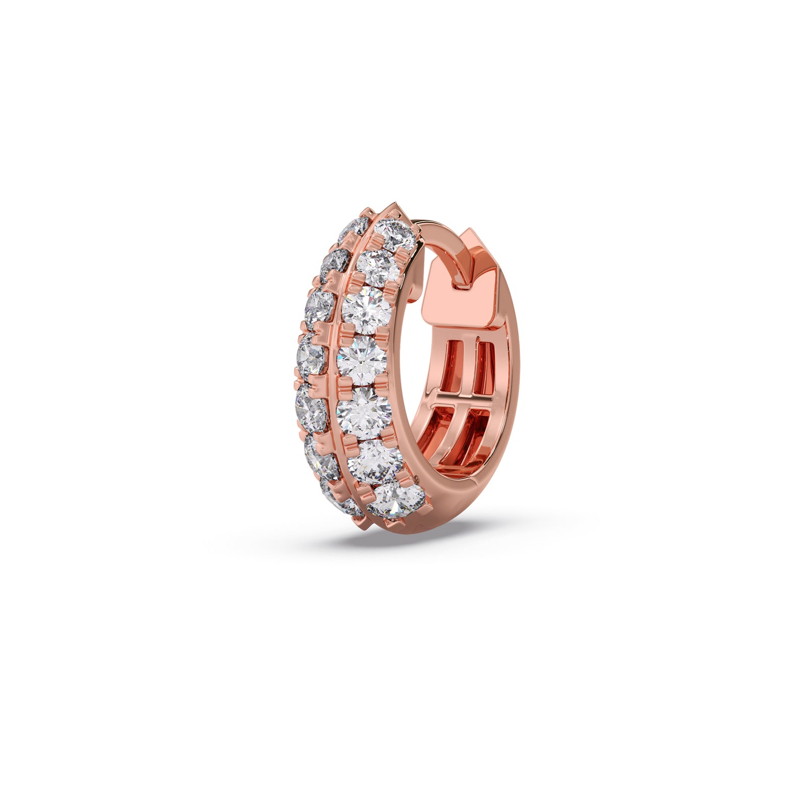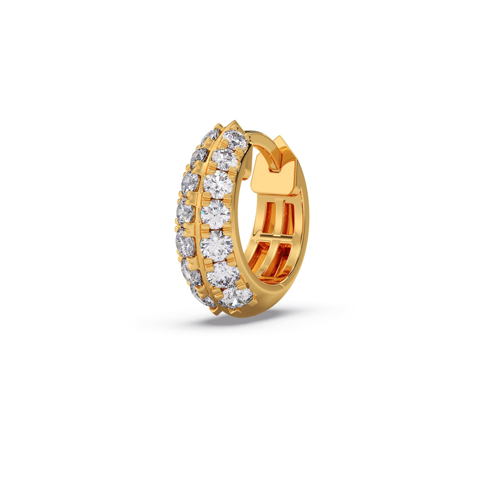 Experience luxurious sparkle with these two-row round diamond huggie earrings. The layered design creates a captivating and radiant look, adding a touch of glamour to your ear. Perfect for those who love a little extra brilliance.