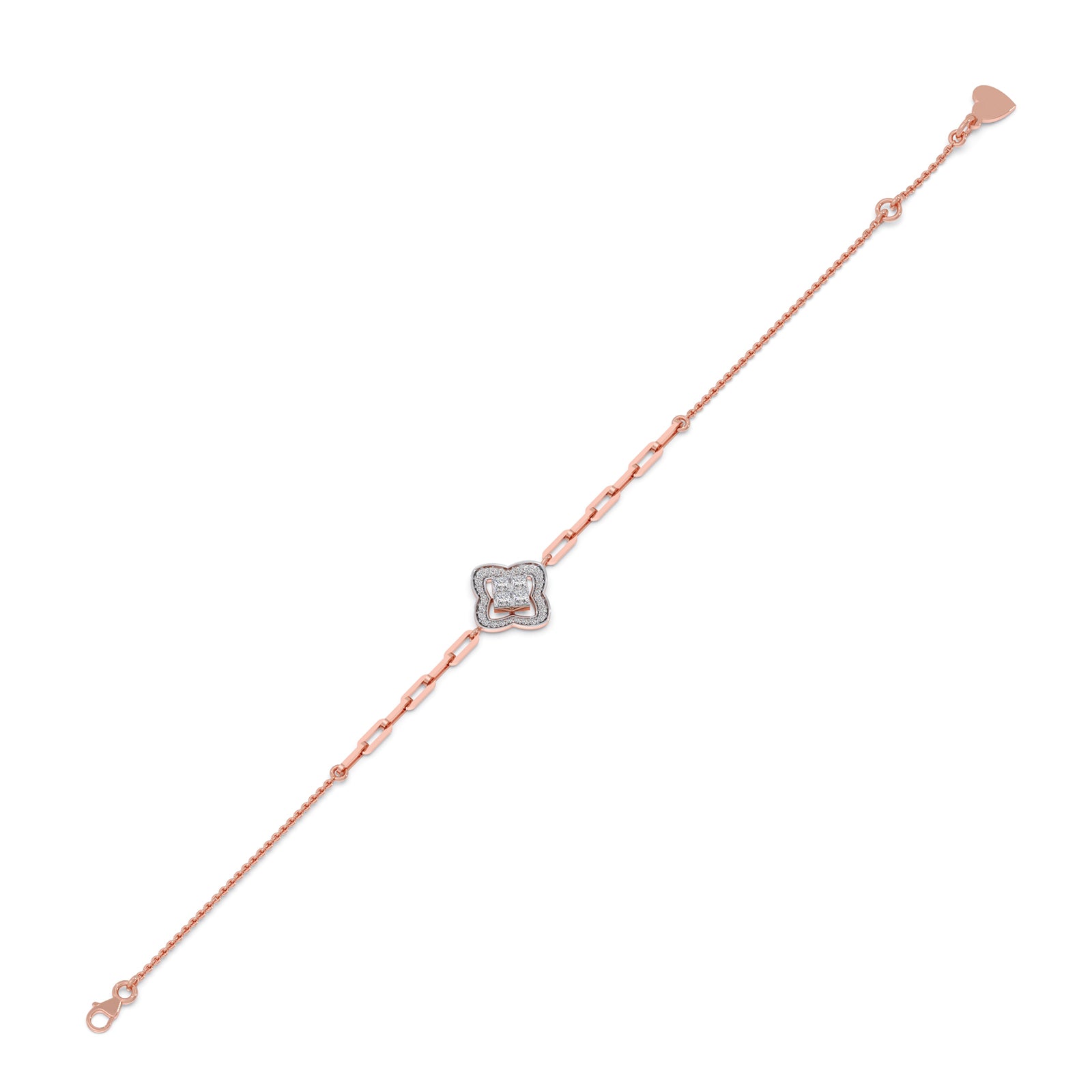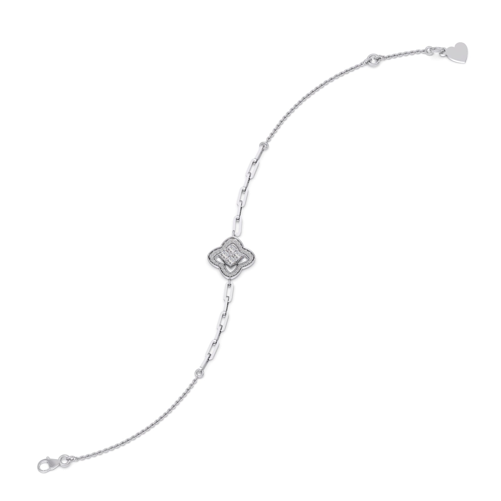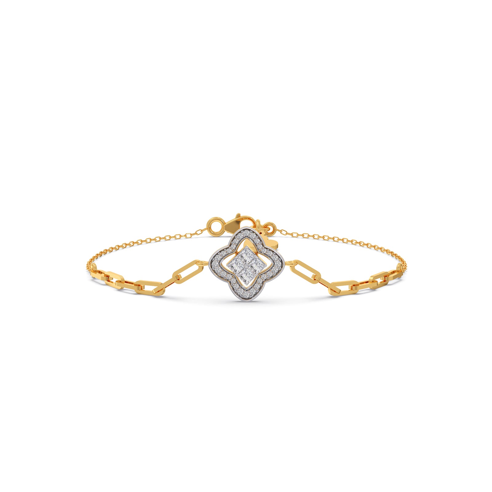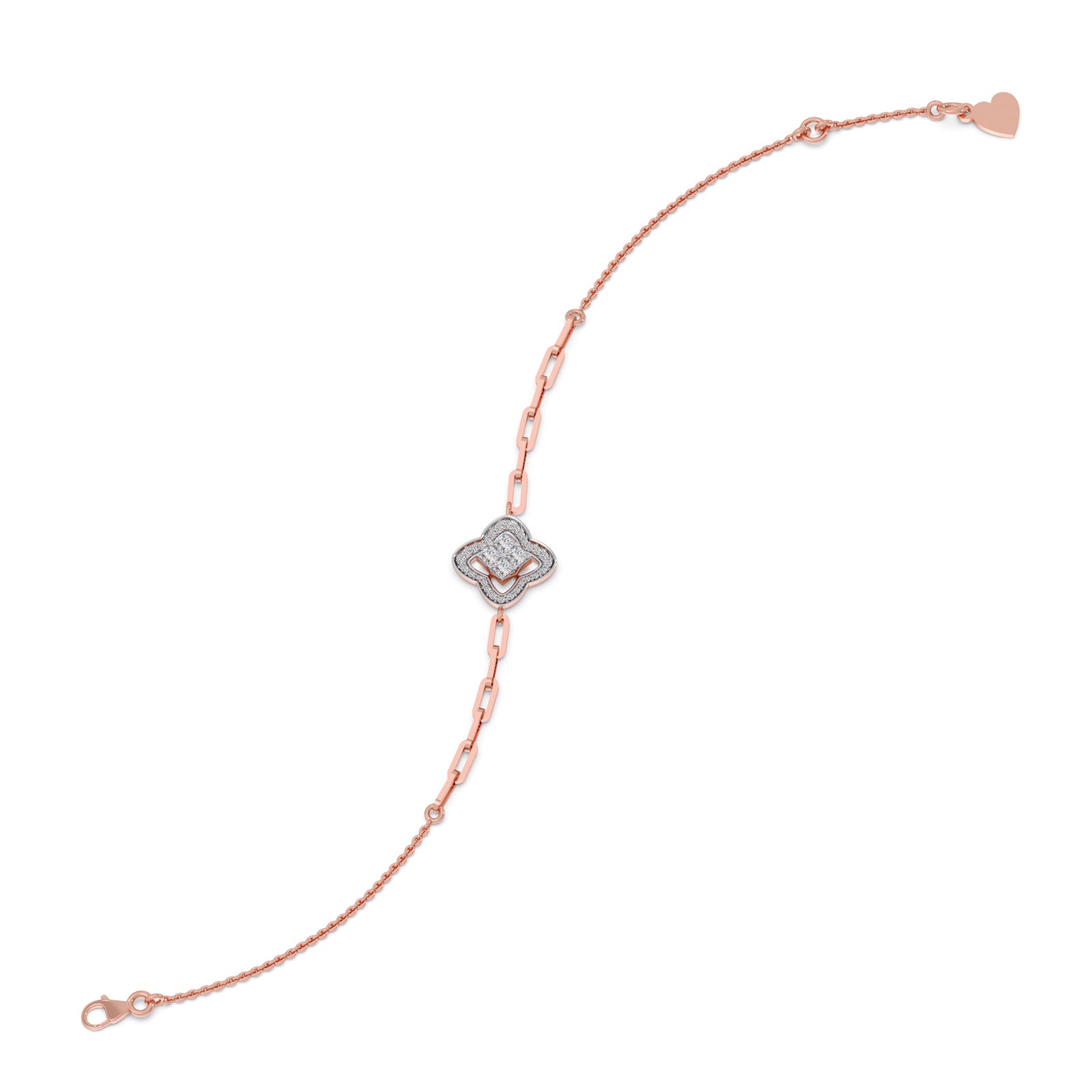 These pendant features a clover or four-lobed shape design, crafted in 0.656ct princess-cut diamonds and halo classic round diamonds. The pendant is adorned with paperclip gold Chain, making it an versatile enough for daily wear or any ocassions wear.