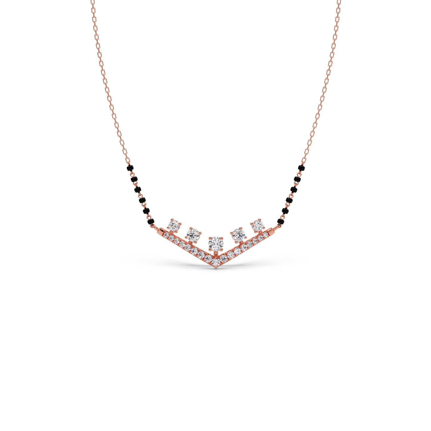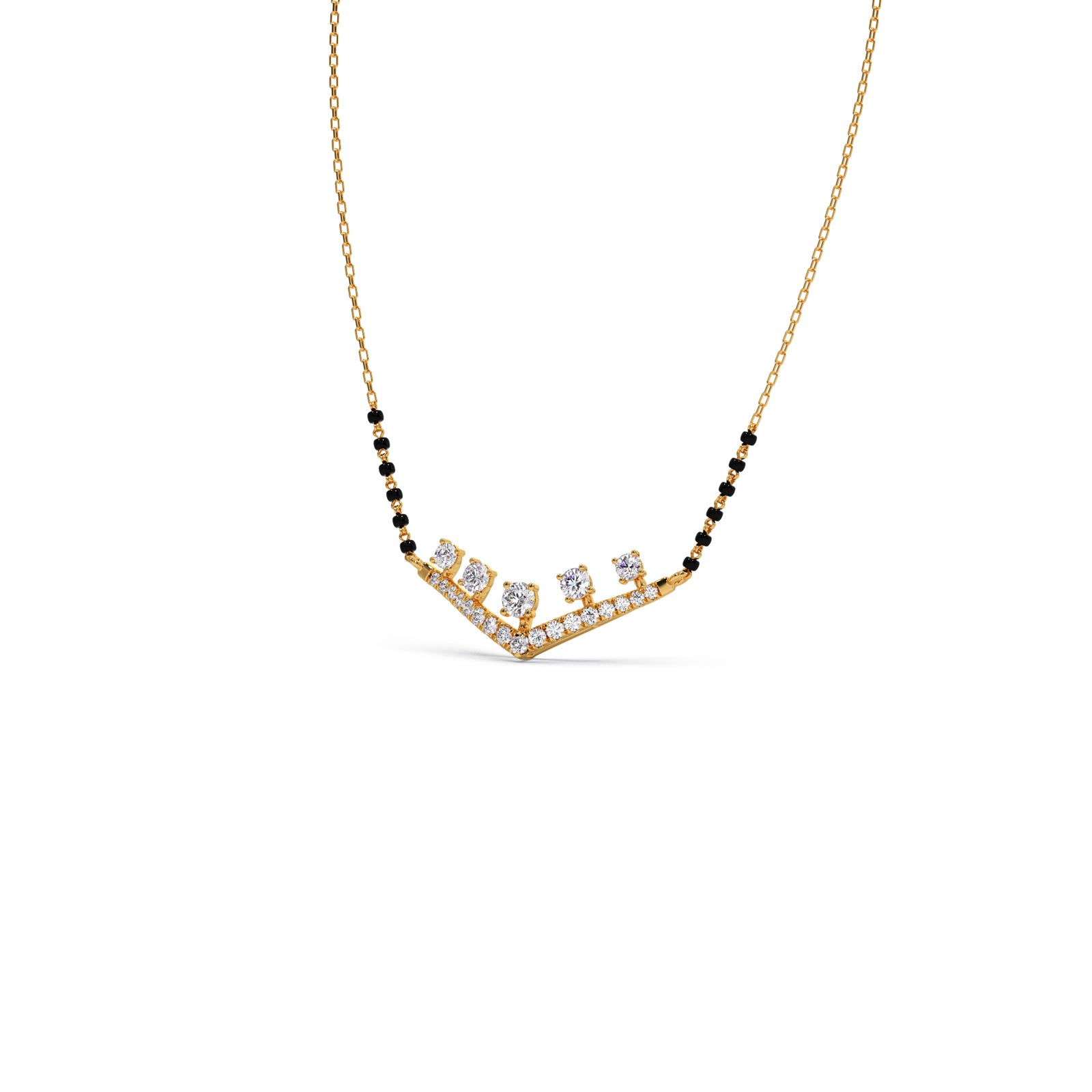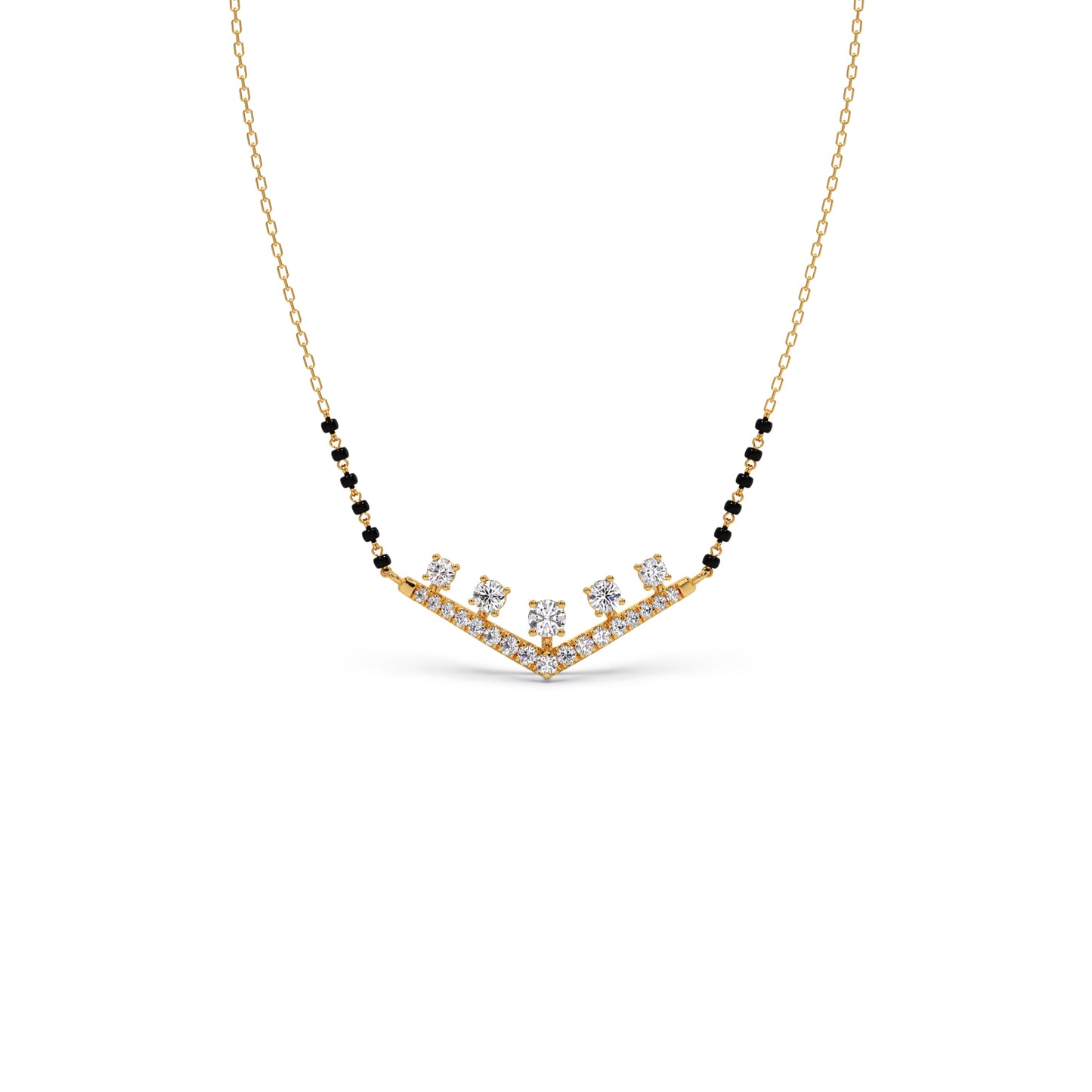 Celebrate your eternal bond with our "Vows of Brilliance" Mangalsutra. This contemporary design features a stunning V-shaped motif adorned with sparkling diamonds, beautifully integrated with traditional black beads. It's a radiant symbol of modern love rooted in cherished traditions, promising to illuminate your commitment with exceptional sparkle.