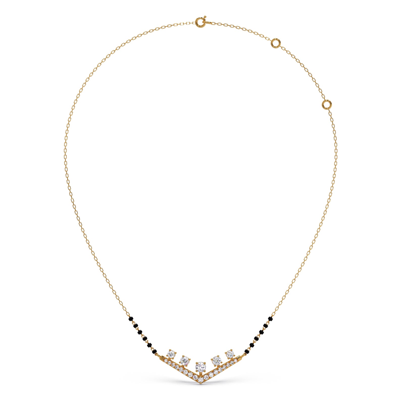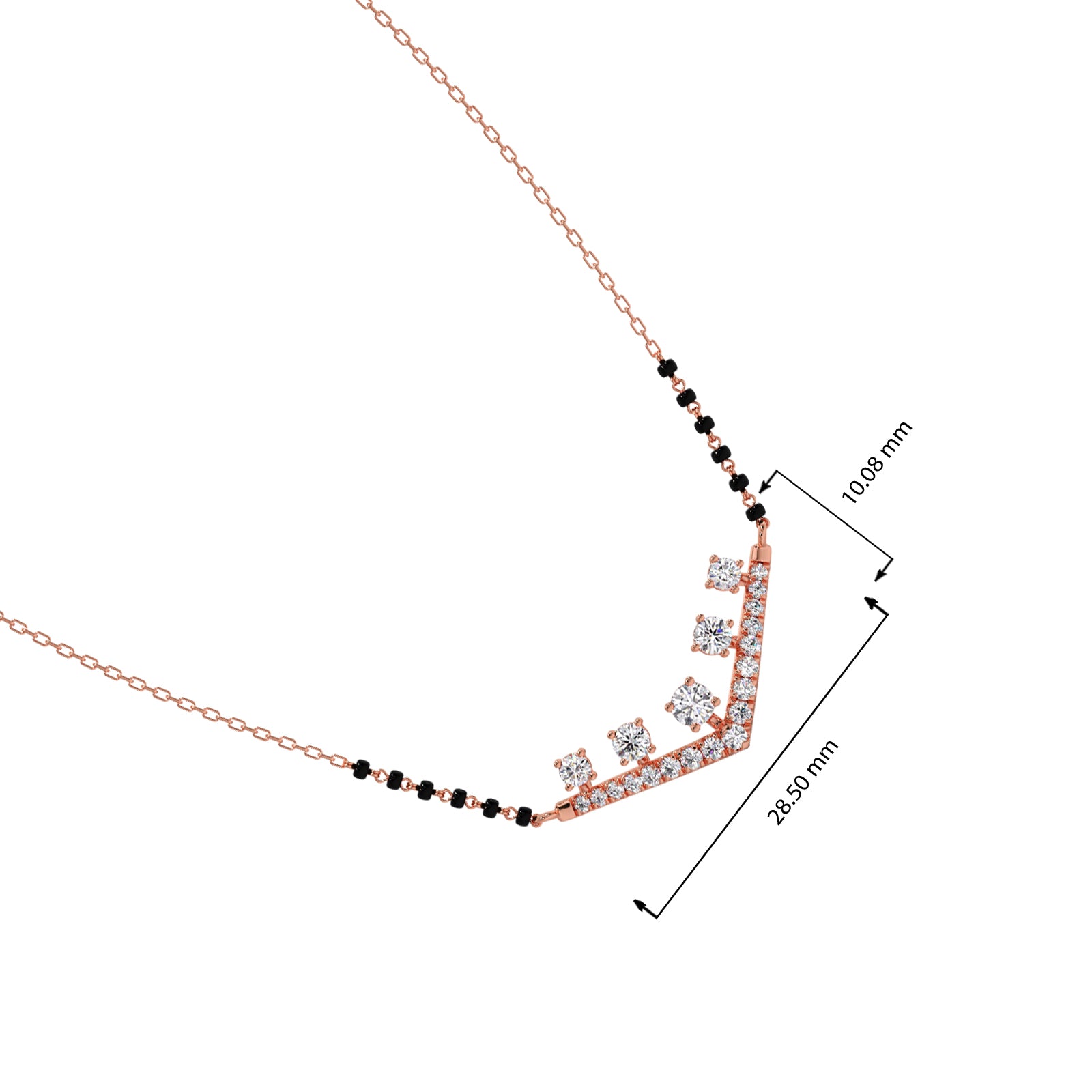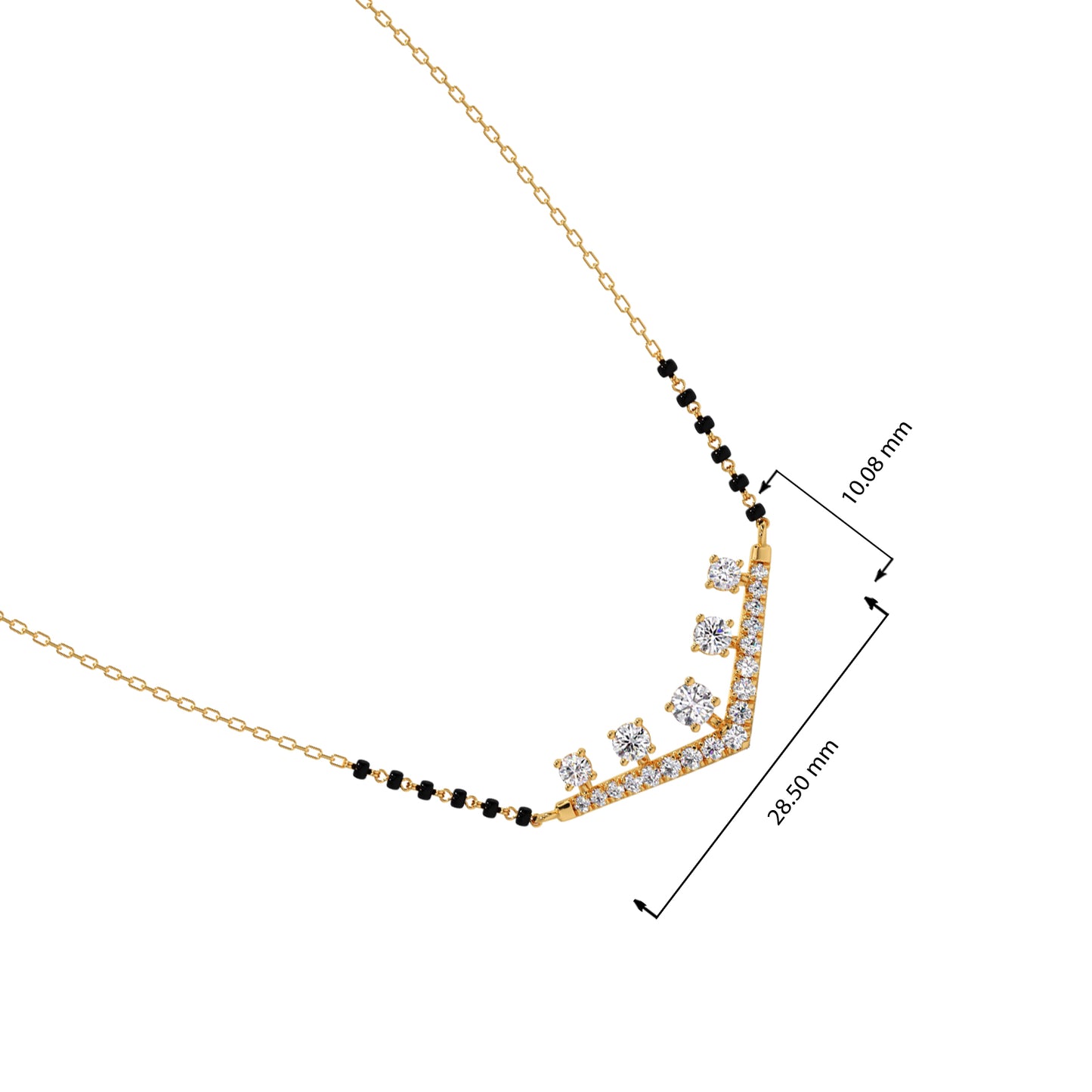 Celebrate your eternal bond with our "Vows of Brilliance" Mangalsutra. This contemporary design features a stunning V-shaped motif adorned with sparkling diamonds, beautifully integrated with traditional black beads. It's a radiant symbol of modern love rooted in cherished traditions, promising to illuminate your commitment with exceptional sparkle.